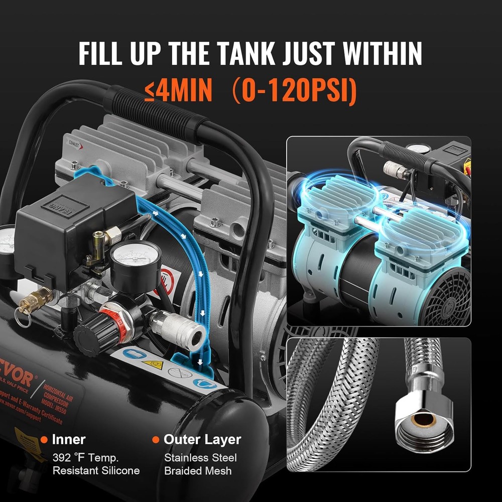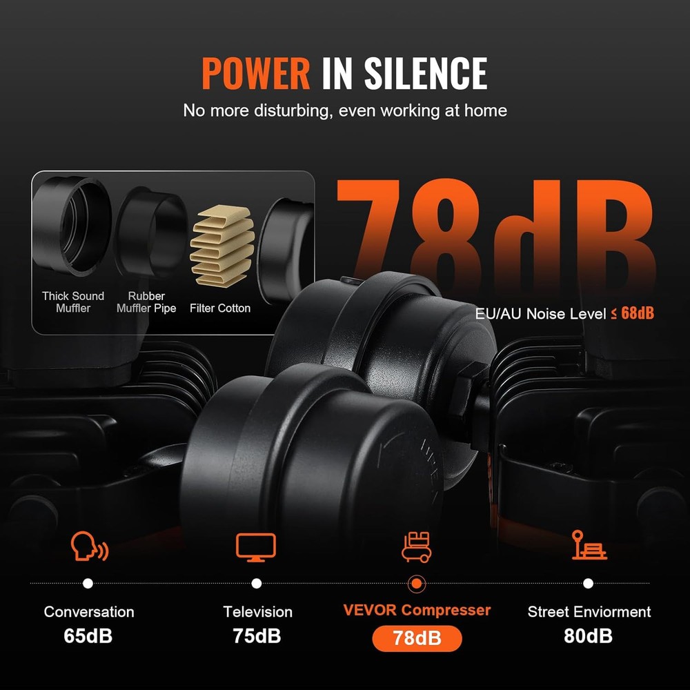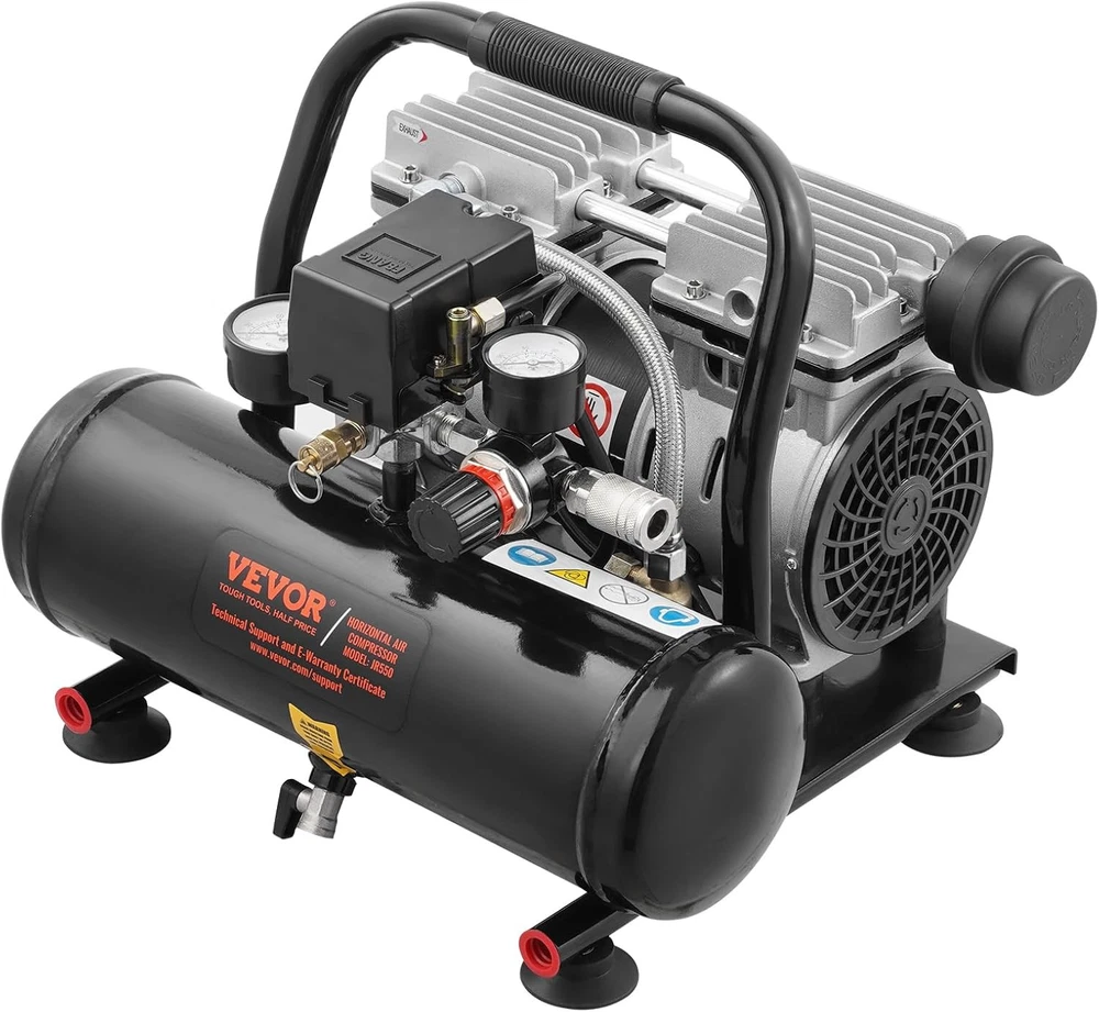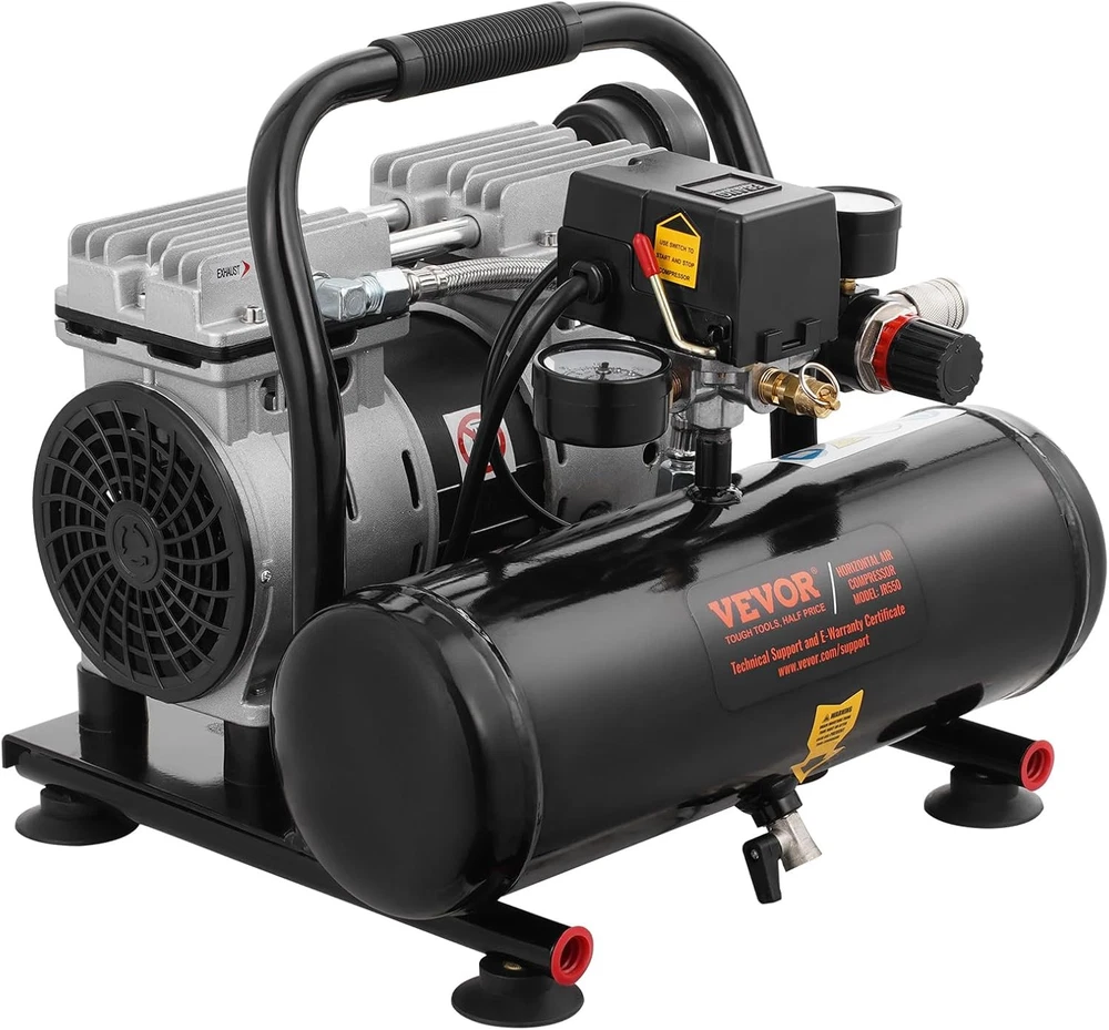 VEVOR Air Compressor, 1 Gallon Steel Tank, 1HP 1.5CFM @ 90PSI 1 Gallon, Black Product Features 1 Gallon Air Compressor: Our 1HP oil-free motor drives the compressor up to a speed of 1700 r/min and 1.5 CFM @ 90PSI air delivery. It is ideal for supporting a variety of pneumatic and air tools, such as nail gun, impact wrench, spray gun, pneumatic screwdriver, best for tire inflation, auto repair, spray painting, woodwork nailing, etc. (Voltage: 120V 60Hz) Fast and Efficient Inflation: Our oil-free air compressor adopts tube and cylinder intake, effectively saving time and effort. The intake pipe is made of high-temperature resistant silicone and stainless steel braided mesh, with double protection to reduce damage and corrosion. All the Power, Without the Noise: Our 78 dB low decibels ultra quiet air compressor is built with quality silencer. Each muffler consists of a thickened muffler cover, rubber muffler pipe, and filter cotton. It not only reduces noise, but effectively prevents fine dust from entering. Designed to Withstand: Our electrical air compressor is constructed from a 3-layer process: rust & wear-resistant layer, plastic powder attachment layer, and Q235B structural steel providing durability and ultimate rust resistance. Large bearing pressure and seamless welding construction ensure the ability to withstand explosions and leakages. Security Comes First: The air compressor tank is equipped with large cooling fan and automatic overheating protection to prevent damage. In addition, when the current or storage pressure is too high, the compressor will automatically shut off or provide pressure relief protection. Shipping: Shipping is complimentary within the lower 48 US States. We Do Not Ship to PO/APO Boxes, HI or Alaska We Do Not Ship Outside of the Continental US All items ship within 24-72 hours of Payment For large items that require Freight shipping a valid phone number is required to call and schedule your delivery Terms of Sale and Feedback: Feedback is extremely important to us and eBay If you are satisfied with our transaction, please take a moment to leave Positive Feedback. YOUR Satisfaction is our #1 Priority! If there are any issues, PLEASE contact us BEFORE leaving a neutral or negative rating so that we may resolve any concerns. We PROMISE we can make you happy if you give us a fair chance. Returns / Concerns: All items qualify for returns within 14 - 30 days of receipt. Buyer is responsible for return shipping on any item that is not damaged Please be sure this is an item you want before making your purchase. Customer Satisfaction is our TOP priority! All items are IN STOCK at time of listing. Inventory on eBay changes constantly and it is impossible to maintain a perfectly accurate count of all items. Please do not penalize us if we have to issue you a refund! Thank You For Your Business!