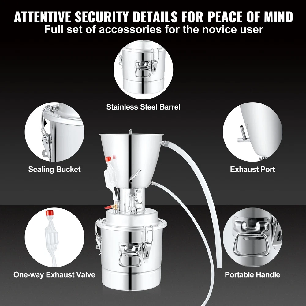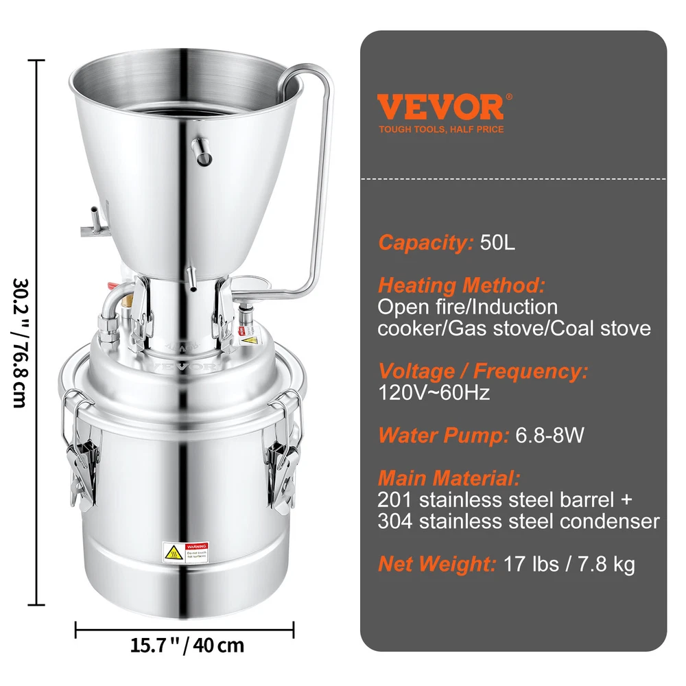 Document Product Description 50L Alcohol Water Distiller This set of alcohol stills is perfect for beginners and professionals alike. Using a more straightforward and efficient distillation method, with a coil 304 condenser design, even beginners can distill whisky, brandy, and a variety of fruit wines, water, and essential oils. Quick Cooling Purification Room Large Capacity Steam Out Heating Ways Distill You Want Water Essential Oil Crops Key Features Scientific Exhaust Valve Gas is discharged in one way without pollution. Accurate Thermometer Check the distillation status at any time. New Arched Lid Steam rises without clogging and speeds up wine production. Features & Details Professional Distillation Method: Through a series of procedures such as evaporation, purification, filtration, and condensation, you can distill more aromatic and exclusive wines, essential oils, etc. The 50L large capacity of the alcohol still allows you to distill more ingredients at a time. Updated Condensation Barrel: The condensation and purification are combined to exclude the head-level impurities. The tube on the moonshine still is smooth without wrinkles, and distilled liquor, water, and essential oil will not remain inside to avoid breeding fungus. Distilled spirits, essential oils, etc., can effectively avoid stringing. Food-grade Materials: The parts in contact with the ingredient are commercial food-grade materials so that you can use our alcohol still kit with confidence. 304 stainless steel is more durable and anti-corrosion, not easy to rust and damage, and does not produce copper green. If properly preserved, it can be used for many years. Effortless to Use: We have provided detailed assembly instructions, which can be quickly assembled and used in a few minutes. Silicone rings, sealing buckle, exhaust valve, thermometer, etc., are all equipped, which makes distillation very simple. Multipurpose Usage: You can make whisky, wine, vodka, distilled water, ethanol, and essential oil, and also ferment fruits and vegetables, and soybeans via our stainless steel alcohol distiller. The thickened bottom can be heated in various ways, including open fire, induction cooker, electric stoves, etc. People Who Bought This Item Also Bought VEVOR Commercial Slush Machine 3L x 2 Smoothie Maker Slushy Machine 2 x 0.79 Gal VEVOR 3 Pot 8Gal 30L Alcohol Distiller Moonshine Still Water Alcohol Distiller VEVOR 3 Pots 5 Gal Moonshine Still 20L Water Alcohol Distiller Copper Tube VEVOR 2 Pot 3 Gal 12L Moonshine Still Distillery Kit Water Alcohol Distiller VEVOR Alcohol Moonshine Still 5Gal/20L 2 Pot Water Distiller Home Wine Still Kit VEVOR Fruit Wine Press Juice Press for Cider Vegetables Cheese Tinctures 0.8 Gal VEVOR Commercial Slush Machine 3L Frozen Drink Machine Smoothie Maker 0.79 Gal VEVOR Commercial 3 Tanks 54L Frozen Juice Beverage Refrigerated Dispenser 350W VEVOR Alcohol Distiller 3Gal/12L Alcohol Still Home Brew Wine Making Kit 3 Pot VEVOR Fruit Wine Press Juice Press for Cider Vegetables Cheese Tinctures 5.5L VEVOR 18"X12" Outdoor/Indoor Drop-in Ice Chest Ice Cooler Ice Beer Bin Box 32QT VEVOR 18Gal Alcohol Water Distiller Home Brewing Equipment Moonshinestill 70L VEVOR Drop In Ice Chest Ice Bin 36"X18"X14" Patio Wine Cooler Stainless Steel Fully Automatic Sealing Machine 500-650 Cups/Hr Boba Bubble Tea Cup Sealer Black VEVOR Fruit Wine Press Manual Press for Wine Making 3.7Gal/14L Stainless Basket SHIPPING ABOUT US PAYMENT RETURNS CONTACT WARRANTY Welcome to our eBay store. As a leading and emerging company in manufacturer and exporting business, we are specialized in Business and Industrial Products, Sporting Goods, Pet Products, Home and Garden products for more than 10 years. We believe that it is our vision and mission to provide innovative products with best service and competitive price to satisfy you. Our goal is to make sure that you can find exactly what you are looking for and make it easy for you to place your orders. We accept PayPal payment,PayPal Credit,Credit card or debit card and so on. Payment should be completed within 4 (Four) days of auction closing. Or unpaid dispute will be filed for closing auction. We will leave a positive feedback immediately after payment is received. We appreciate a positive feedback as much as you do. If for some reason there is any issue with the purchase, please contact us prior to leaving feedback, we will be glad to work together and provide a satisfying solution. Please be aware that PO Box cannot receive items, please DO NOT fill in the PO Box address. DELIVERY DAYS: 3-7 BUSINESS DAYS 3 BUSINESS DAYS SHIPPING OUT SHIP FROM CA & TX & NJ & GA & NC &OR WAREHOUSE California Warehouse: City of Industry, CA Texas Warehouse : Houston, TX New Jersey Warehouse : Perth Amboy, NJ New York State Warehouse: Perth Amboy, NJ Georgia Warehouse: Austell,GA North Carolina Warehouse: Grove NC Oregon Warehouse: AIRPORT WAY Portland,OR All of our items are backed with a 30-day return policy. We ensure all our items are new and in excellent condition prior to shipping. In case you receive the item that is not to the standards above, please contact us via e-Bay messages. All returns must be in new original condition as received and should be shipped with delivery confirmation Please note that all returns must be pre-approved by us. Unauthorized returns will not be accepted. If you need to return, please check twice to confirm the item not work and contact our customer service representative, let us know the detailed problem and send us some pictures for confirmation. We ONLY accept returns with original package. Please make sure that item has NO man-made sabotage. Used items will not be accepted for return. Email Customer Support: 9:00am-2:00am PST Sunday-Friday All emails will be responded to within 12-24 hours This item comes with 12 months Warranty from the date of customers purchased it. Special circumstances will be listed clearly in the listing. If your item has been dam