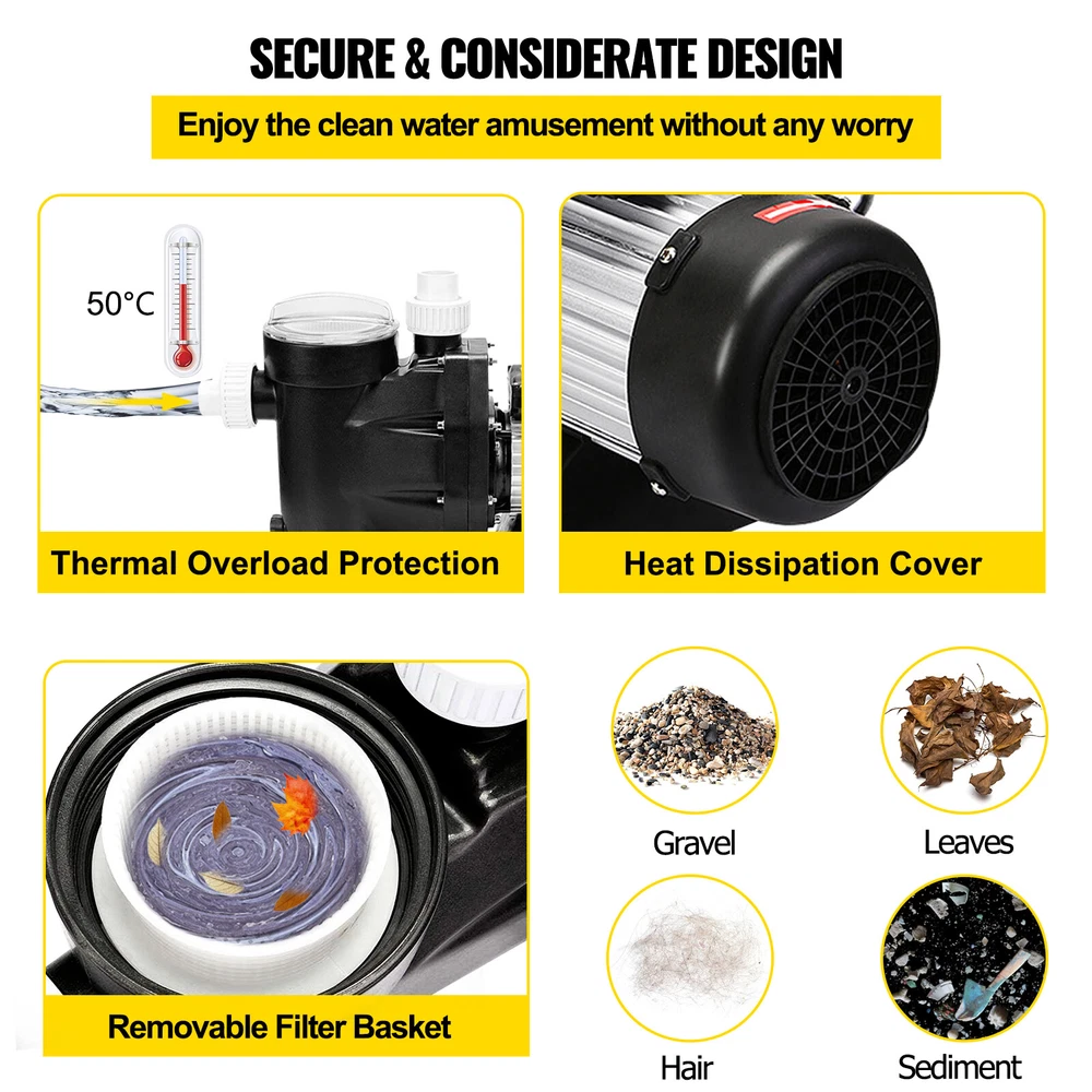 Document Product Description 2.5HP 1850W Swimming Pool Pump High-Efficiency Copper Motor & Security Design & Tested toStandards The swimming pool pump is equipped with a pure copper motor, high efficiency, and low noise, serving you for a long time. Furthermore, the pump shell is made of premium ABS and aluminum material, sturdy and corrosion-proof, without water leakage. In addition, , suitable for swimming pools, spas, bathing tubs, etc. Premium Swimming Pool Pump 2.5 HP Copper Motor Superior Performance Secure Design Tough Equipment & Tools, Pay Less VEVOR is a leading brand that specializes in equipment and tools. Along with thousands of motivated employees, VEVOR is dedicated to providing our customers with tough equipment & tools at incredibly low prices. Today, VEVOR's products are sold in more than 200 countries and regions with 10 million plus members worldwide. Why Choose VEVOR? Premium Tough Quality Incredibly Low Prices Fast & Secure Delivery 30-Day Free Returns 24/7 Attentive Service Key Features 1850W Copper Motor The pool pump adopts a pure copper motor to achieve high efficiency and long service time. Power: 1850W/ 2.5 HP, Voltage: 110V / 60Hz, Amps: 16 A, Capacitor: 25 F. High-Efficiency Performance Our pool pump is suitable for pools up to 100,000 liters, which can meet your daily needs. Max. Head Lift: 62.34 ft, Max. Flow: 560 L/m. It is certified with . Silent & Secure Design The pool pump will not disturb you when working; noise level: <65dB. In addition, there is a built-in thermal protector and automatic pressure control in the pump for secure operation. Removable Filter Basket The swimming pool pump features a detachable filter basket for filtering debris in the water, such as hairs, leaves, gravels, etc. So you can enjoy crystal limpid water fun and relax. Aluminum & ABS Casing The casing of the pump adopts solid ABS and aluminum material, sturdy and corrosion-proof. In addition, the housing is sealed by an industrial process without water leakage, keeping the motor and internal device intact. Versatile Uses The in-ground pool pump has a wide application for many occasions. For example, you can install it in a swimming pool, bathing pool, landscape pool, spa tub for efficient crystal clear water circulation. Specifications Model: SPP250A Power: 1850W/2.5HP Voltage: 110V / 60Hz Amps: 16 A Capacitor: 25 F Max. Flow: 560 L/m Max. Head Lift: 19 m / 62.34 ft IP55 INS CL.F: Max. 50 C Noise Level: <65dB Inlet: 1.5''/3.8 cm Internal Outlet: 1.5''/3.8 cm Internal Product Size: 25.6 x 6.7 x 13.4 in / 65 x 17 x 34 cm Weight: 22.5 lbs/10.2 kg Package Content 1 x Swimming Pool Pump 1 x User's Manual Features & Details Premium Swimming Pool Pump: The self-priming pool pump has brilliant performance with CE, FC certification. It is suitable for pools of up to 100,000 liters and can serve you for long time. 2.5 HP Copper Motor: The swimming pool pump is equipped with a pure copper motor for high efficiency, low noise, and long service time. The pool pump power: 1850W/2.5 HP, capacitance: 25 F, Amps: 16 A, voltage: 110V/60Hz, security rating: IP55. Superior Performance: The pool pump adopts an S-Tek flow system with a maximum head lift of 62.34 ft and a maximum flow rate of 560 L/min. In addition, the filter basket in the pump can effectively filter debris in the water to provide clean water, such as hair, leaves, gravels, etc. Secure Design: The housing of the pump is made of sturdy ABS and aluminum material, durable and corrosion-proof, preventing the motor and internal device from damage. Moreover, the pump is designed with a built-in thermal protector and automatic pressure control for security. Versatile Uses: The in-ground pool pump can be used on many occasions for providing high-efficiency water circulation and crystal clear water, such as swimming pool, bathing pool, landscaped pool, spa, etc. People Who Bought This Item Also Bought VEVOR Swimming Pool Pump Above Ground Pool Pump 2 HP 90 GPH w/ Strainer VEVOR 1.5HP Swimming Pool Pump Motor w/Strainer Generic Above Ground 1100W VEVOR Swimming Pool Pump Above Ground Pool Pump 1.5 HP 90 GPM w/ Strainer VEVOR Swimming Pool Pump Above Ground Pool Pump 2 HP 92 GPM w/ Strainer VEVOR Sand Filter Above Ground with 3/4HP Pool Pump 3000GPH Flow 14" 6-Way Valve VEVOR Swimming Pool Pump Above Ground Pool Pump 1.5 HP 88 GPH w/ Strainer VEVOR Sand Filter Above Ground with 1 HP Pool Pump 3500 GPH Flow 16" 6-Way Valve VEVOR Deep Well Pump 4" 1.5HP Submersible Pump Max 390' Head w/ 131 ft Cable VEVOR Macerator Disposal Pump Basement Macerator Pump 300W with 3 Water Inlets VEVOR 12V Water Pressure Diaphragm Pump Self-Priming Pump 70 PSI 5.5 GPM Boat Car VEVOR 1/2HP 4" Deep Well Pump Submersible Stainless Steel 164FT 25.5GPM 110V VEVOR 12V Water Pressure Diaphragm Pump Self-Priming Pump 55 PSI 3.5 GPM Boat RV VEVOR Sand Filter 16" Above Inground Swimming Pool Sand Filter with 7-Way Valve VEVOR 110V Water Pressure Diaphragm Pump Self-Priming Pump 45 PSI 3.3GPM Boat RV VEVOR Shallow Well Jet Pump 0.75 HP 18.5 GPM w/Pressure Switch Stainless Steel SHIPPING ABOUT US PAYMENT RETURNS CONTACT WARRANTY Welcome to our eBay store. As a leading and emerging company in manufacturer and exporting business, we are specialized in Business and Industrial Products, Sporting Goods, Pet Products, Home and Garden products for more than 10 years. We believe that it is our vision and mission to provide innovative products with best service and competitive price to satisfy you. Our goal is to make sure that you can find exactly what you are looking for and make it easy for you to place your orders. We accept PayPal payment,PayPal Credit,Credit card or debit card and so on. Payment should be completed within 4 (Four) days of auction closing. Or unpaid dispute will be filed for closing auction. We will leave a positive feedback immediately after payment is received. We appreciate a positive feedback as much as you do. If for some reason there is any issue with the 