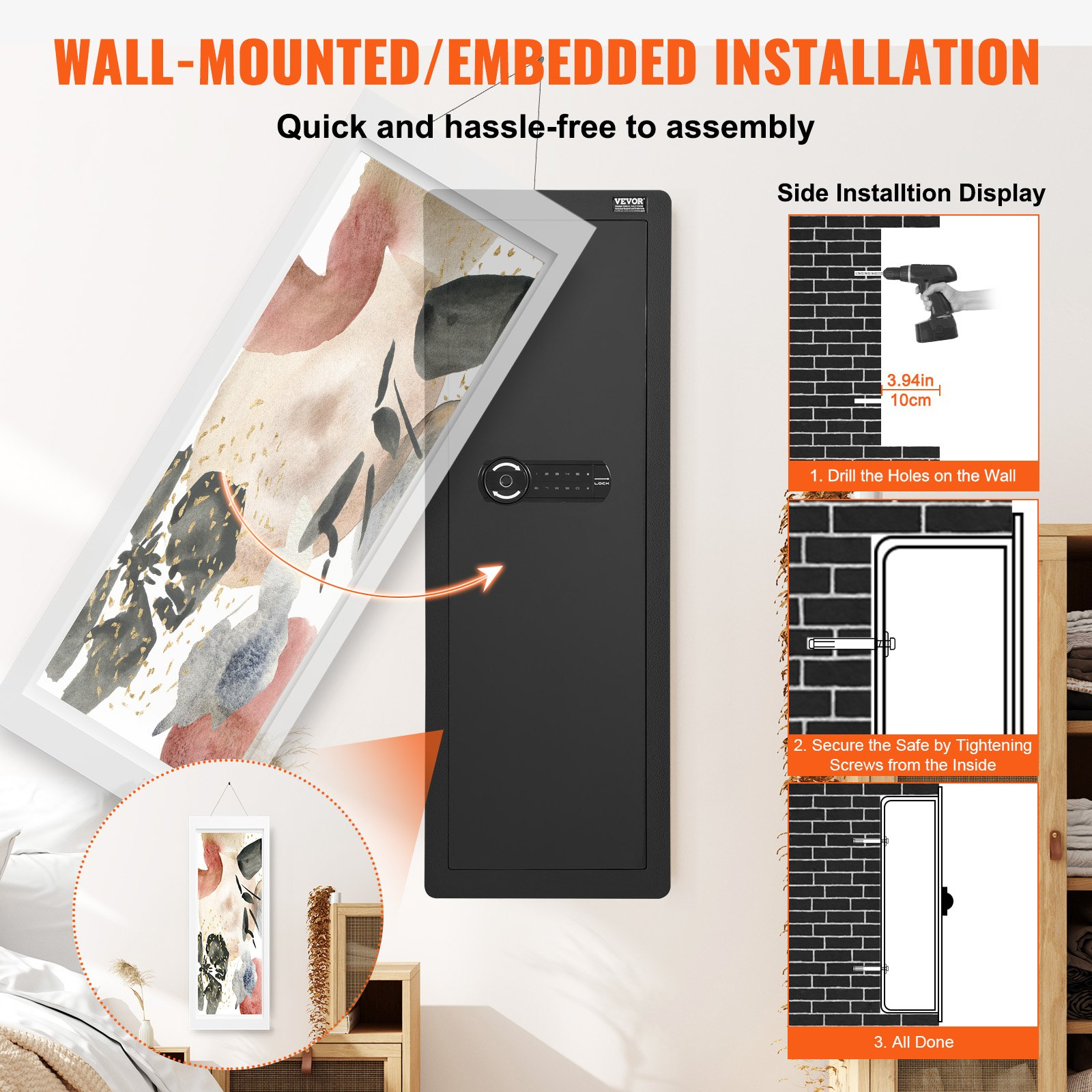 VEVOR 42.91" Tall Wall Gun Safe 4-Tier Hidden Gun Safe with Keypad & Fingerprint Advanced Encryption Technology Smart Locking System Superior Alloy Steel Material Concealed Wall-Mount Design Dual Alarm System Convenient and Easy to Use Interior Dimensions: 41.34 x 13.27 x 3.23 in / 1050 x 338 x 82 mm,Vibration Alarm: Included,Material: Q235 Cold-Rolled Steel,LED Lighting: Included,Door Thickness: 2.35 mm,Product Dimensions: 42.91 x 14.96 x 3.94 in / 1090 x 380 x 100 mm,Number of Shelves: 3,Lock Bolts: 2, Diameter: Φ22 x 30 mm,Key Hooks: 6,Capacity: 1.3 ft²,Shelves: 4,Gun Holder Dimensions: 5.12 x 5.12 in / 130 x 130 mm,Model: SS-1090QR,Wall Mounting Holes: 2 on Each Side, 4 on the Back,Product Weight: 36.24 lbs / 16.45 kg,Wall Thickness: 1.1 mm