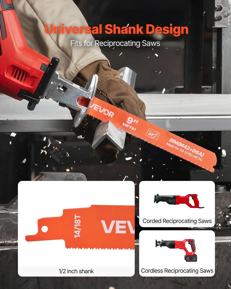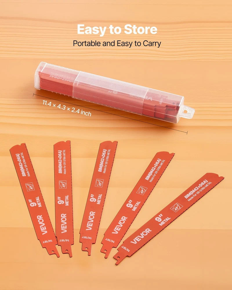 ●【Product Information】High-Quality BladesVersatile UseHardened MaterialWide CompatibilityPortable & Dust-ResistantProtective CoatingBlade Dimensions: 9.84 x 0.98 x 0.04 in / 230 x 25 x 1.1 mmSpecifications: 230 x 25 x 1.1 mm 14/18 TPI BIM (M42 + D6A)Blade Thickness: 0.043 inColor: OrangeItem Model Number: RSB-Metal-25Material: Bi-Metal (M42 + D6A)Piece Count: 25 PiecesApplication: For 1/8–5/16 inch Medium-Gauge MetalsNet Weight: 2.47 lbs / 1.12 kg ✅ 【Features】● Wide Application: Available in various specifications, these reciprocating saw blades are ideal for cutting metal materials such as pipes, steel sheets, and bolts. Ideal for daily metal cutting applications● Efficient Cutting: Sharp teeth combined with hardened material pro... VEVOR Reciprocating Saw Blades,25 Pack,14/18 TPI Bi-Metal Reciprocating Saw Blade Set with Universal Shank,Sharp Teeth for Fast and Smooth Cuts,for Cutting 1/8-5/16 inch Medium Metals,Orange ●【Product Information】 High-Quality Blades Versatile Use Hardened Material Wide Compatibility Portable & Dust-Resistant Protective Coating Blade Dimensions: 9.84 x 0.98 x 0.04 in / 230 x 25 x 1.1 mm Specifications: 230 x 25 x 1.1 mm 14/18 TPI BIM (M42 + D6A) Blade Thickness: 0.043 in Color: Orange Item Model Number: RSB-Metal-25 Material: Bi-Metal (M42 + D6A) Piece Count: 25 Pieces Application: For 1/8–5/16 inch Medium-Gauge Metals Net Weight: 2.47 lbs / 1.12 kg ✅ 【Features】 ● Wide Application: Available in various specifications, these reciprocating saw blades are ideal for cutting metal materials such as pipes, steel sheets, and bolts. Ideal for daily metal cutting applications ● Efficient Cutting: Sharp teeth combined with hardened material provide exceptional cutting performance and smooth edges, making the saw blades ideal for home repairs, outdoor tasks, DIY projects, and professional construction work ● Long-Lasting Durability: The metal cutting saw blades' thickness withstands high temperatures and wear during cutting, minimizing breakage risks. Special surface treatment further enhances the lifespan ● Easy to Use: No complex steps required for replacement. Simply swap out the old blade. The included transparent storage case keeps all bi-metal reciprocating saw blades organized and makes it easy to carry when working outdoors ● Strong Compatibility: The universal shank design ensures compatibility with various major reciprocating saws, including both corded and cordless models, making the bi metal blades versatile and easy to use Item Specifics Type Saw Blades Brand VEVOR Quantity 25 pcs About us Dear buyer, Thank you for visiting my store! Our warehouses are located in many regions around the United States. According to the customer's delivery address. Use USPS/UPS/DHL logistics transportation service. Prioritize the best quality logistics solutions to transport packages. Ensure package delivery time, At the same time. Have any after-sales problems, Feel free to contact us. At your service Payment PayPal is our preferred method of payments it's the quickest, easiest and most secure way to pay for your goods or services online. PayPal offers buyer and seller protection should there be a problem. If you do not have a PayPal account, to get started and buy your first item with us is very easy. Simply click on the 'Buy It Now' button and follow the eBay checkout steps. Select PayPal as the payment method you then will be given the chance to enter your card details in to PayPal's secure checkout in order to pay for your order. Shipping 1. Your purchase is shipped directly to you as soon as we have received your cleared payment. 2. Normally all of parcels would be shipped within 3days(From Monday to Saturday). 3. We will send information on eBay or email if the parcel was delayed due to our holiday. 4. We provide three kinds of shipping for choice. Shipping way depend on delivery address. Returns If an unit is received defective, of course we take it back or replace it. If the unit is received as expected, we must charge for our expenses if you want to send it back. We have to charge for the work of handling, retesting and restocking. DESCRIPTION PAYMENT SHIPPING RETURN POLICY CONTACT US Shop Category Store Home Home & Garden ◈ Tools ◈ Ride-Ons & Tricycles ▷ Furniture ♢ Sofa Art ◈ Paintings Other Hot Item New Moet & Chandon Champagne Tin Sign Metal Poster Wine Bar Pub Liquor Store USD 15.00 nel Retro Art Decoration for Home Club Cabin Garage Store Bar Cafe Farm 12" X 8" USD 15.77 Munsters Koach Comic Metal Tin Sign USD 15.77 Picture New List Item Help & Info Payment Policy Shipping Policy Return Policy FAQ About Us VEVOR Reciprocating Saw Blades,25 Pack,14/18 TPI Bi-Metal Reciprocating Saw Blade Set with Universal Shank,Sharp Teeth for Fast and Smooth Cuts,for Cutting 1/8-5/16 inch Medium Metals,Orange ●【Product Information】 High-Quality Blades Versatile Use Hardened Material Wide Compatibility Portable & Dust-Resistant Protective Coating Blade Dimensions: 9.84 x 0.98 x 0.04 in / 230 x 25 x 1.1 mm Specifications: 230 x 25 x 1.1 mm 14/18 TPI BIM (M42 + D6A) Blade Thickness: 0.043 in Color: Orange Item Model Number: RSB-Metal-25 Material: Bi-Metal (M42 + D6A) Piece Count: 25 Pieces Application: For 1/8–5/16 inch Medium-Gauge Metals Net Weight: 2.47 lbs / 1.12 kg ✅ 【Features】 ● Wide Application: Available in various specifications, these reciprocating saw blades are ideal for cutting metal materials such as pipes, steel sheets, and bolts. Ideal for daily metal cutting applications ● Efficient Cutting: Sharp teeth combined with hardened material provide exceptional cutting performance and smooth edges, making the saw blades ideal for home repairs, outdoor tasks, DIY projects, and professional construction work ● Long-Lasting Durability: The metal cutting saw blades' thickness withstands high temperatures and wear during cutting, minimizing breakage risks. Special surface treatment further enhances the