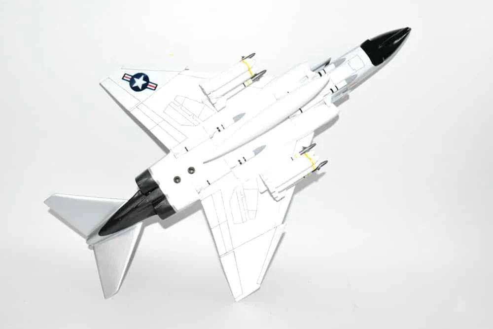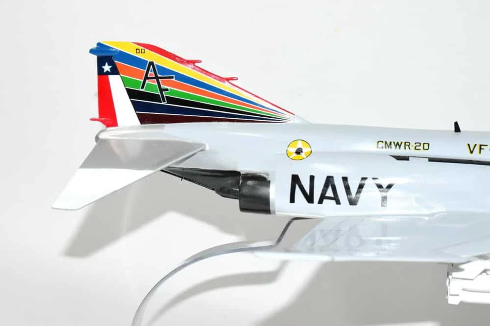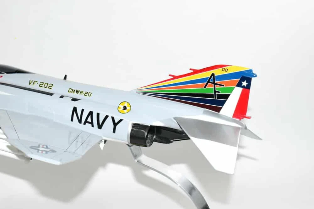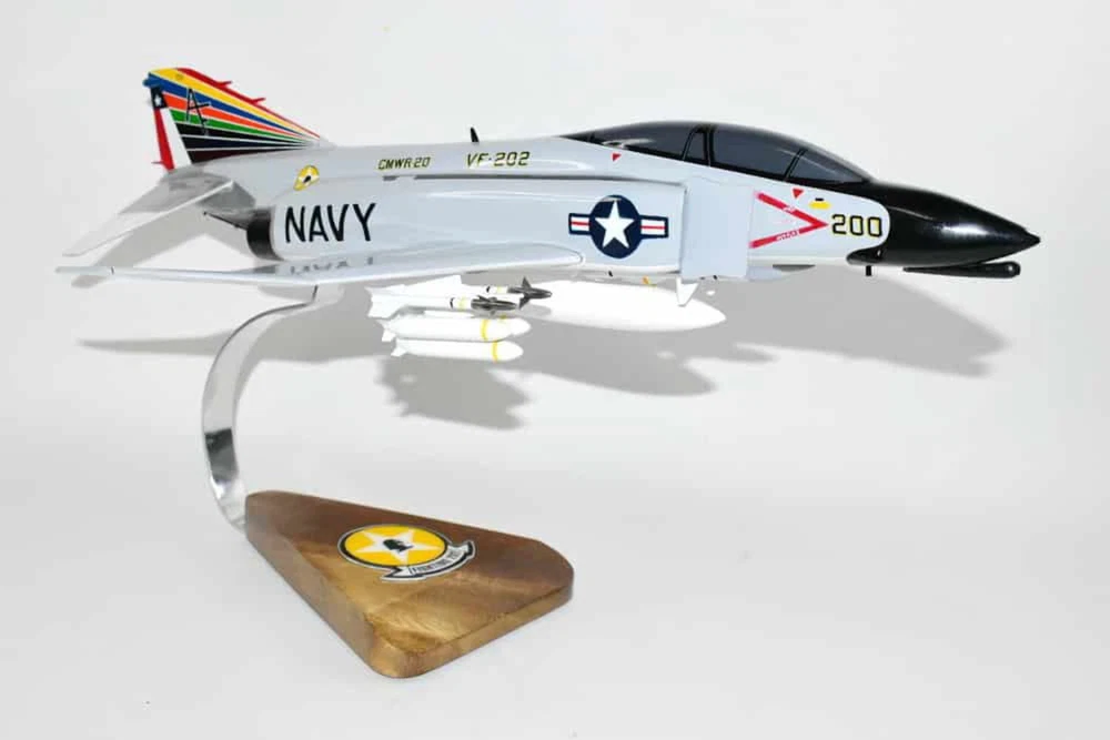 VF-202 Superheats F-4n (1977) Model Fly with the Superheats of the VF-202 in this handcrafted F-4b with livery from 1977. Each piece is carved from wood and hand painted to provide a piece you'll love. Length - 18 inches Made from Mahogany US Veteran Owned Business The product is not intended to be used by children 12 years and younger. Fighter Squadron 202 (VF-202) nicknamed the Superheats was an aviation unit of the United States Naval Reserve initially based at Naval Air Station Dallas, Texas. Following that installation's BRAC-directed closure, the squadron relocated to nearby former Carswell Air Force Base, which was transferred to U.S. Navy control pursuant BRAC action and renamed Naval Air Station Joint Reserve Base Fort Worth / Carswell Field. VF-202 was established on 1 July 1970 as part of Reserve Carrier Air Wing 20 (CVWR-20), the U.S. Atlantic Fleet's reserve carrier air wing, and disestablished on 31 December 1994.[1] During its service VF-202 could be identified by the tail code "AF" and nose numbers (MODEX) "200" through "213." VF-202 was established on the 1 July 1970 out of Naval Reserve fighter squadron VF-53D2, this as part of a total revamping of the Naval Air Reserve following problems with the callup of Naval Reserve tactical aviation squadrons during the Pueblo crisis of 1968. This led to an effort to have carrier-based squadrons of the Naval Air Reserve mirror the active duty Regular Navy, with all Naval Reserve carrier aviation squadrons organized into two Reserve Carrier Air Wings (CVWR). VF-202 first flew the Vought F-8H Crusader and transitioned to the F-4N Phantom II in 1976. In the 1980s, the squadron subsequently transitioned to the F-4S Phantom II In 1987, VF-202 transitioned to new-build Block 110 versions of the F-14A Tomcat, the last F-14A version built, receiving their first aircraft on 27 March 1987. Due to the squadron's reserve status, the transition took longer than for an active unit, not being concluded until May 1988, when VF-202 carrier qualified with the F-14 aboard USS America. VF-202 was equipped with two TARPS-capable aircraft giving the squadron an extra task after the RA-5C Vigilante and RF-8G Crusader had been phased out of service. As a TARPS unit, 1988 saw the squadron take part in the Reconnaissance Air Meet at Bergstrom Air Force Base, Texas, along with several other F-14 squadrons, including the Pacific Fleet Replacement Squadron, VF-124. Even with the force reduction after the end of the Cold War and continuing budget cuts, one would have expected that the TARPS capable squadron would not be disestablished. However, it was decided to disestablish VF-202 and make their F-14 sister squadron, VF-201, TARPS capable. VF-202 was accordingly disestablished on 31 December 1994 and its aircraft redistributed to active duty F-14 squadrons, primarily the formerly Atlantic Fleet, and now sole F-14 Fleet Replacement Squadron, VF-101 at NAS Oceana, Virginia.