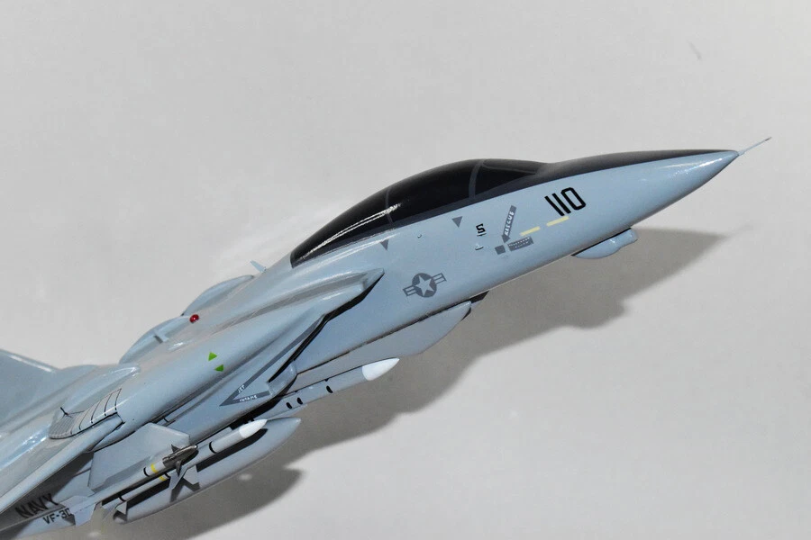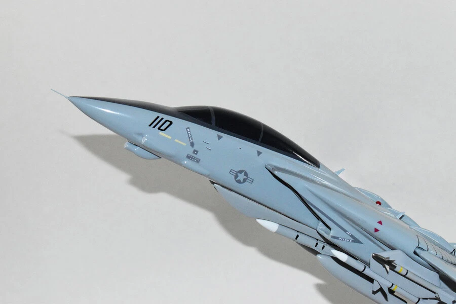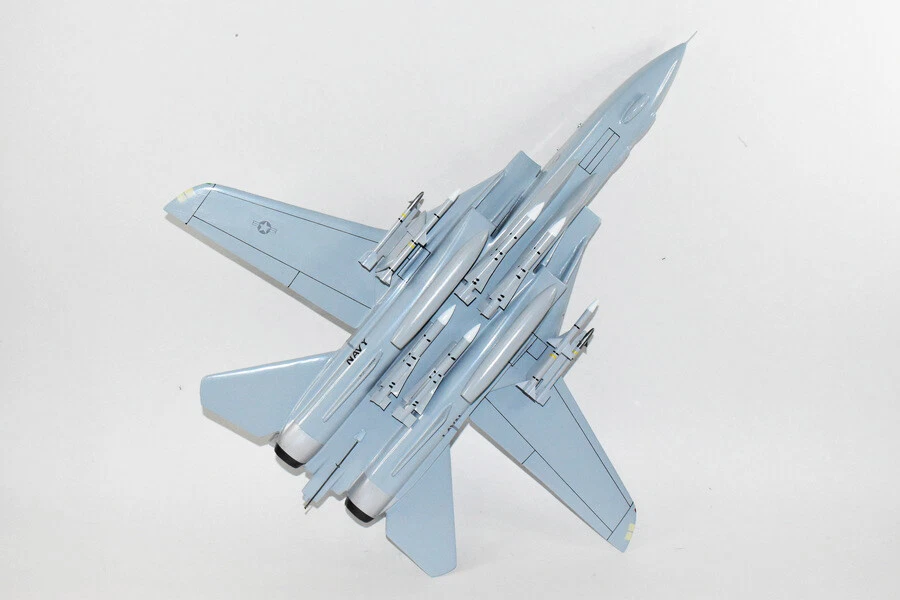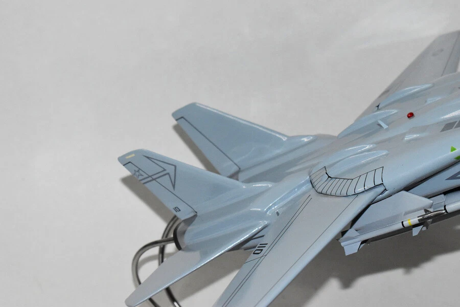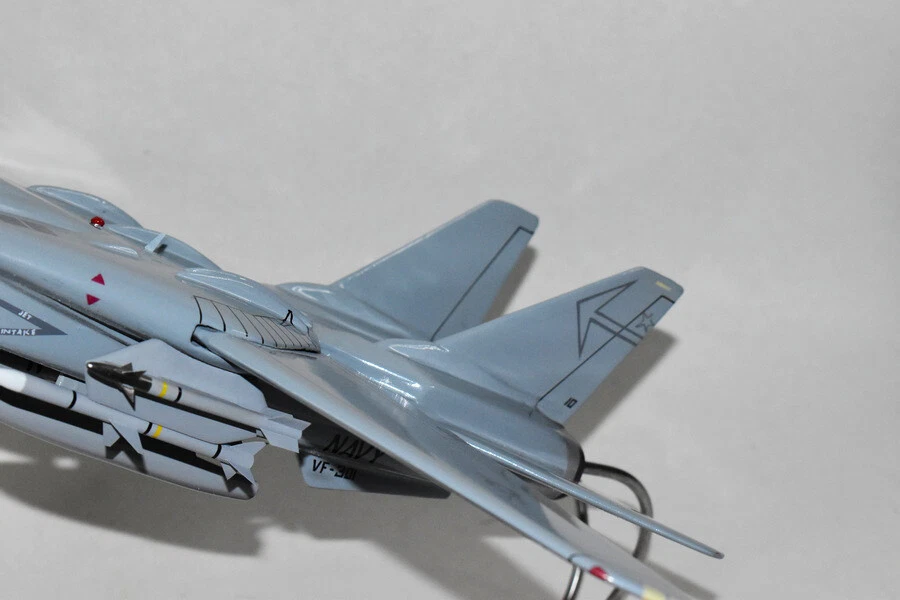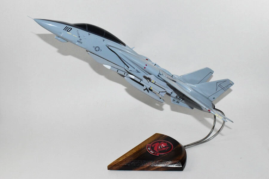 VF-301 Devil's Disciples F-14a Model A beautifully carved 18-inch solid wood F-14 Tomcat with moveable swept wings of the VF-301 Devil's Disciples! Master craftsmen carefully carve each model and then meticulously paint to give a perfect piece of art! Length - 18 inches Made from Mahogany US Veteran Owned Business The product is not intended to be used by children 12 years and younger. Model has wings that move. It is made of solid wood. VF-301 was activated on 1 October 1970 and assigned to Carrier Air Wing Reserve 30 (CVWR-30) (tail code "ND") at Naval Air Station Miramar, California (USA). The squadron first flew the F-8L Crusader and later transitioned to the F-4B Phantom in 1974. Their time with the B-models was short and VF-301 soon received the F-4N in February 1975. In 1980, VF-301 received the most advanced F-4 variant in the U.S. Navy, the F-4S. In October 1984 the unit transitioned to the F-14A Tomcat. The squadron made its first deployment with the F-14A on 21 April 1985, with five aircraft visiting MCAS Yuma, Arizona for air-to-air training against U.S. Marine Corps F-21A Kfir fighters of Marine Fighter Training Squadron 401 (VMFT-401). At this time, the squadron was still transitioning to the F-14 and it was not until 4 August the same year the entire squadron was able to deploy to NAS Fallon, Nevada for air wing training. The Devil's Disciples first carrier landings were on board the USS Ranger. Further carrier training was limited but did include time on board the USS Enterprise between 10 and 22 August 1988. Later in its life the squadron became the first Naval Air Reserve squadron to drop air-to-ground ordnance, specifically Mk 84 bombs and Mk 20 cluster munitions. After 24 years of service VF-301 was disestablished on 11 September 1994, the same time as sister squadron VF-302, due to post-Cold War budget cuts where the Navy opted to sacrifice Reserve F-14 squadrons to keep Regular Navy F-14 squadrons operating. Deactivation of the rest of CVWR-30 was soon to follow. During these 24 years VF-301 had acquired an outstanding safety record, flying 71,322.4 hours without a Class A mishap, setting a new record for Navy tactical jet squadrons.