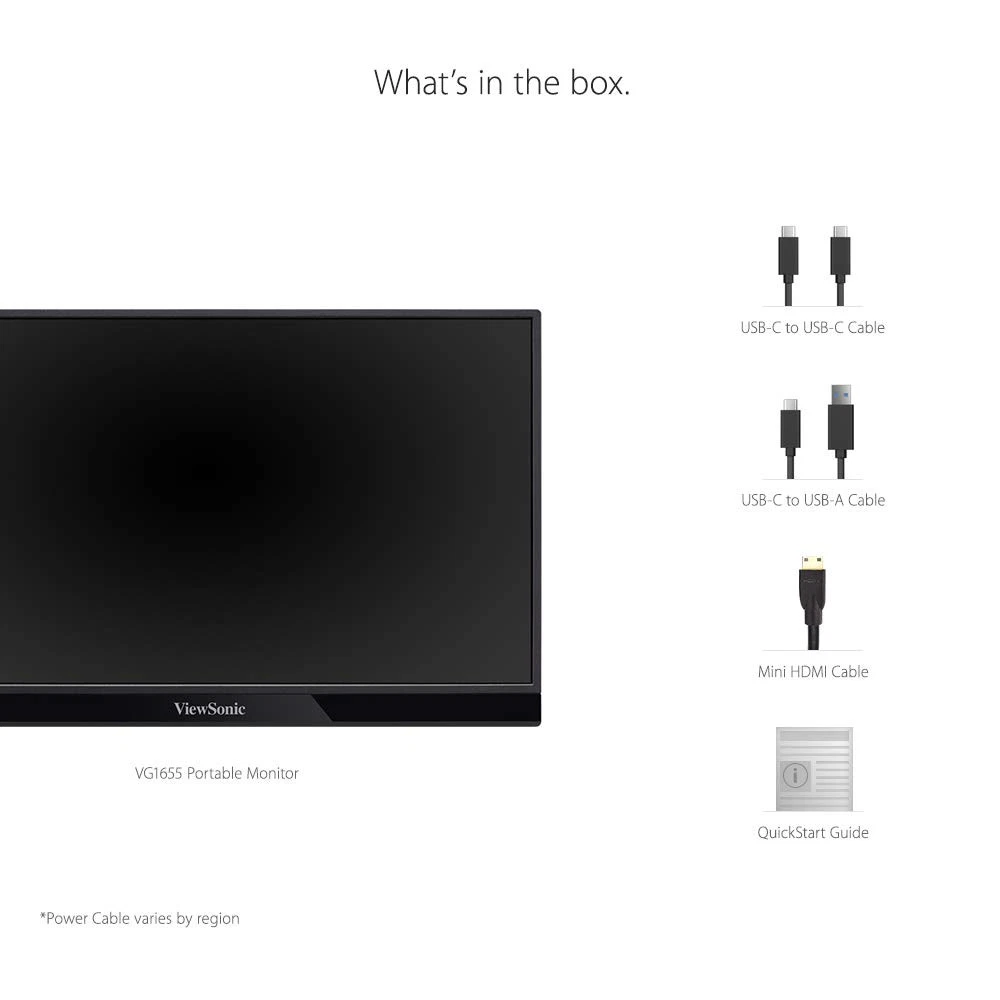 The VG1655 is a portable 15.6” monitor designed for productivity on the go. Built for business travelers, remote workers, and digital nomads, the VG1655 can serve as a complementary screen to a laptop or tablet for boosted productivity. Enjoy endless entertainment and gaming on-the-go by connecting the VG1655 to your favorite console via HDMI or USB-C. With an anti-glare screen and Full HD 1080p resolution, this monitor delivers a crystal-clear viewing experience so users can see more and do more for a more efficient workflow. A USB Type-C port enables quick and easy transmission of video, and audio. A second USB Type-C port also delivers up to 60W of two-way power: a connected laptop can power the VG1655, OR the VG1655 can power a connected laptop via a USB-C power bank or AC adapter and outlet. Measuring less than an inch thick and weighing under two pounds, the ultra-slim VG1655 perfectly fits into any bag, briefcase, or backpack so you can work wherever life takes you. ULTRA-PORTABLE MONITOR: 15.6 Inch Full HD (1920x1080p) IPS portable monitor with a premium aluminum design, and a 60Hz refresh rate SMALL AND COMPACT: With a weight of 1.8 lbs and a thickness of 0.6 in, this portable monitor is easy to take on the go for added screen real estate LESS CABLE CLUTTER: USB-C connectivity for fast data, audio and video transfer, and 60W charging over one cable, or passthrough power when using the included power adapter STAND COVER & SCREEN PROTECTOR: Comes with a detachable magnetic screen cover and a built-in stand for orientation in both portrait and landscape modes INDUSTRY-LEADING WARRANTY: 3-year coverage with access to our US-based customer service team