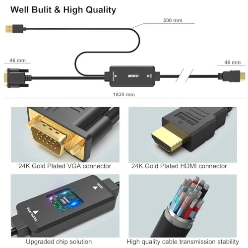 Return Policy Fast Delivery Trusted seller VGA to HDMI Cable with Audio, 6 Feet 1080P Cable from VGA Computer/Laptop to HDMI Monitor/TV(Not Bidirectional) Product Description VGA SOURCE to HDMI MONITOR - The VGA Source to HDMI cable is a Analog to Digital solution, connects a computer, desktop, laptop, or other 【devices with VGA port】 to a 【monitor, projector with HDMI port】; Attention: the VGA to HDMI conversion is unidirectional, from VGA Source to HDMI Monitor, it doesn't work from HDMI Source to VGA Monitor USB AUDIO SUPPORT - with an integrated USB cable that embeds the audio along with the video over HDMI; Digital USB audio can be configured from the Sound menu in Windows to output the audio to the connected display INCREDIBLE PERFORMANCE - The VGA-HDMI adapter supports resolutions up to 1920x108060Hz (1080p Full HD) including 720p, 1600x1200, 1280x1024 for high-definition monitors or projectors; Gold plated HDMI/VGA connector resists corrosion and abrasion and improve the signal transmission performance; Molded strain relief increases cable durability HOW to USE - the USB slot of the adapter should be plugged into computer's USB slot to transmit audio to the HDMI monitor 18 MONTH WARRANTY - Exclusive Unconditional 18-month ensures long-time satisfaction of your purchase; Friendly and easy-to-reach customer service to solve your problems timely Shipping Returns Payment Shipping Shipping is FREE to all addresses other than APO/PO boxes in the lower 48 states. All our stock ships from US-based warehouses. Shipped via USPS or UPS (depending on location and package weight) Unless stated otherwise, all orders will ship within 24-72 hours of your payment being processed. Check our feedback to see the great reviews of FAST shipping we offer. Returns Seller does not accept returns Payment We currently accept payment via eBay managed payments only. Once payment is cleared, we will dispatch your shipment within 1-3 business days. Please refer to the "Shipping" tab for more information regarding shipping speed to your destination.