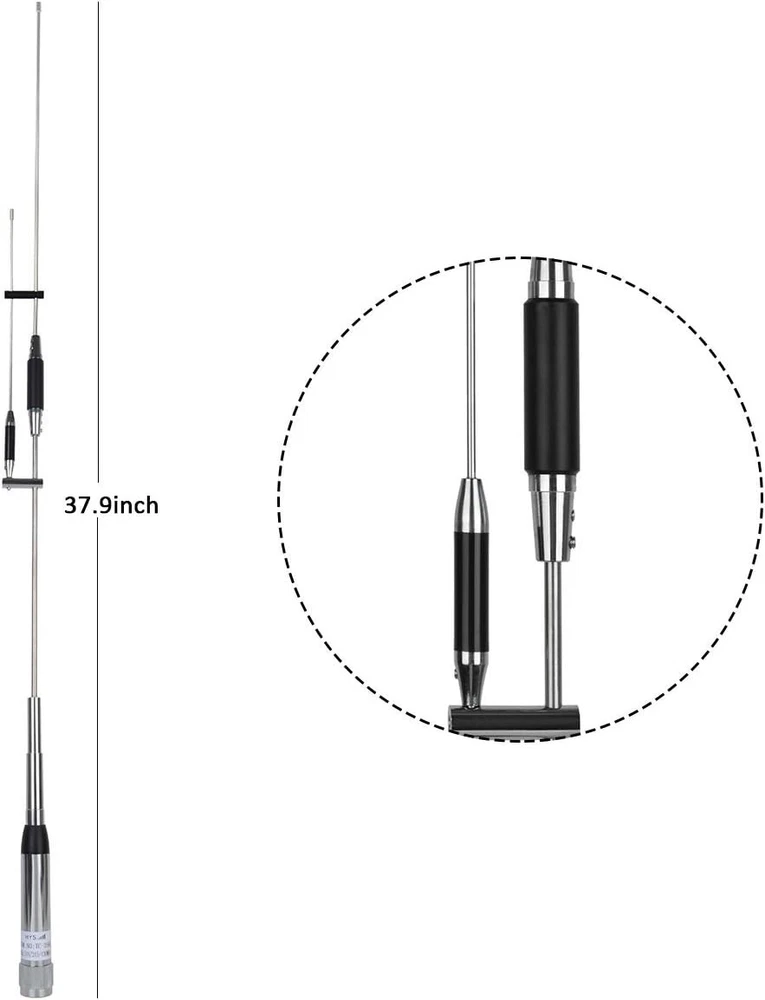 VHF UHF Mult-Band Mobile Radio 2 Meter & 70cm Antenna Inch 144/245/430Mhz Whip Antenna for Baofeng Anytone Kenwood TYT Mobile Radios FrequencyRange: 144/245/430Mhz;Gain Maximum Power Input-watts :100W (FM). Connector:SL-16 male(UHF MALE); Height:965±5 MM. Radiating Element Material:Stainless Steel. Mobile radio antenna working for 144/245/430Mhz mobile car radio, such as Kenwood Motorola, AnyTone, BaoFeng, Wouxun.