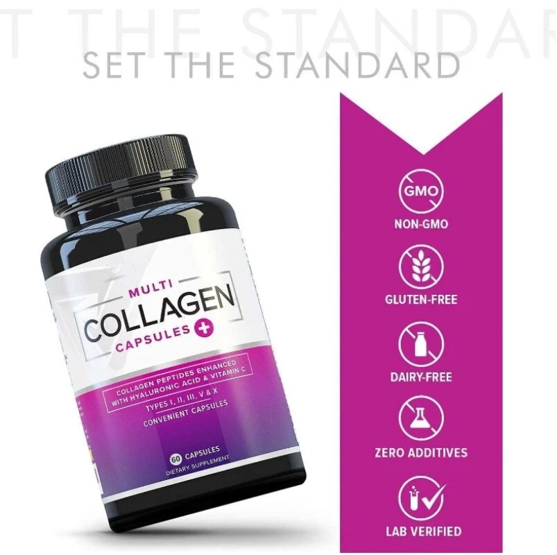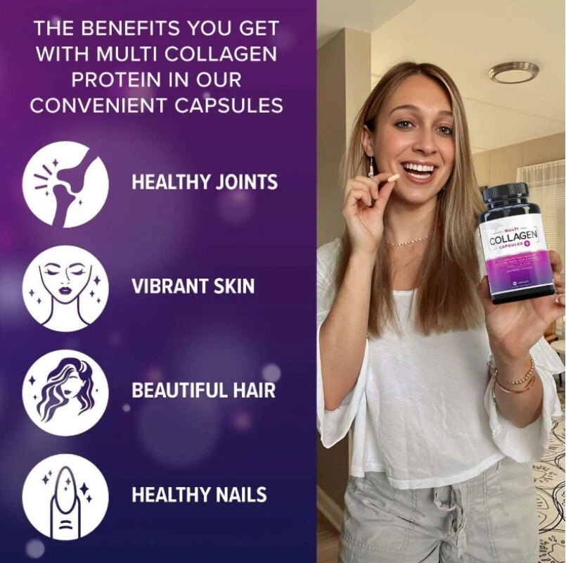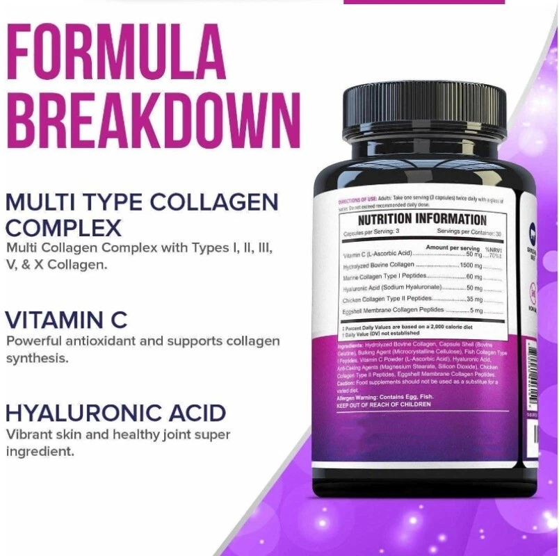 Description: ✔️ STRUCTURAL SUPPORT: Collagen is one of the most abundant proteins in the human body, however, its production slows down over time as we age. Collagen can help support structural frameworks in connective muscle, tissues, joints, and skin elasticity to reduce the appearance of wrinkles and keep your skin looking young and beautiful ✔️ LOOK & FEEL YOUR BEST: We have included all 5 types of collagen hydrolysate in our Collagen Pills Blend in order to help provide you with true Multi Collagen Support for your hair, skin, nails, muscle, tissues, and joints