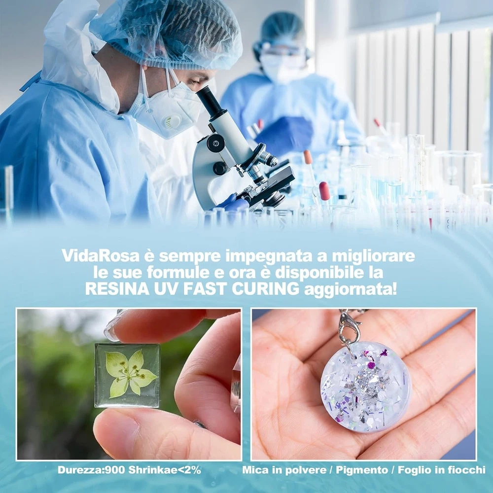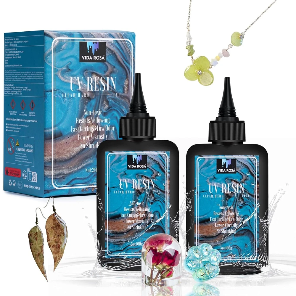 Vida Rosa UV epoxy resin is particularly suitable for arts and crafts, jewelry, tumblers, DIY projects, river tables, crystal transparency, coating, casting, and more. Our business development philosophy is based on professional technology, solid quality standards, and affordable prices, which has won the recognition and good reputation of many customers. Arts and crafts resin includes: 100g/3.52 oz resin 100g/3.52 oz resin 1 packaging box ☆【NEW ARRIVAL】You will receive a brand new upgraded UV epoxy resin product, which is transparent, low odor, anti-yellowing, self-leveling and self-degassing performance, making the surface smooth and crystal clear. This set includes two bottles of 100g UV resin. Very suitable for jewelry making and DIY projects. ☆【Fast Flowing & Faster Curing】Our UV epoxy resin is of good fluidity, can be fully cured in 2 minutes under a 36W UV lamp (90 seconds on the top, flip over, and 30 seconds on the back if possible) -- shorter curing time, lower power needed. This resin can also cure in direct sunlight. Important note: After curing, allow the cured UV resin to cool for an additional 1-2 minutes before handling. ☆【Low Shrinkage & Low Viscosity】Our UV resin is with a low shrinkage rate, less than 2%, and the resin has a low viscosity of 1000-1100cps, very suitable for complex molds, achieving a smooth and flawless surface. ☆【Operation Tips】① in a cool place. ②Before use, try a small amount to master the skills and techniques. ③The surface must be kept clean and dry when bonding. ④UV resin curing needs to be completed under the condition of ultraviolet light, please use a special UV resin lamp to cure. ⑤Do not touch the UV light immediately after irradiation, wait for it to cure and cool before touching to avoid leaving fingerprints. ☆【Satisfaction 】:We not only provide you with high-quality resin art product materials, but also provide 24-hour timely after-sales service reply. Please feel free to if you have any doubts during using, we will ensure you a satisfactory result.