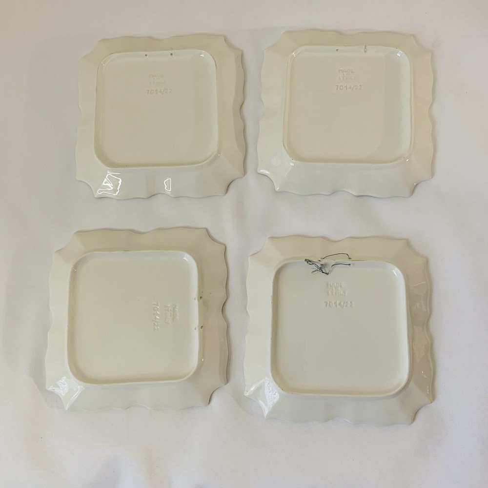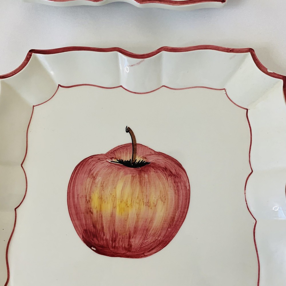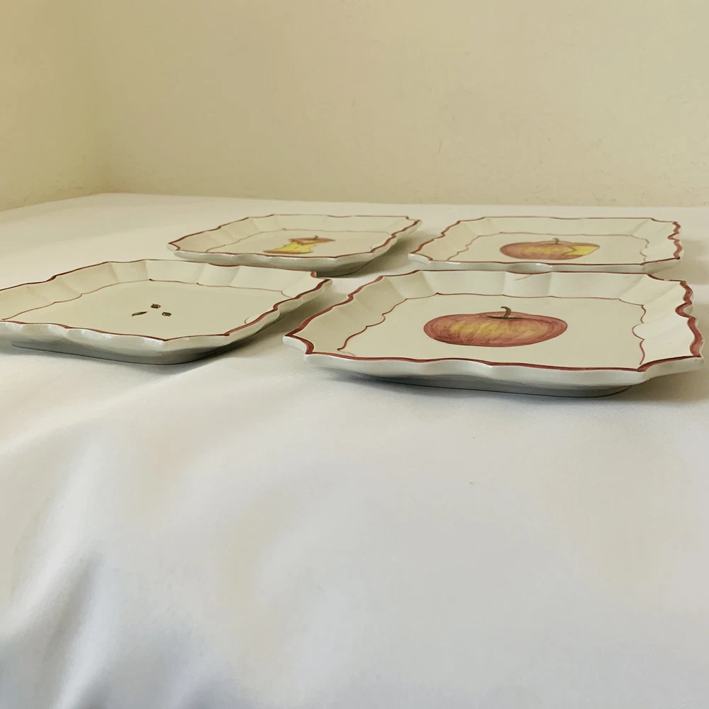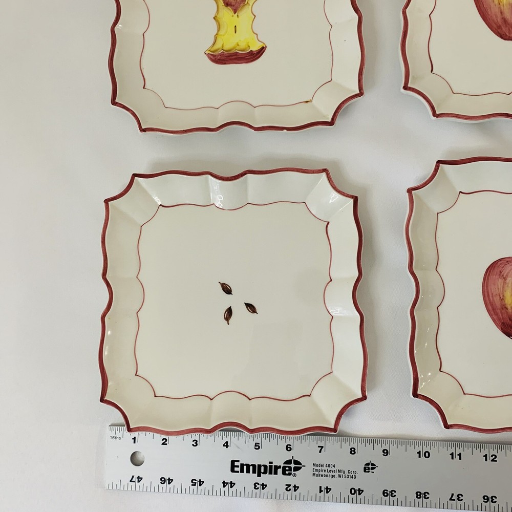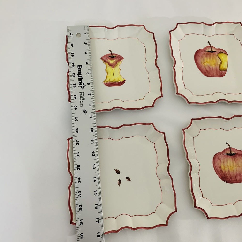 - Vietre Ceramic Plates Disappearing Apple - Set of 4 Square shape with Scallop Edge Approx 8.5x8.5" Cream Red Hand Painted Made in Italy Decorative, Has hanging holes in back to be displayed on the wall