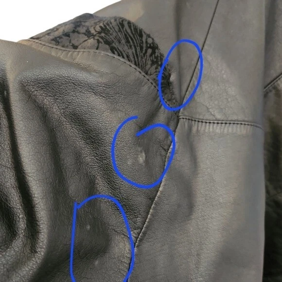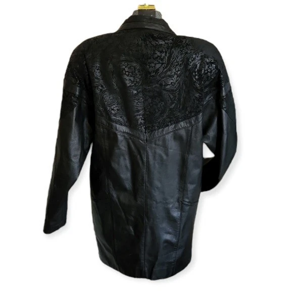 This leather coat is so cool! Vintage as anything, black leather with a paisley-floral style embossed detail around the yoke or shoulders. This does have shoulder pads. It's in very good condition with just a few light spots on one side (puctured)pictured. They are present but not easy to see. Please note that the fit is Oversozed, so the shoulders are bigger and the sleeves a bit shorter. Approximate measurements: Chest - 23" Length - 31" Sleeves - 19" Shoulders - 26" Around the hips area is about 21"