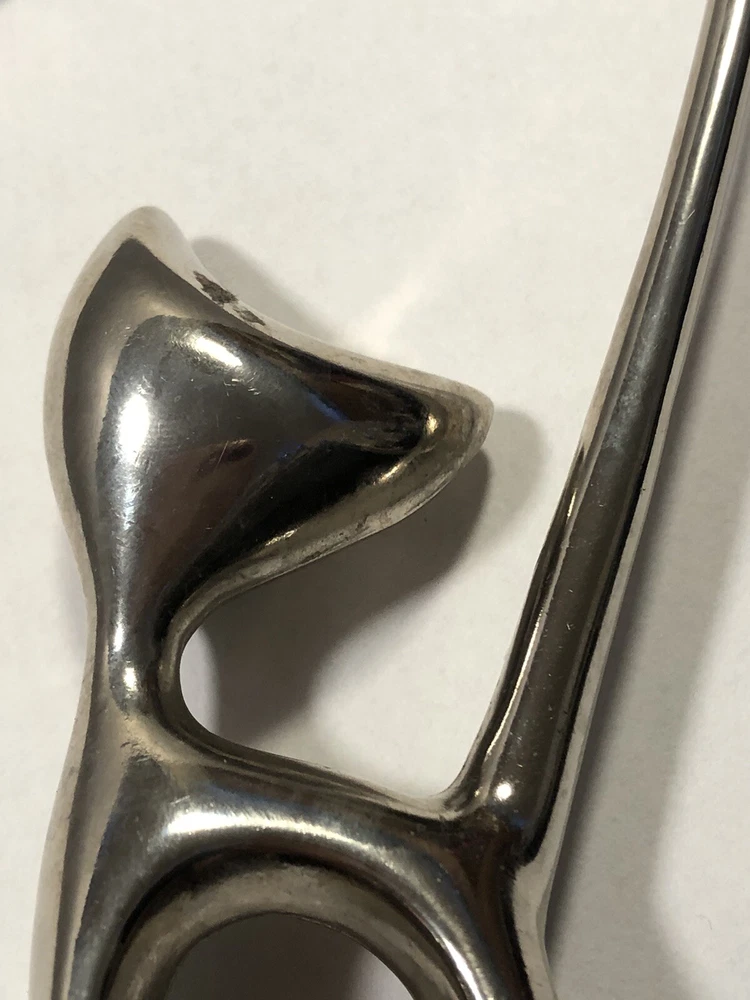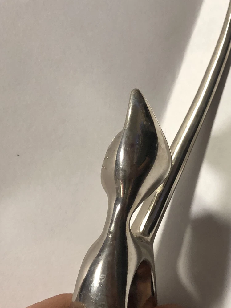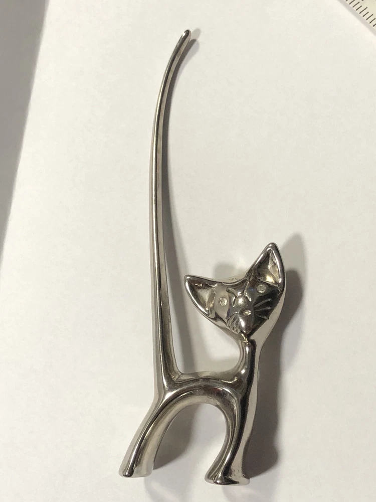 This vintage ring holder is a silver tone long tailed kitty with rhinestone eyes. It is a lovely ring holder and is perfect for unisex adults or children . The holder is made of metal and is in the shape of a cute cat figurine. This vintage piece is from the 40's and 50's and is a great addition to any jewelry collection. Please feel free to ask any questions prior to purchasing , all sales are final. If we have made a mistake, please contact us prior to leaving feedback and we will take care of it. Thank you kindly.