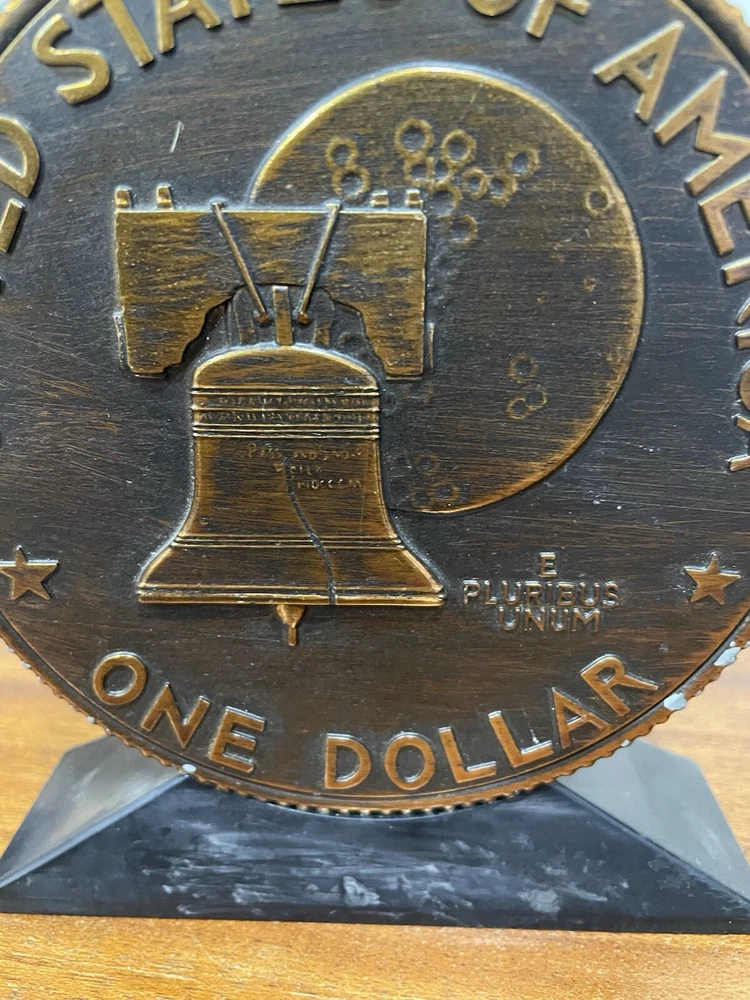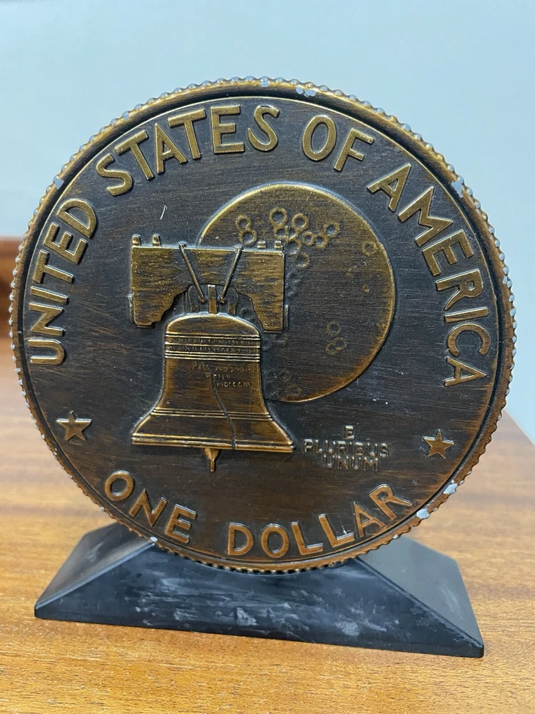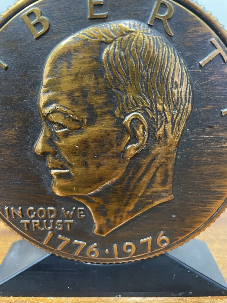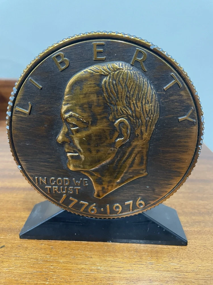 The vintage Liberty Bell Bank celebrates the Bicentennial of the United States with a design featuring President Dwight Eisenhower and the years 1776-1976. Made of plastic, this original reproduction is a collectible still bank perfect for showcasing American history and patriotism. The bank is a unique piece that captures a significant moment in the nation's past and serves as a reminder of the bicentennial celebrations of the United States. READ, has some wear on the top and sides of coin. See photo.