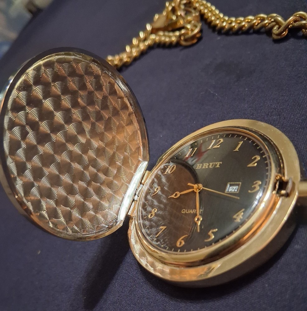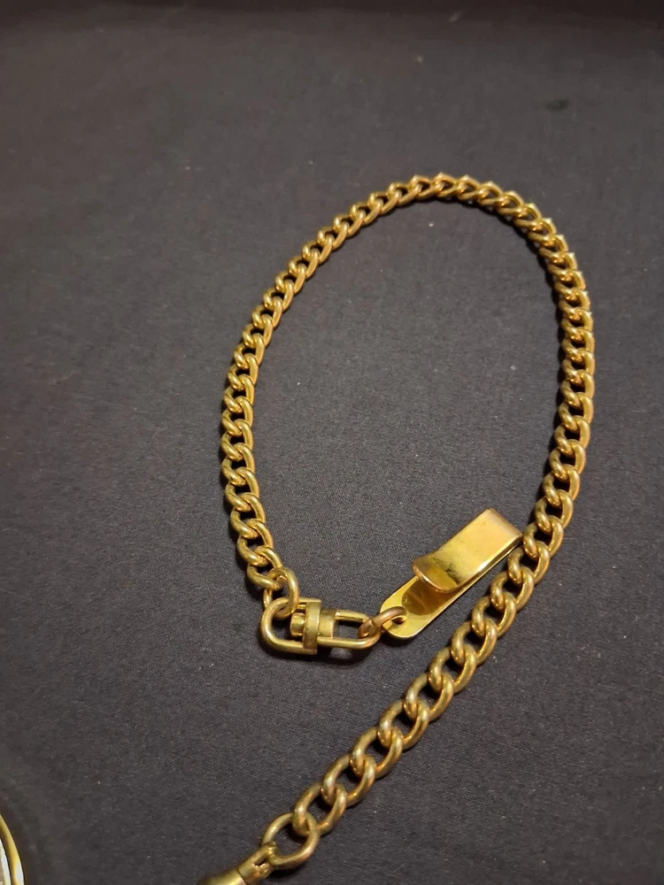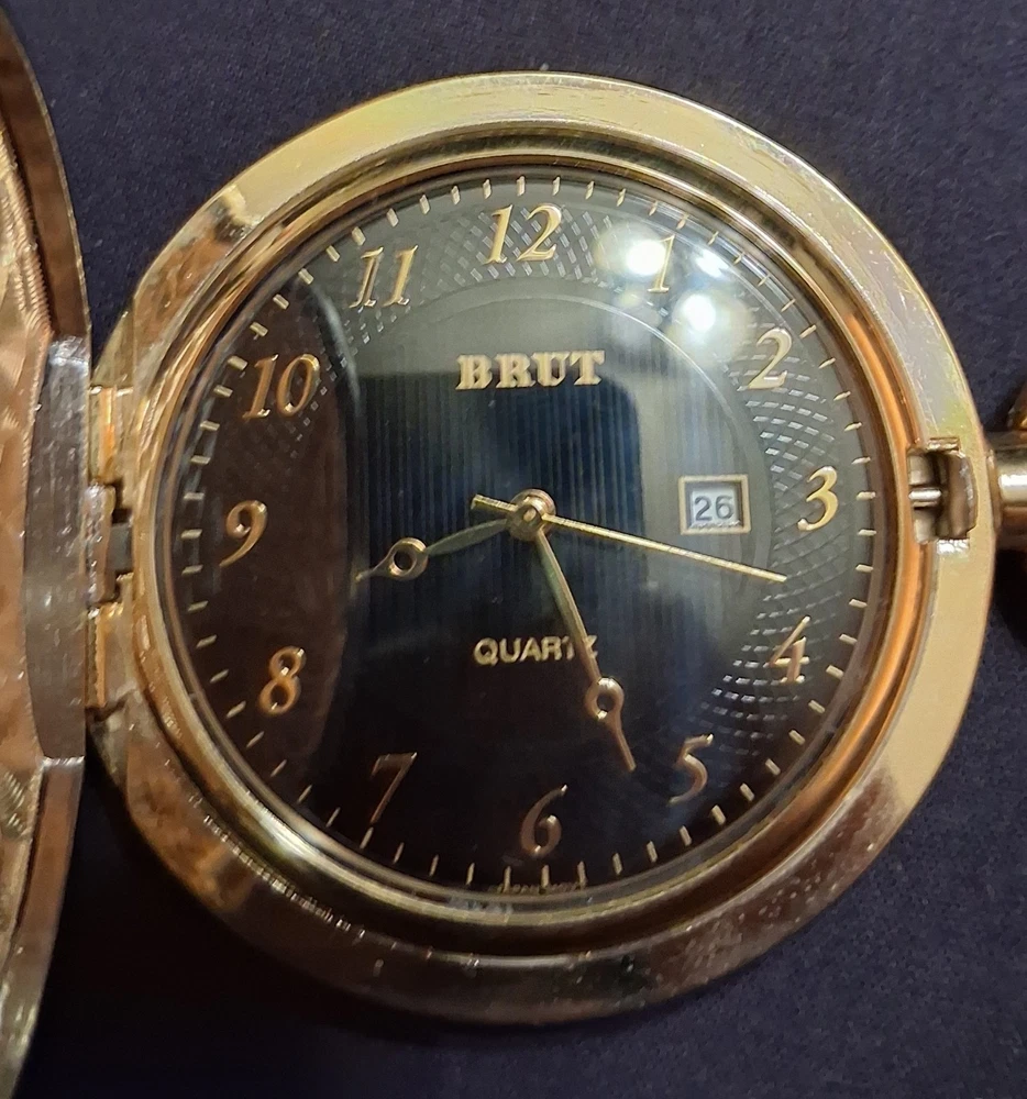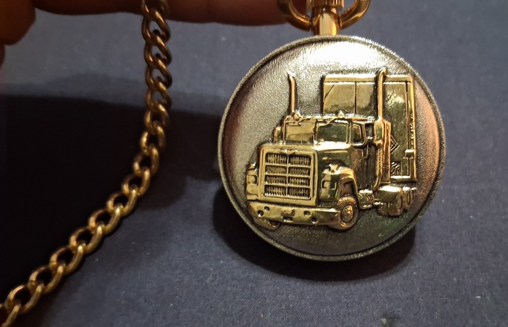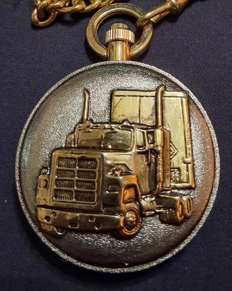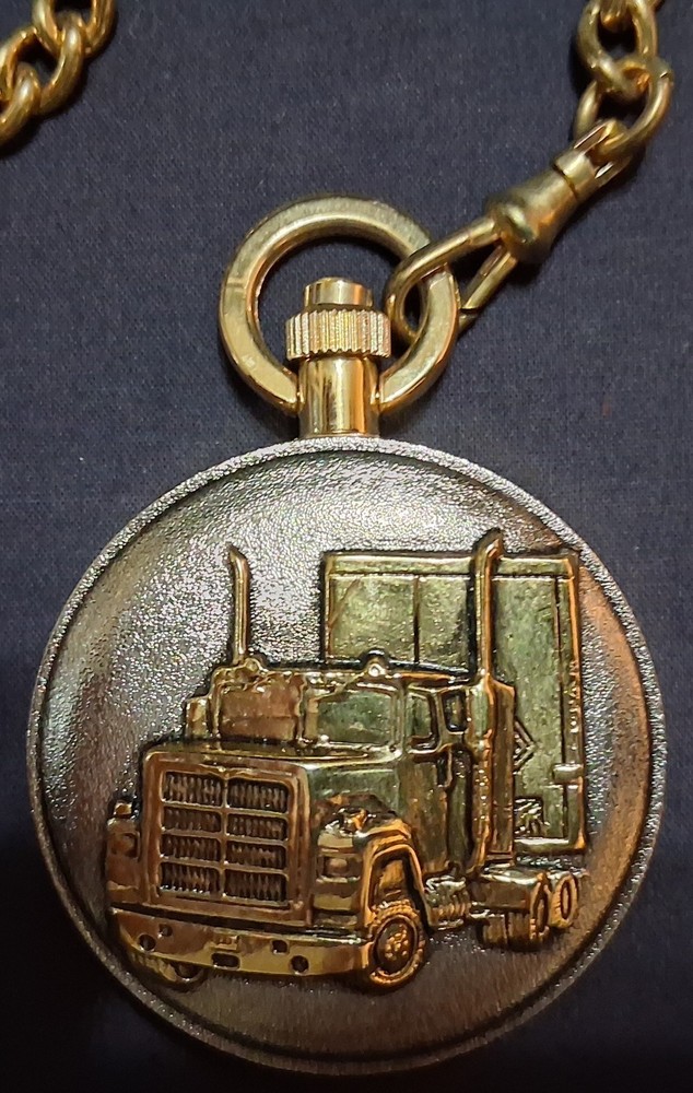 The Vintage Pocket Watch featuring a semi truck and trailer on a gold chain is a unique and stylish timepiece from the brand Brut. This quartz pocket watch with a half hunter closure and polished case finish showcases a yellow gold dial with a 12-hour dial and seconds hand. Manufactured between 1990-1999, this pocket watch includes the original box and booklet, making it a valuable addition to any watch collection. The detailed design of the truck and trailer on the chain adds a touch of transportation theme to the overall casual style of this vintage piece. Check all pictures and ask questions before purchasing.