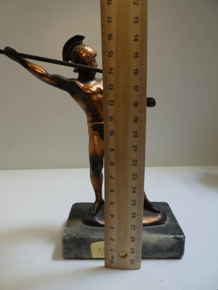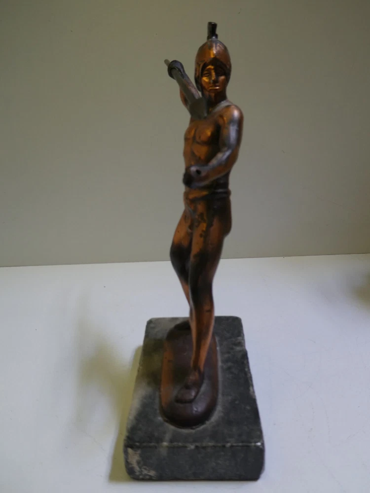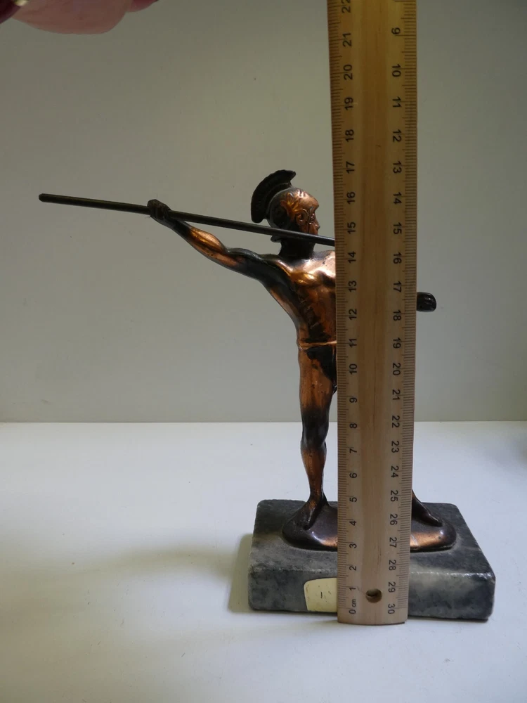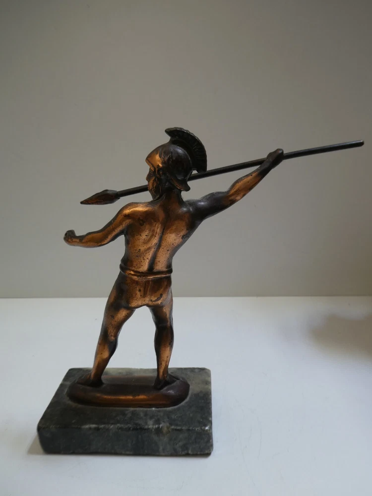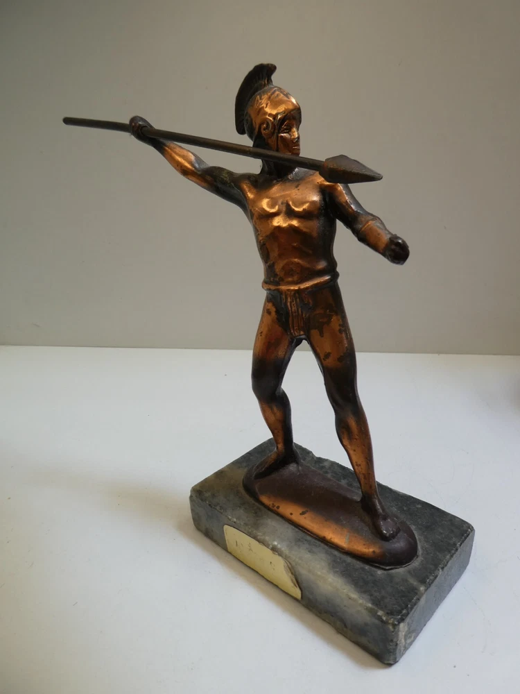 VINTAGE CAST METAL COPPER PLATED STATUE SOUVENIR GREEK ROMAN SOLDIER WITH SPEAR FIGURINE ON A MARBLE BASE - MISSING A SHIELD GOOD USED CONDITION 18.5 CM HIGH SEE PHOTOS FOR BEST GUIDE TO CONDITION I AM LISTING SOME OTHER ESTATE PIECES I can combine for postage. CHECK MY OTHER LISTINGS FOR MORE