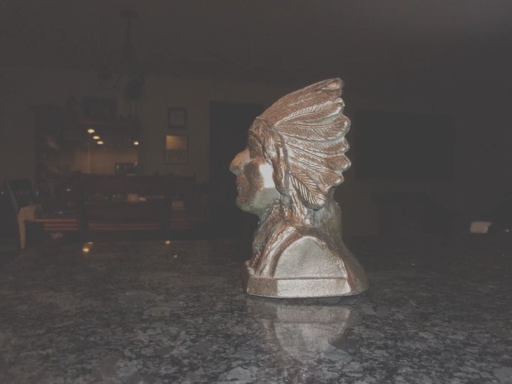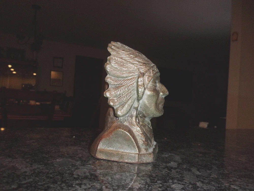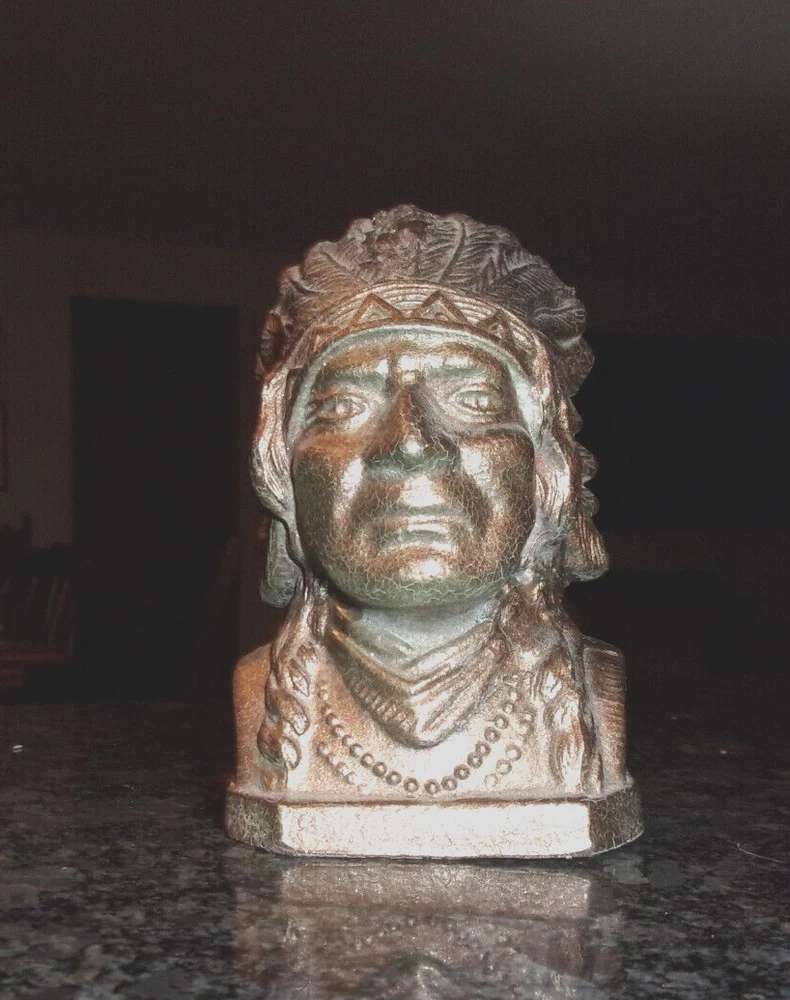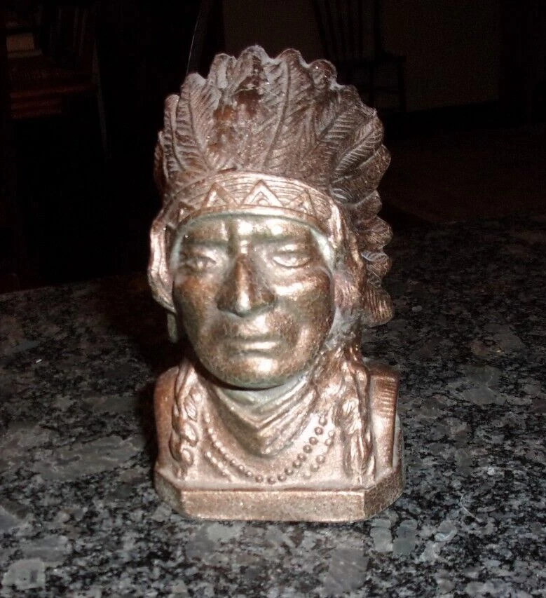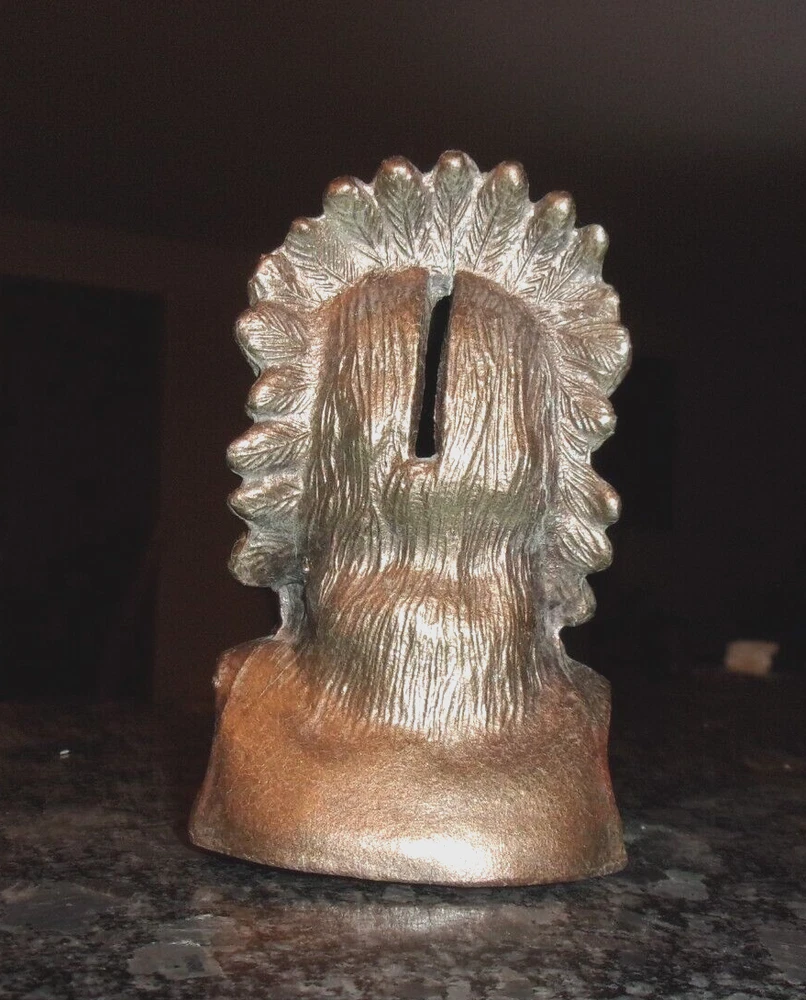 HomeVINTAGE CAST METAL NATIVE AMERICAN INDIAN COIN BANK - COPPER PAINTED -