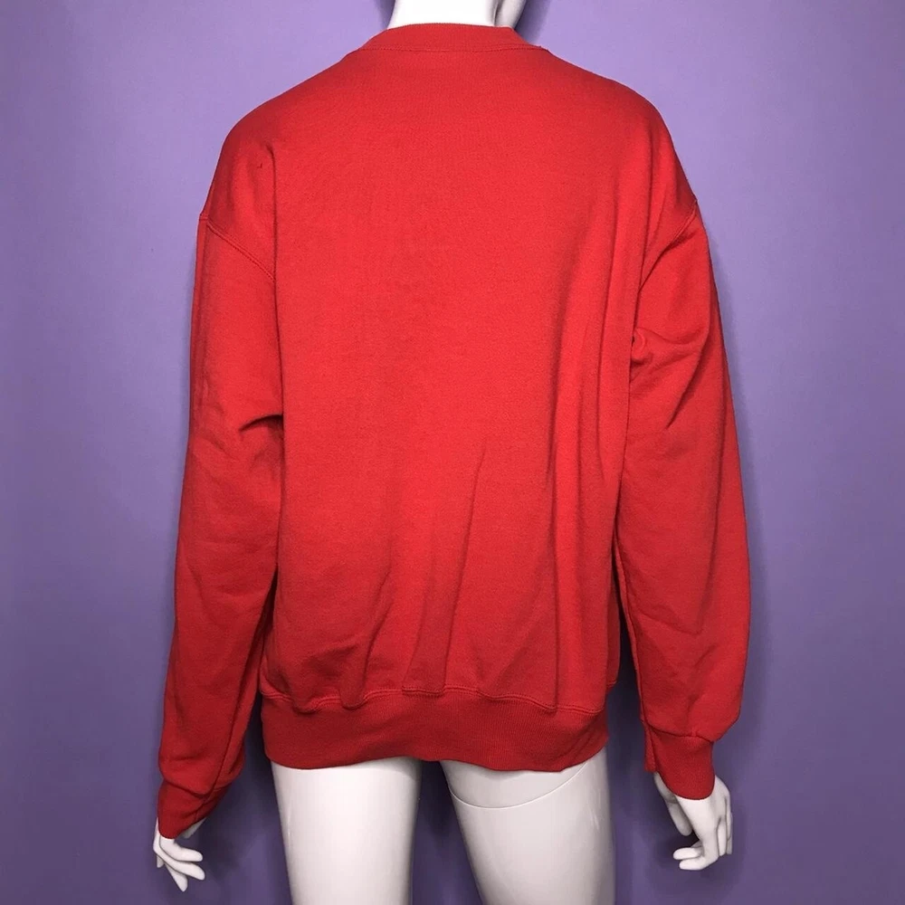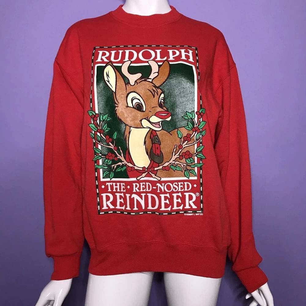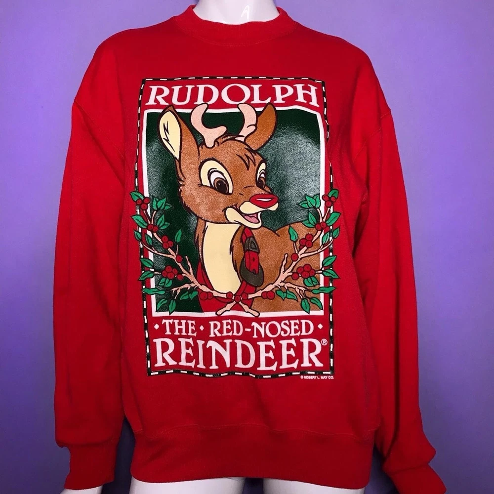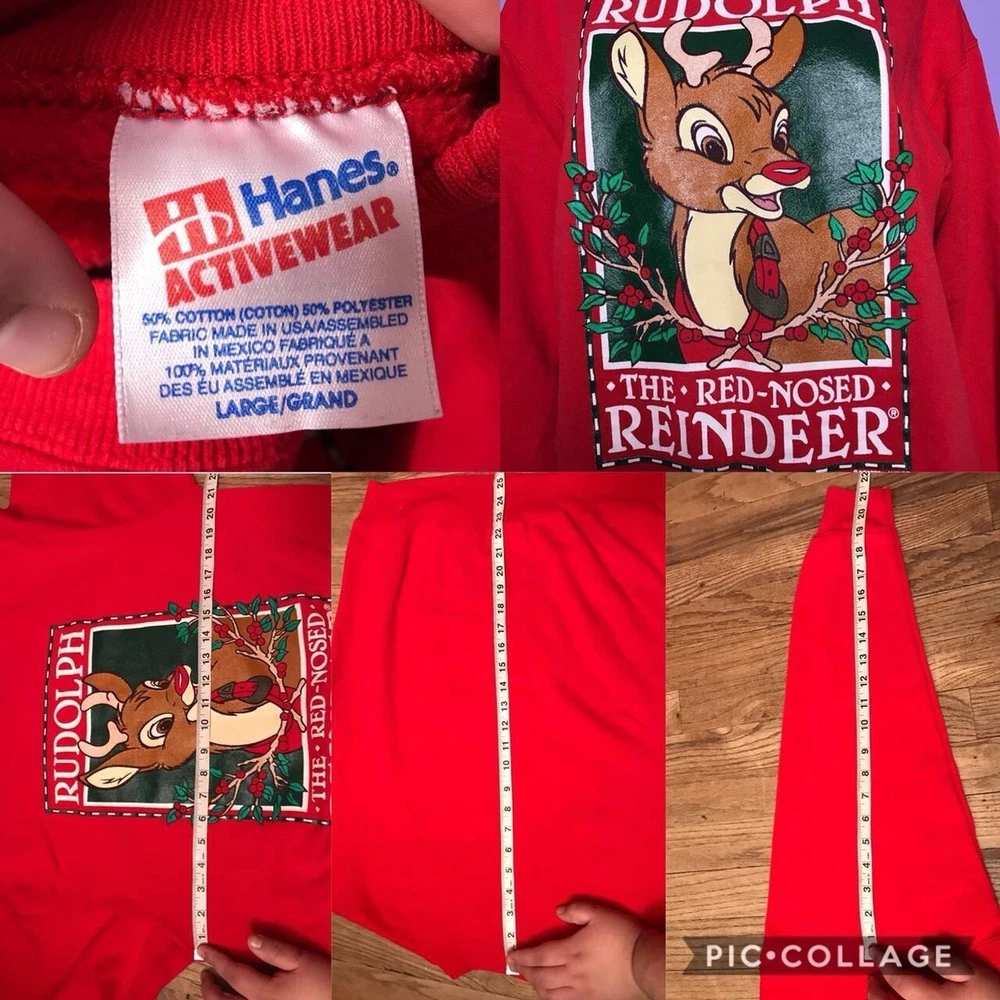 2000s Rudolph graphic Christmas crewneck sweater!❣️ “Rudolph the.red-nosed reindeer” Perfect for the holiday season!🎄 Brand; Hanes Activewear, Tag size; Large! PIT-PIT; over 21in (laying flat, not doubled) SLEEVE; over 21in LENGTH; 25in (measured from the back) This sweater is in worn & faded condition! It has small scuffs, pilling, stains & marks! ❗️The artwork is also cracking & has worn/faded areas!❗️(more faded in person) not all flaws are photographed! plz keep in mind the condition of this item!! Model is a XS/S! Sold as is!