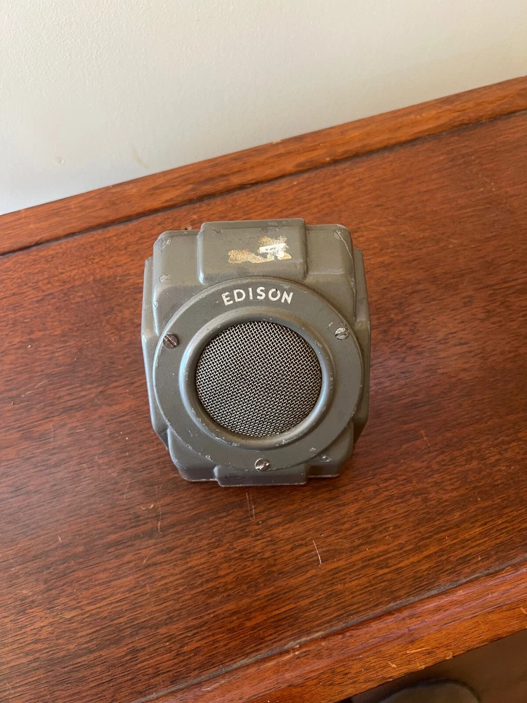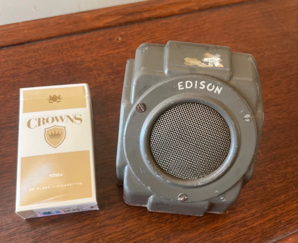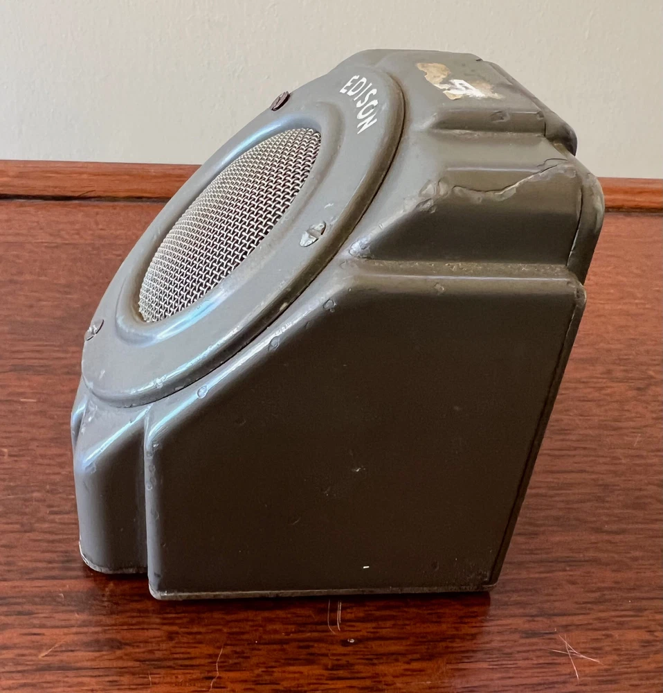Vintage Edison speaker in a all metal case. Has a single push button switch & one RCA Phono jack. Own a piece of American Edison History! Being sold as is. Measures: 4" tall x 3 1/2" x 3 3/4" wide Keywords: vintage speakers, vintage edison, edison Dictaphone, old speakers, metal case speaker