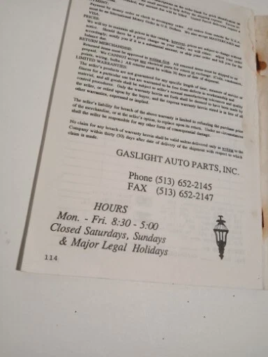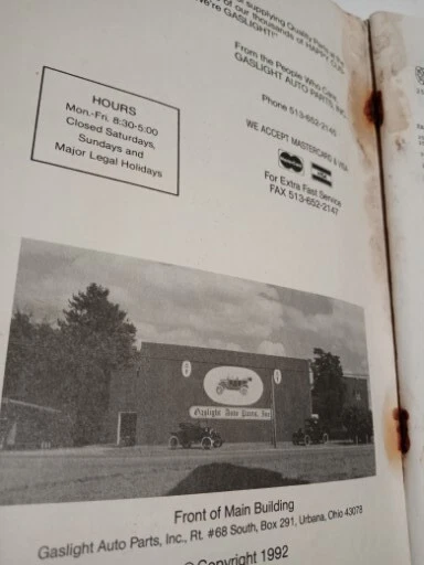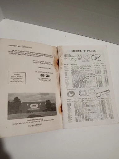 VINTAGE GASLIGHT AUTO PARTS ANTIQUE FORD PARTS AND ACCESSORIES 1992 EDITION. Catalog 93! Worn from old age, missing staples. Index in back and 114 pages included. Please refer to photos listed. Let me know if you have any questions.
