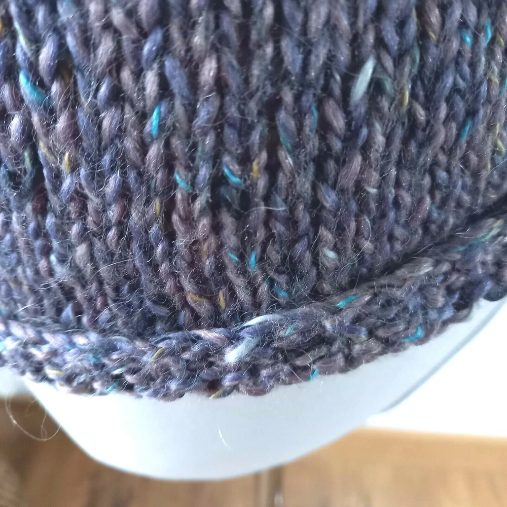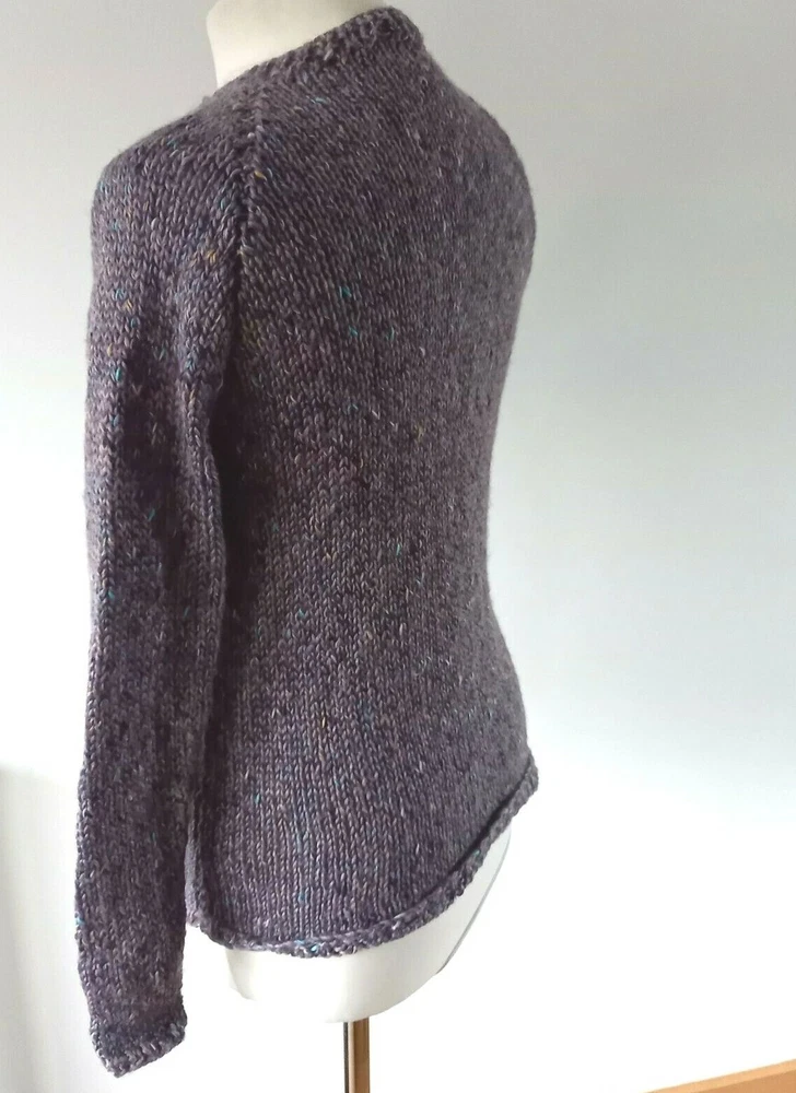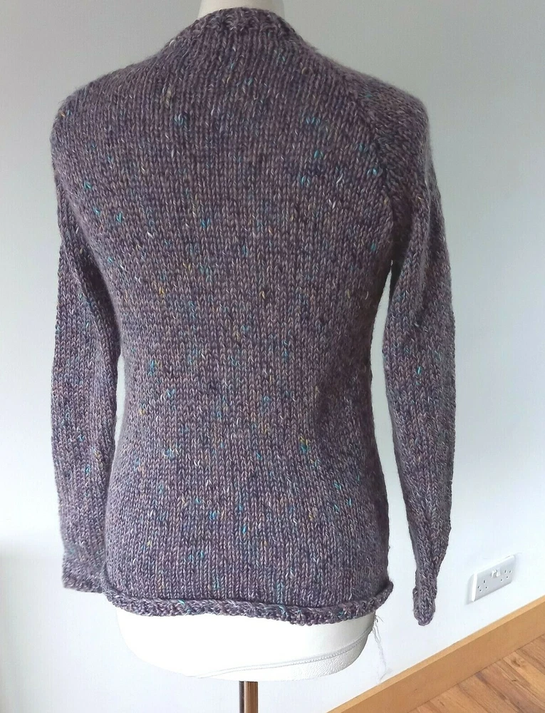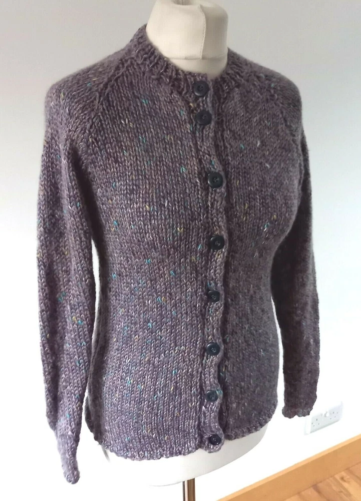 Gently used vintage condition with no faults found. Cardigan in a soft yarn with purple as main colour but also other colours running through it. Higher neck. Measures 18" pit to pit, 16" across hip area approx, , length nape to hem 25" with a bit of roll up at the hem, sleeve 24". Unsure of yarn content but is soft and has some mohair in it.