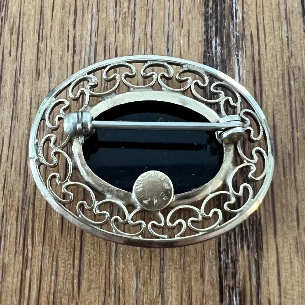 VINTAGE MARKED WINARD 12K GOLD FILLED OVAL ONYX FILIGREE PIN BROOCH. Gently cleaned, otherwise sold as found. Please see photos for size and condition. Priced to MOVE! Bid now!