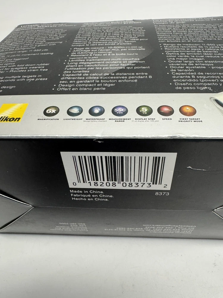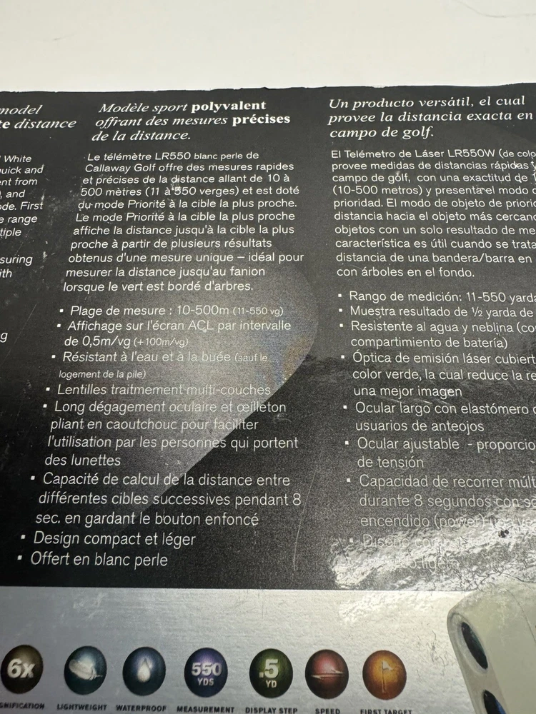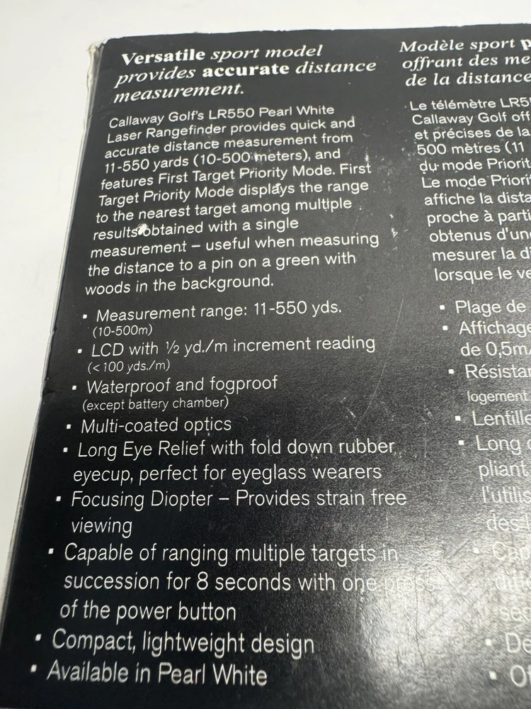 1. Brand: Nikon 2. Item Description: VINTAGE NOS Nikon LR550 Callaway Waterproof Golf Rangefinder Pearl White 3. Condition: This box has been opened but the components are sealed. The components inside are 100% brand new from the manufacturer. The pictures are from the actual item on sale. 4. Color: 5. Included Items: A. Included: Original manufacturer's packaging, B. Not Included: 6. Suggested Retail Price: $ 7. Product Features: