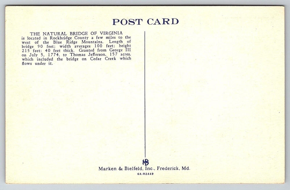 Posted: No Time Period Manufactured: NA Stamp: No City: Natural Bridge, Virginia Postage Condition: Unposted Signed: No Brand/Publisher: Marken & Biefield, Inc. Fredrick, Maryland UPC: DOES NOT APPLY Color: Multicolor Era: Divided Back (1907-1915) Number of Items in Set: 1 Region: Virginia Antique: Yes Continent: North America Artist: Postcard Size: Standard (5.5 x 3.5 in) Finish: Matte Subject: Bridge Type: Linen Postcard Vintage: Yes Featured Person: None Material: Paper Unit of Sale: Single Unit Theme: Cities & Towns, Community Life, Domestic & Family Life, Famous Places, Historical Figures, Landscapes, Roadside America, Seasons, Social History, Tourism, Postcard, Antique, Vintage, Ephemera, Collectible, Memorabilia, Old, Retro, History, Card, Mail, Paper gtin13: DOES NOT APPLY Occasion: Postcard Country: United States Seller Notes: “Good Vintage Condition. See Pictures And Description Closely For Details.” Original/Licensed Reprint: Original Features: Divided Back, White Border, Original Genuine Antique Vintage Postcard Country/Region of Manufacture: United States Franchise: Postcard Signed By: None Character: Postcard Location: Natural Bridge, Virginia USA Orientation: Vertical