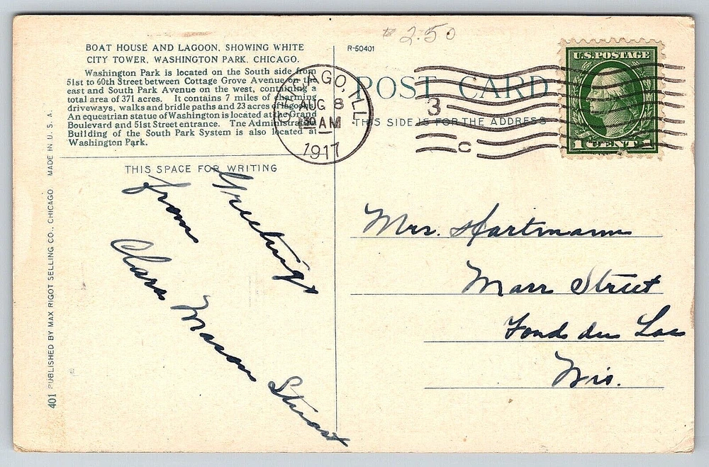 VINTAGE OLD ANTIQUE POSTCARD BOAT HOUSE LAGOON WASHINGTON PARK CHICAGO USA 1917