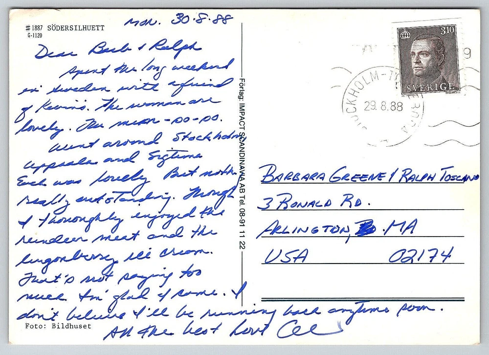 Theme: Architecture, Cities & Towns, Community Life, Countries, Cultures & Ethnicities, Domestic & Family Life, Famous Places, Historical Figures, Landscapes, Nautical, Photographs, Seasons, Social History, Technology, Tourism, Transportation, Travel, Postcard, Antique, Vintage, Ephemera, Collectible, Memorabilia, Old, Retro, History, Card, Mail, Paper Antique: Yes Size: Continental (6 x 4 in) Artist: Postcard City: Stockholm Featured Person: None Orientation: Vertical UPC: DOES NOT APPLY Occasion: Postcard Stamp: Yes Subject: Bridge Unit of Sale: Single Unit Material: Paper Color: Multicolor Signed: Yes Brand/Publisher: IMPACT SCANDINAVIA Number of Items in Set: 1 Type: VINTAGE OLD ANTIQUE POSTCARD Signed By: Sender Time Period Manufactured: 1980-1989 Year Manufactured: 1988 Vintage: Yes Posted: Yes Original/Licensed Reprint: Original Region: Stockholm Continent: North America Postage Condition: Posted Location: Stockholm, Sweden Franchise: Postcard gtin13: DOES NOT APPLY Seller Notes: “Good Vintage Condition. See Pictures And Description Closely For Details.” Era: Divided Back (1907-1915) Character: Postcard Finish: Glossy Country: Sweden Country/Region of Manufacture: Sweden Features: Divided Back, Original Genuine Antique Vintage Postcard