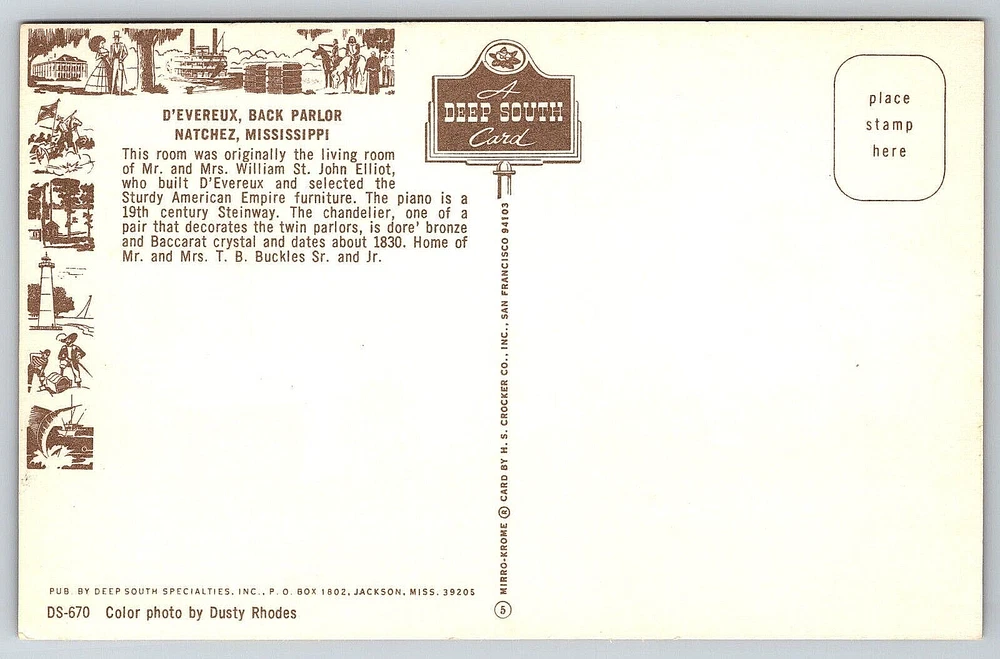 VINTAGE OLD ANTIQUE POSTCARD D'EVEREUX HOUSE PARLOR ROOM NATCHEZ MISSISSIPPI USA