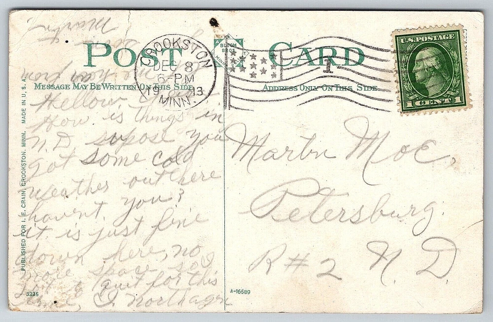 Antique: Yes Material: Paper Original/Licensed Reprint: Original Finish: Glossy Location: Crookston, Minnesota USA Orientation: Horizontal Number of Items in Set: 1 Country: United States Seller Notes: “Good Vintage Condition. See Pictures And Description Closely For Details.” Artist: Postcard Country/Region of Manufacture: United States Signed: Yes Color: Multicolor Region: Minnesota Type: VINTAGE OLD ANTIQUE POSTCARD City: Crookston Character: Postcard Theme: Architecture, Cities & Towns, Community Life, Domestic & Family Life, Famous Places, Historical Figures, Landscapes, Patriotic, People, Roadside America, Seasons, Social History, Postcard, Antique, Vintage, Ephemera, Collectible, Memorabilia, Old, Retro, History, Card, Mail, Paper Occasion: Postcard gtin13: DOES NOT APPLY Featured Person: None Continent: North America Year Manufactured: 1913 Stamp: Yes Time Period Manufactured: 1900-1919 Franchise: Postcard Subject: Flag Era: Divided Back (1907-1915) UPC: DOES NOT APPLY Postage Condition: Posted Vintage: Yes Posted: Yes Signed By: Sender Unit of Sale: Single Unit Size: Standard (5.5 x 3.5 in) Brand/Publisher: I.E. CRAIN Features: Divided Back, Stamp, Stamped, Original Genuine Antique Vintage Postcard