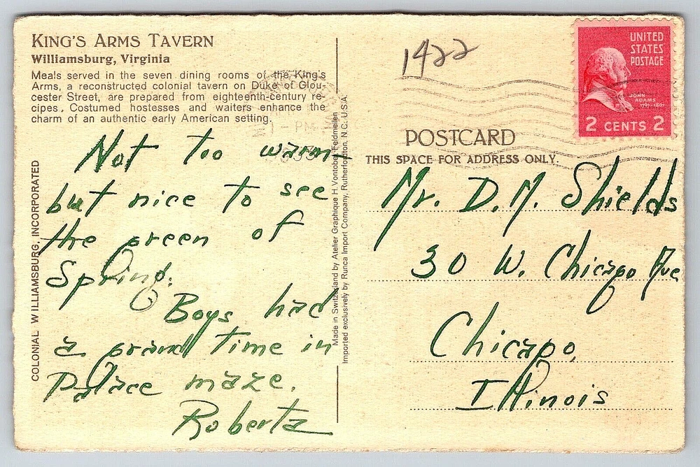 Type: VINTAGE OLD ANTIQUE POSTCARD KING'S ARMS TAVERN WILLIAMSBURG Number of Items in Set: 1 Finish: Matte Unit of Sale: Single Unit Color: Multicolor Continent: North America City: Willamsburg, Virginia USA Size: Standard (5.5 x 3.5 in) Signed: Yes Material: Paper Postage Condition: Posted Antique: Yes Features: Divided Back, Stamp, Stamped, White Border, Original Genuine Antique Vintage Postcard UPC: DOES NOT APPLY Stamp: Yes Time Period Manufactured: 1950-1959 Year Manufactured: 1953 Character: Postcard Original/Licensed Reprint: Original Country/Region of Manufacture: United States gtin13: DOES NOT APPLY Orientation: Horizontal Featured Person: People Vintage: Yes Region: Virginia Era: Divided Back (1907-1915) Theme: Architecture, Cities & Towns, Community Life, Cultures & Ethnicities, Domestic & Family Life, Famous Places, Fashion, Food & Wine, Historical Figures, People, Photographs, Roadside America, Social History, Tourism, Postcard, Antique, Vintage, Ephemera, Collectible, Memorabilia, Old, Retro, History, Card, Mail, Paper Artist: Postcard Franchise: Postcard Occasion: Postcard Posted: Yes Seller Notes: “Good Vintage Condition. See Pictures And Description Closely For Details.” Subject: Cities & Towns Signed By: Sender Country: United States Location: Williamsburg, Virginia USA Brand/Publisher: COLONIAL WILLIAMSBURG INC.