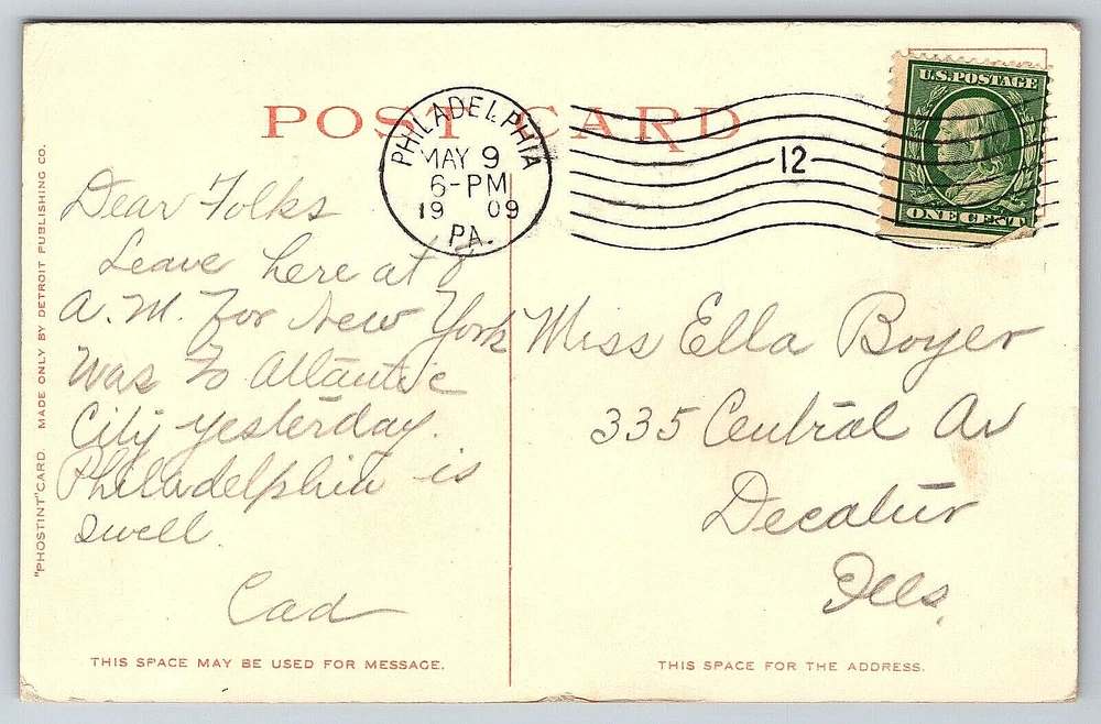 Finish: Matte Region: Pennsylvania Antique: Yes Signed: Yes Era: Divided Back (1907-1915) Country: United States Features: Divided Back, Stamp, Stamped, White Border, Original Genuine Antique Vintage Postcard Stamp: Yes Orientation: Horizontal Occasion: Postcard Location: Philadelphia, Pennsylvania USA Subject: Cities & Towns Featured Person: None Franchise: Postcard Signed By: Sender Size: Standard (5.5 x 3.5 in) Artist: Postcard UPC: DOES NOT APPLY Color: Multicolor Original/Licensed Reprint: Original Seller Notes: “Good Vintage Condition. See Pictures And Description Closely For Details.” Posted: Yes Material: Paper gtin13: DOES NOT APPLY Type: VINTAGE OLD ANTIQUE POSTCARD LIBERTY BELL INDEPENDENCE HALL Postage Condition: Posted Country/Region of Manufacture: United States Time Period Manufactured: 1900-1919 Vintage: Yes Character: Postcard City: Philadelphia Number of Items in Set: 1 Brand/Publisher: Detroit Publishing Continent: North America Year Manufactured: 1909 Unit of Sale: Single Unit Theme: Architecture, Cities & Towns, Community Life, Famous Places, Historical Figures, Social History, Postcard, Antique, Vintage, Ephemera, Collectible, Memorabilia, Old, Retro, History, Card, Mail, Paper