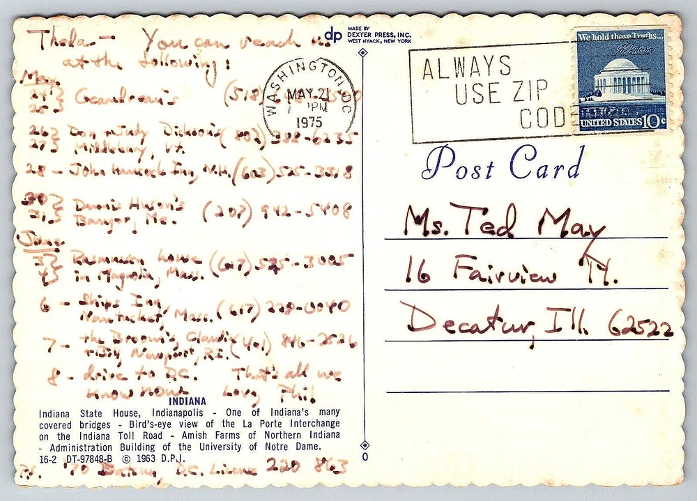 Material: Paper Features: Divided Back, Stamp, Stamped, Original Genuine Antique Vintage Postcard Country/Region of Manufacture: United States Postage Condition: Posted Occasion: Postcard Location: Indiana USA Number of Items in Set: 1 Unit of Sale: Single Unit Color: Multicolor Subject: Cities & Towns Franchise: Postcard Size: Continental (6 x 4 in) Original/Licensed Reprint: Original Seller Notes: “Good Vintage Condition. See Pictures And Description Closely For Details.” City: Indiana Artist: Postcard Antique: Yes Stamp: Yes UPC: DOES NOT APPLY Finish: Glossy gtin13: DOES NOT APPLY Country: United States Featured Person: None Signed: Yes Vintage: Yes Orientation: Horizontal Posted: Yes Signed By: Sender Theme: Aerial View, Architecture, Cities & Towns, Community Life, Countries, Cultures & Ethnicities, Domestic & Family Life, Famous Places, Greetings, Historical Figures, Landscapes, Photographs, Roadside America, Seasons, Social History, Tourism, Transportation, Travel, Postcard, Antique, Vintage, Ephemera, Collectible, Memorabilia, Old, Retro, History, Card, Mail, Paper Type: VINTAGE OLD ANTIQUE POSTCARD Year Manufactured: 1975 Era: Divided Back (1907-1915) Region: Indiana Continent: North America Time Period Manufactured: 1970-1979 Character: Postcard Brand/Publisher: Dexter Press