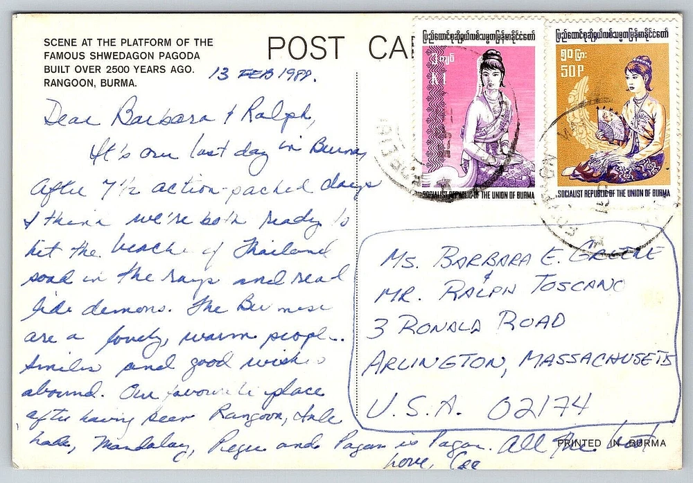 Material: Paper Brand/Publisher: Unbranded Location: Burma Number of Items in Set: 1 Continent: North America gtin13: DOES NOT APPLY City: Burma Postage Condition: Posted Region: Rangoon Featured Person: People Features: Divided Back, Stamp, Stamped, Original Genuine Antique Vintage Postcard Original/Licensed Reprint: Original Seller Notes: “Good Vintage Condition. See Pictures And Description Closely For Details.” Unit of Sale: Single Unit Size: Continental (6 x 4 in) UPC: DOES NOT APPLY Era: Divided Back (1907-1915) Year Manufactured: 1988 Stamp: Yes Type: VINTAGE OLD ANTIQUE POSTCARD Finish: Glossy Signed: Yes Theme: Antique, Architecture, Card, Cities & Towns, Collectible, Community Life, Countries, Cultures & Ethnicities, Domestic & Family Life, Ephemera, Famous Places, Historical Figures, History, Landscapes, Mail, Memorabilia, Old, Paper, People, Photographs, Postcard, Retro, Seasons, Social History, Tourism, Vintage Country: Burma Occasion: Postcard Vintage: Yes Signed By: Sender Antique: Yes Subject: Cities & Towns Posted: Yes Character: Postcard Franchise: Postcard Orientation: Horizontal Time Period Manufactured: 1980-1989 Color: Multicolor Artist: Postcard