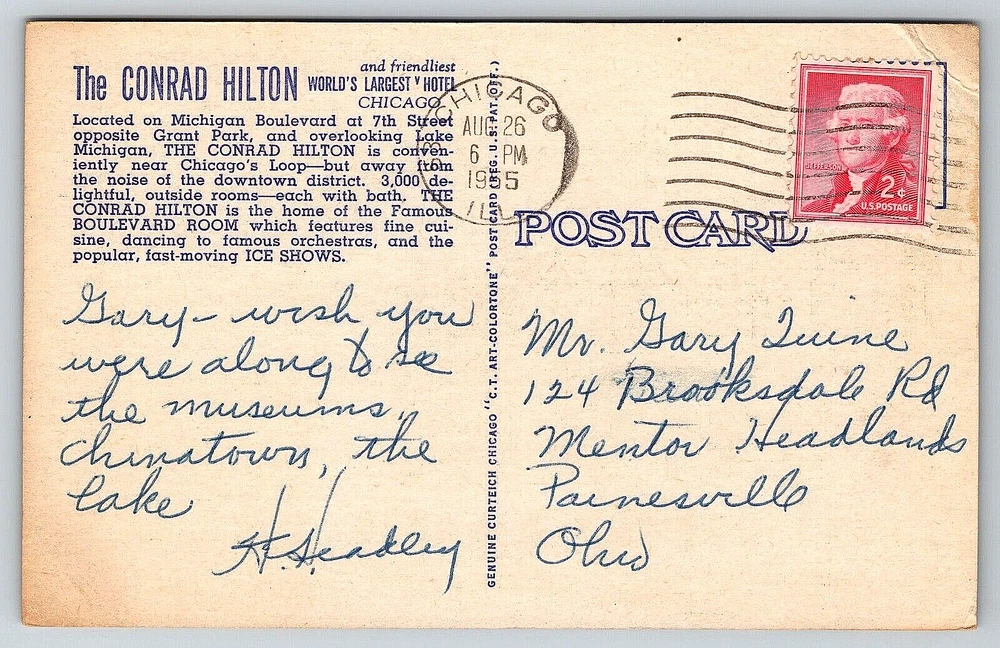 VINTAGE OLD ANTIQUE POSTCARD THE CONRAD HILTON HOTEL CHICAGO ILLINOIS USA