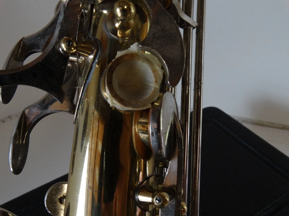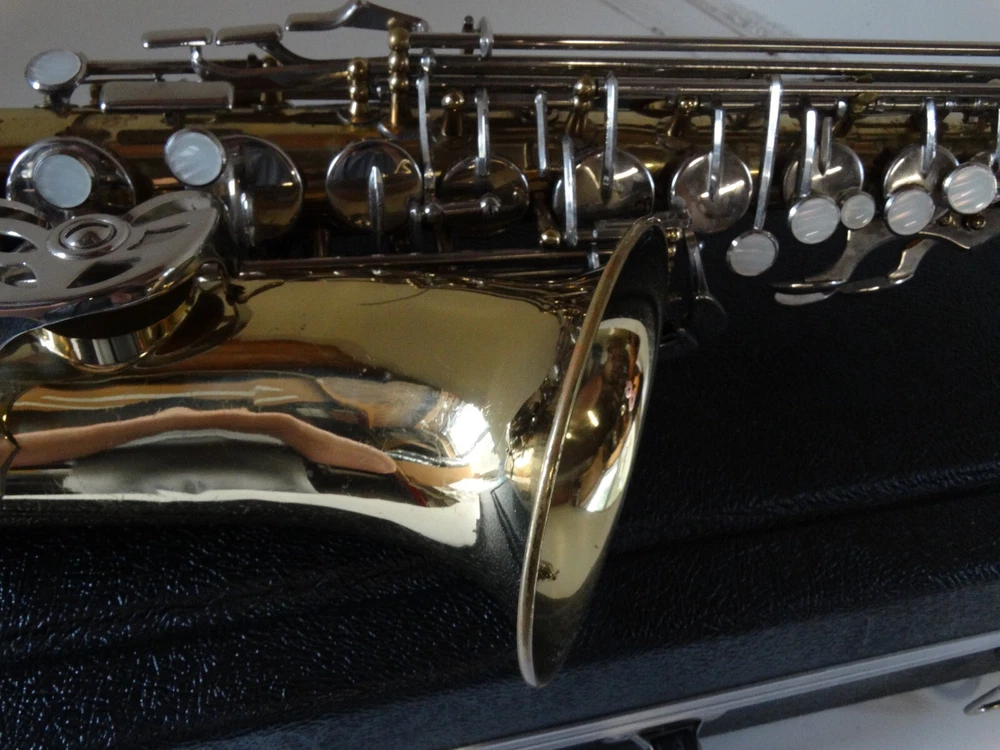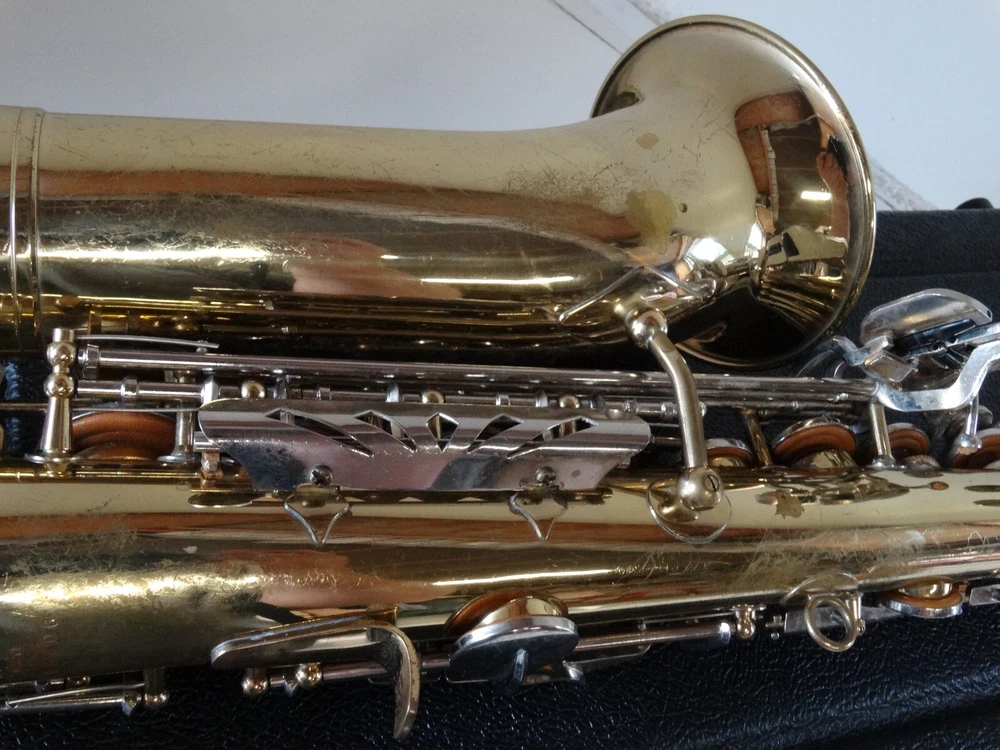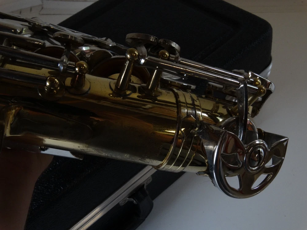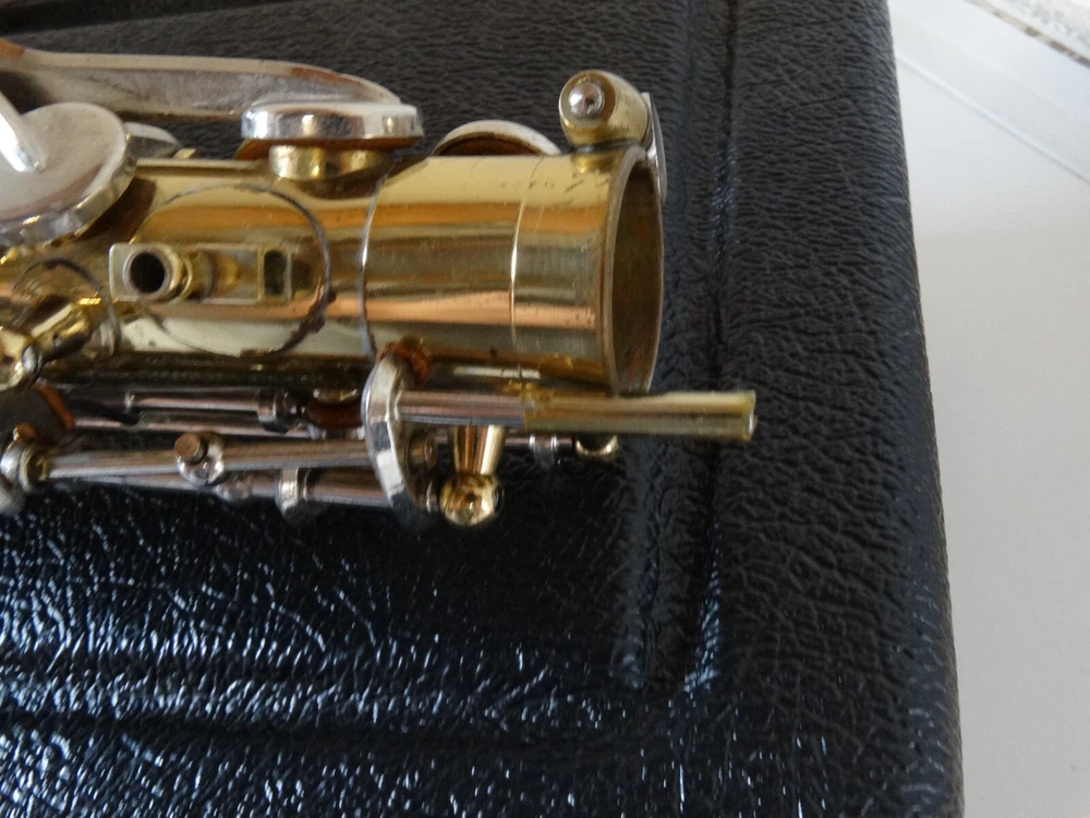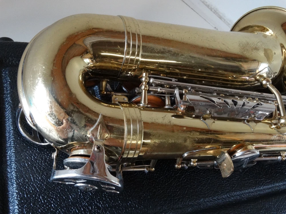 this is as pictured i do not play the sax so it is not tested all the levers seem to move freely and it is in overall nice shape the serial number indicates it is from 1974 there is one hole on the back covered with masking tape not sure what that is about comes with some extra's look at the pictures to see just what is included