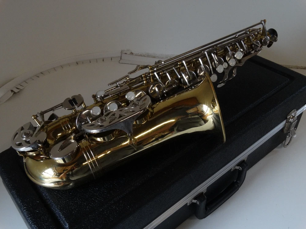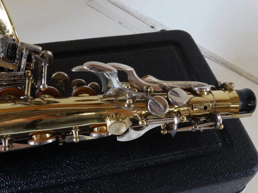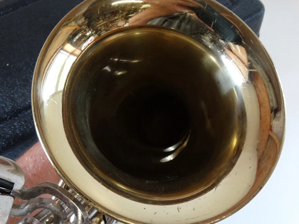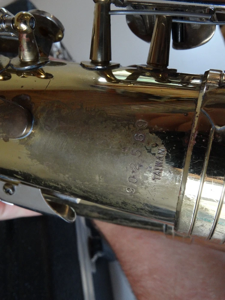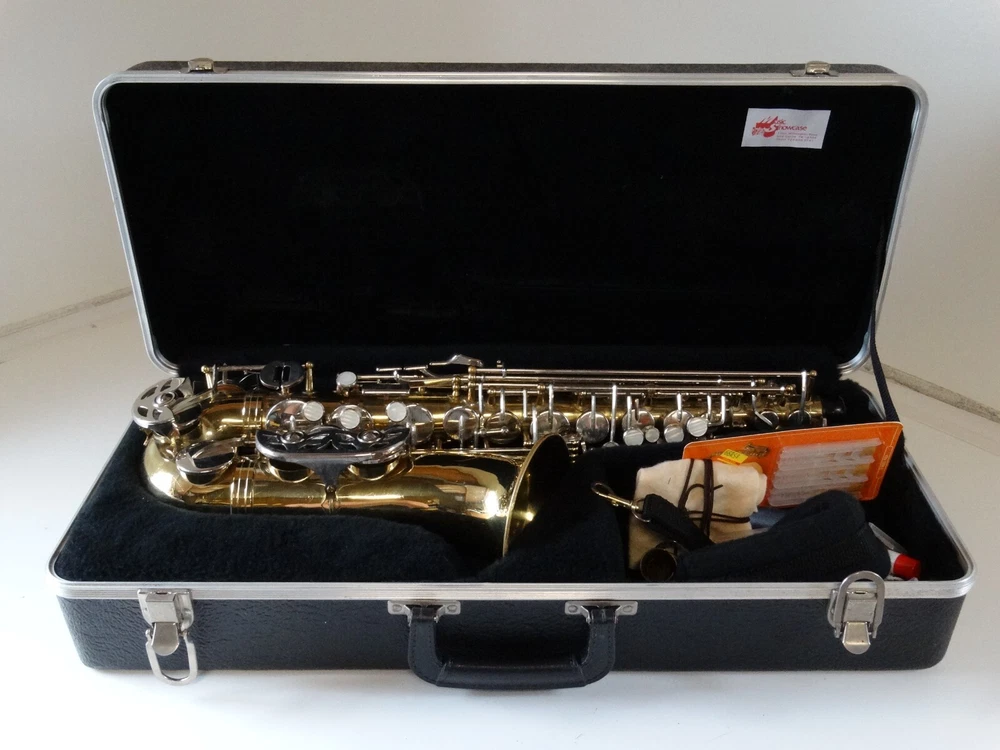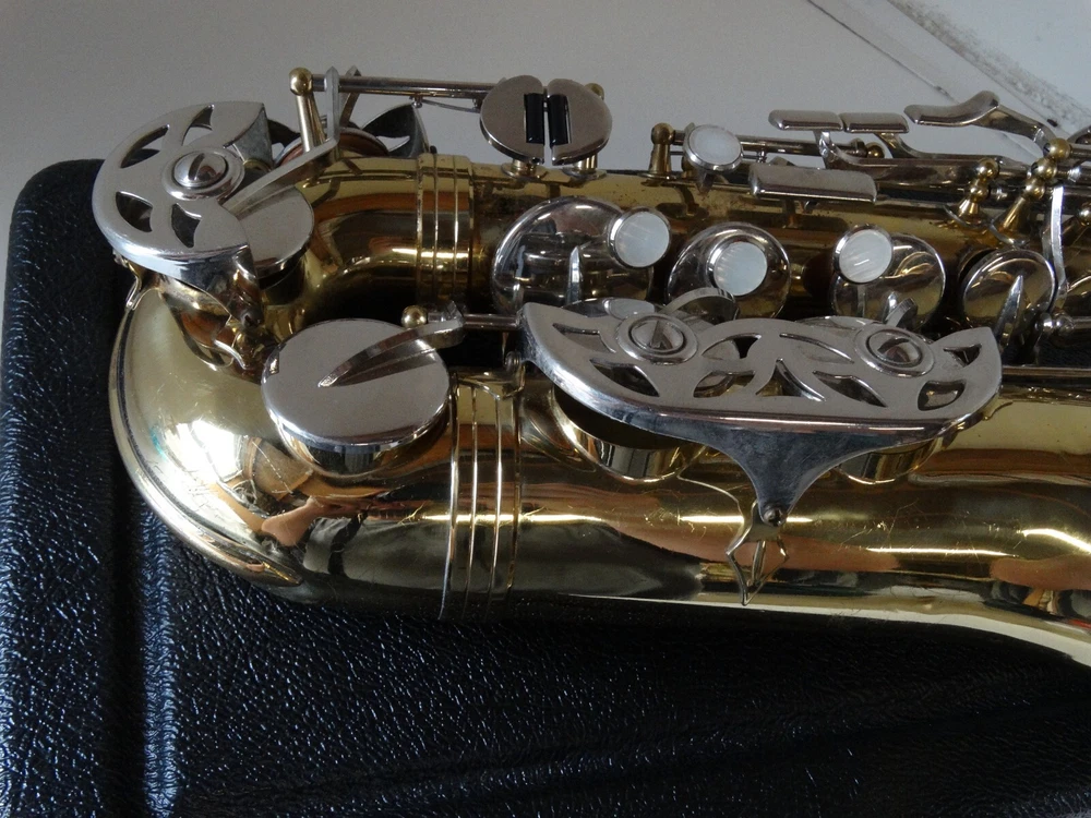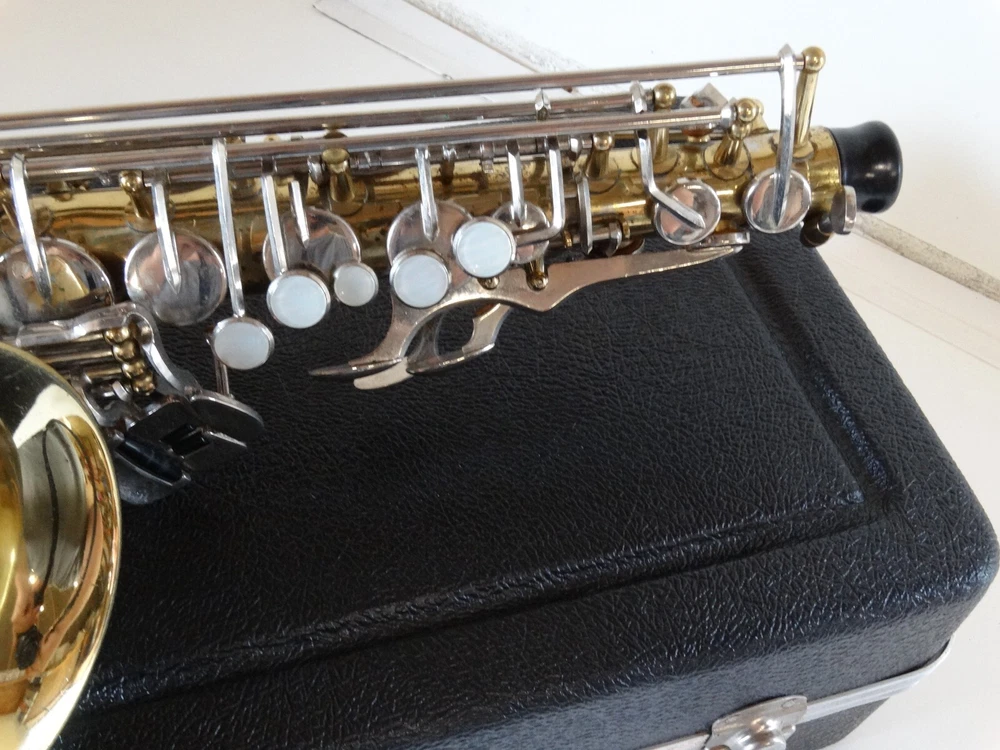 this is as pictured i do not play the sax so it is not tested all the levers seem to move freely and it is in overall nice shape the serial number indicates it is from 1974 there is one hole on the back covered with masking tape not sure what that is about comes with some extra's look at the pictures to see just what is included