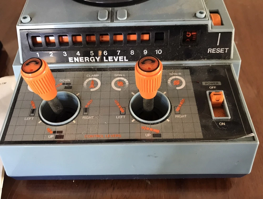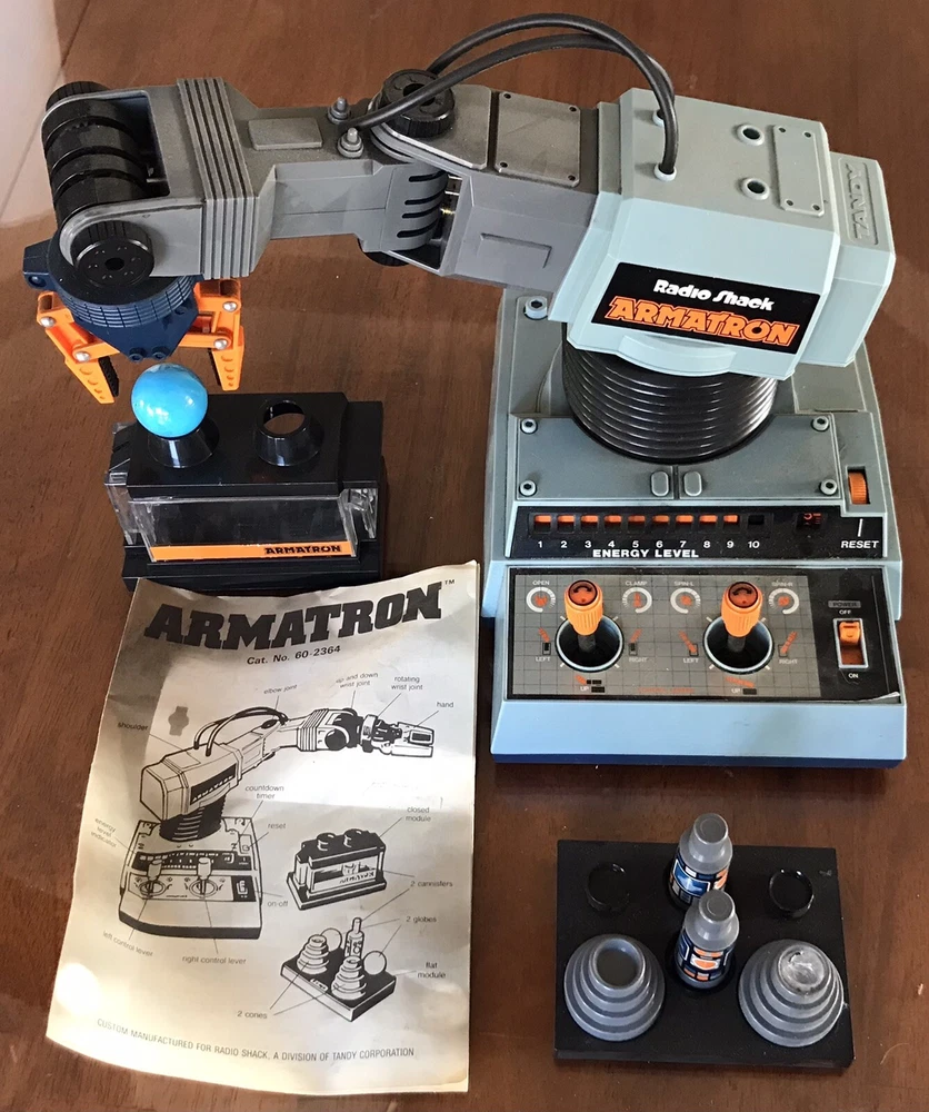 This Armatron has about half of its functions working. When using the other half you can here gears clicking - signs of needing gears replaced. It comes with the accessories shown. Sold as-is for parts repair.