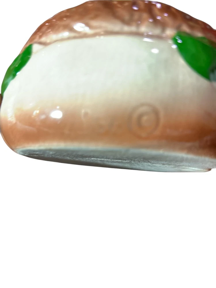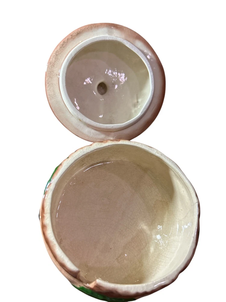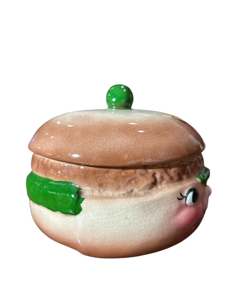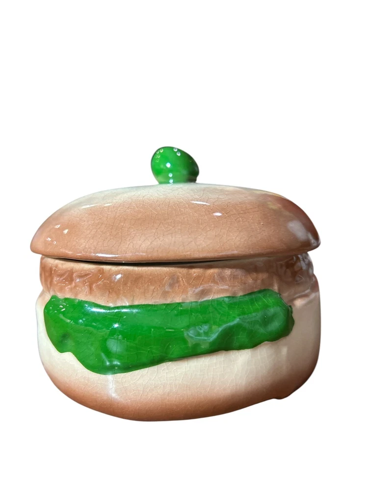This vintage relish container is a unique addition to any kitchen or collection. Hand painted and made of ceramic, this covered dish features a round shape and a brown color with a hamburger pattern. The dish was manufactured in California in the 1950s and has a time period manufactured of 1950-1959. Measuring 3 1/2 inches in height, 4 1/2 inches in width, and 1 3/4 inches in depth, this dish has one compartment and weighs 1lb. The dish is antique and has a vintage look and feel. It is a perfect piece for those who love unique and one-of-a-kind items.
