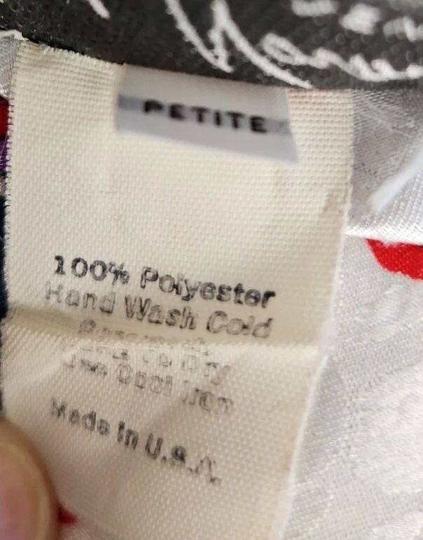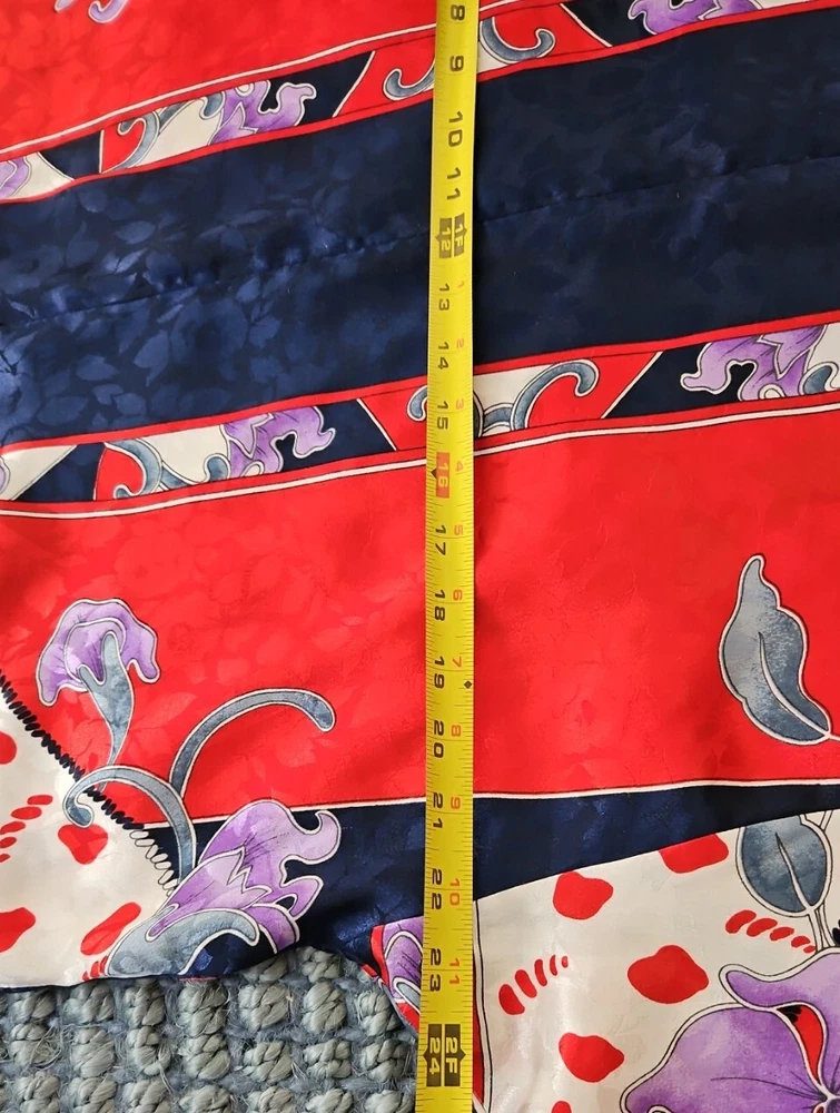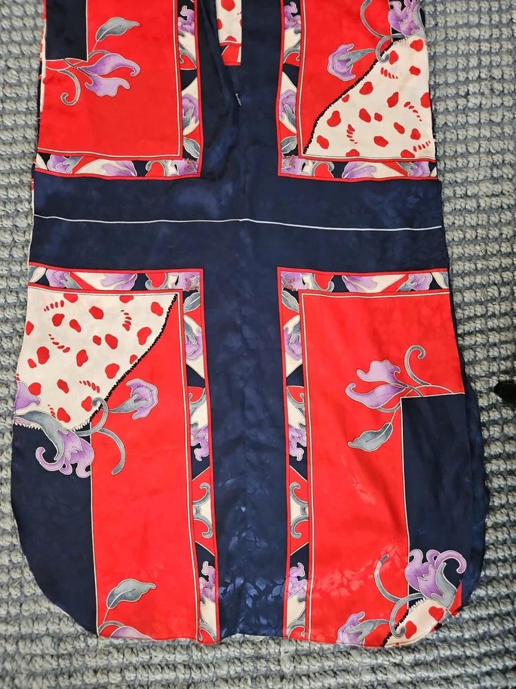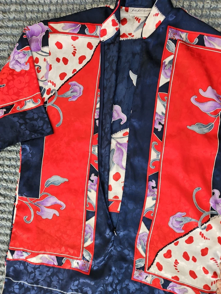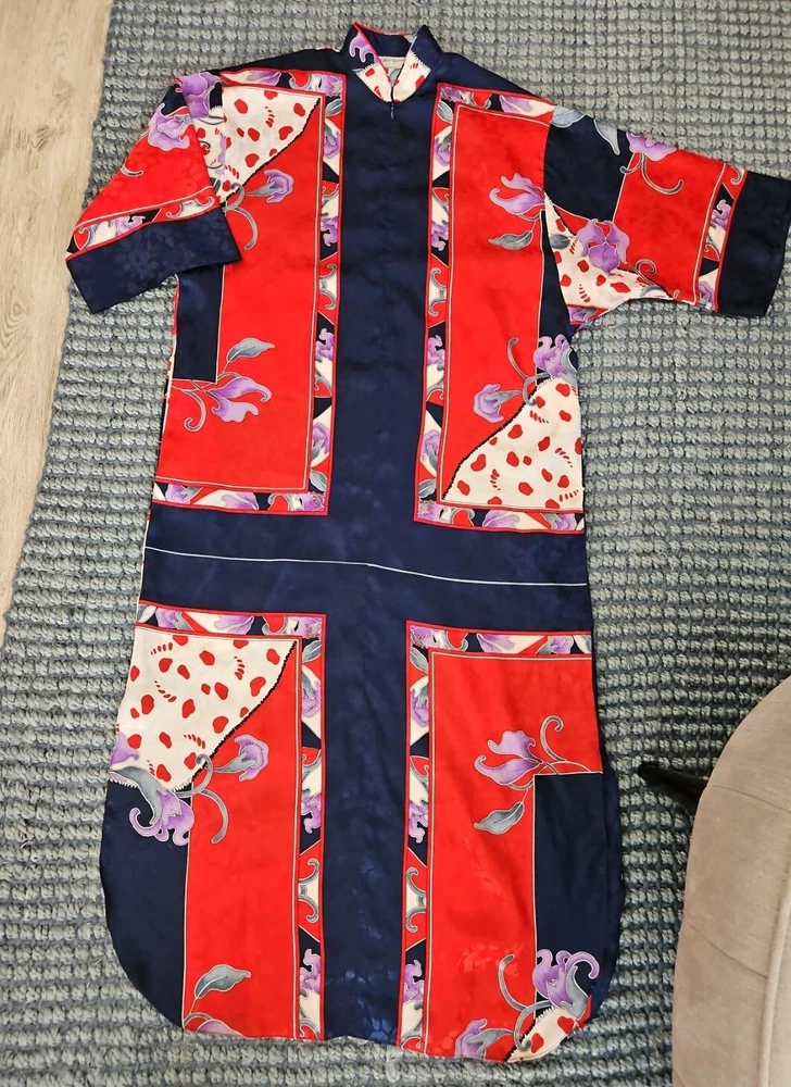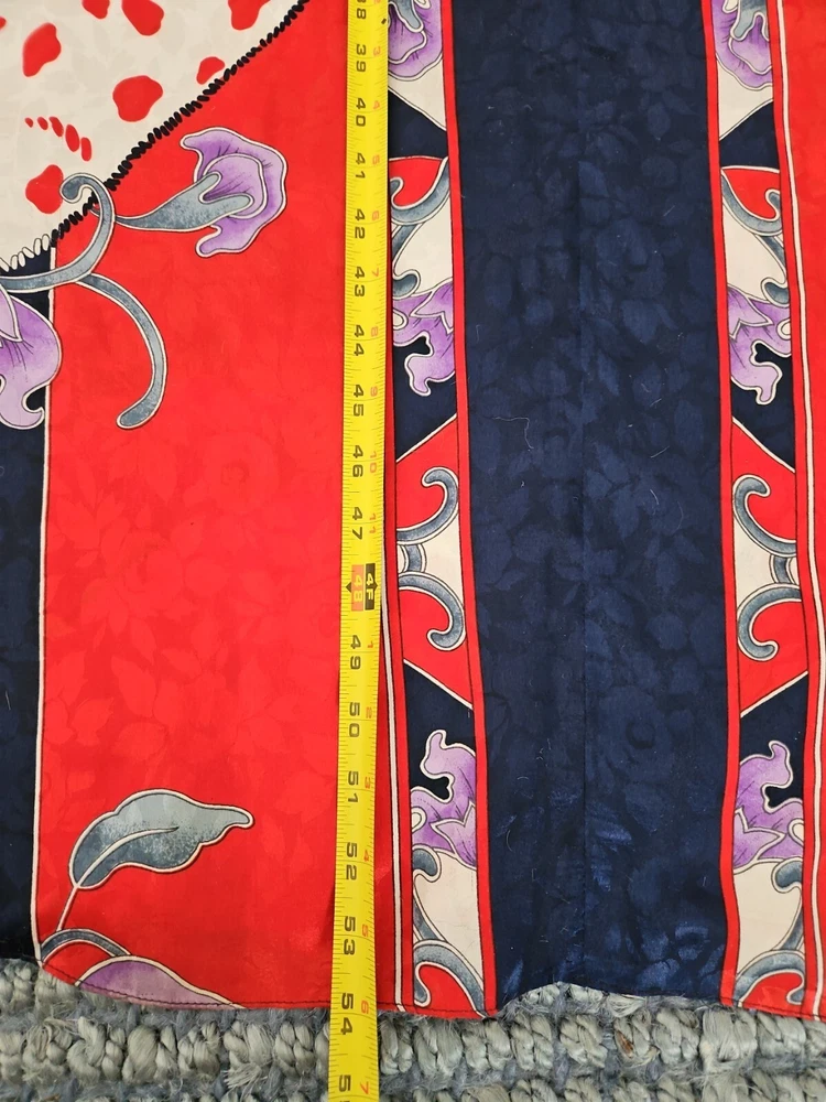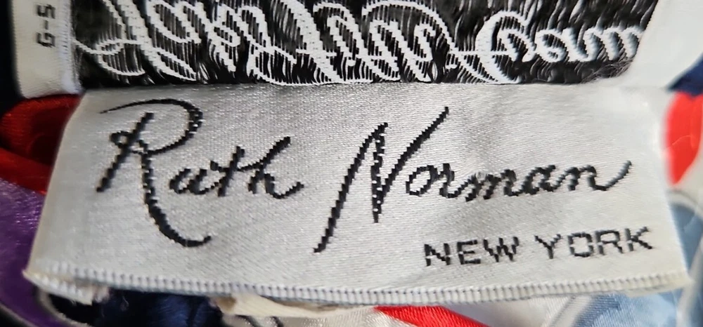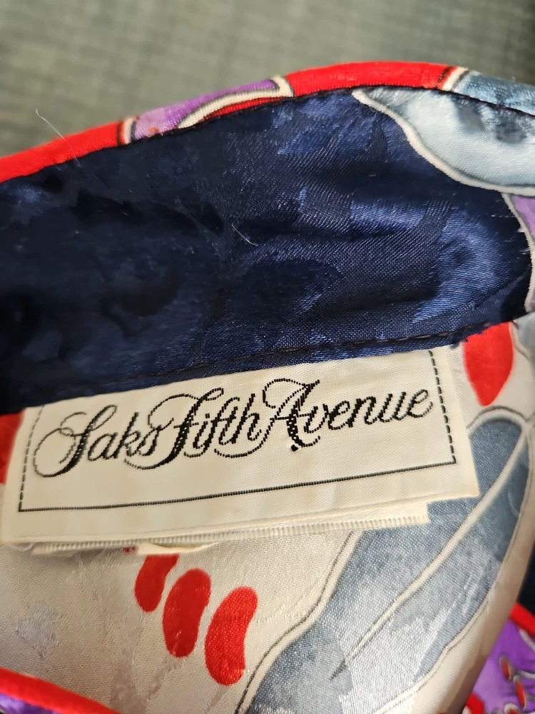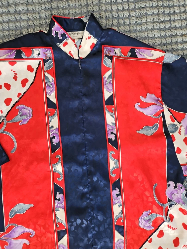 VINTAGE RUTH NORMAN SAKS FIFTH AVENUE CAFTAN MAXI DRESS RED WHITE BLUE PURPLE. Mandarin collar. It says petite on tag. I am size xl and tried it on. It does go on but it is not flowy as it should be. I think M/L, perhaps S if you like things a bit oversized. Front zipper. I think that they also considered this a hostess gown. Pattern is beautiful!
