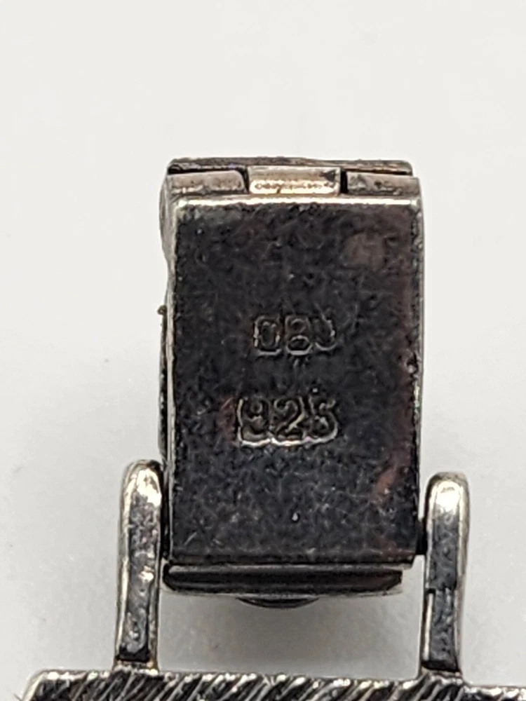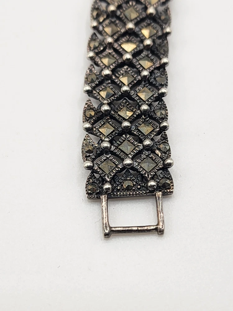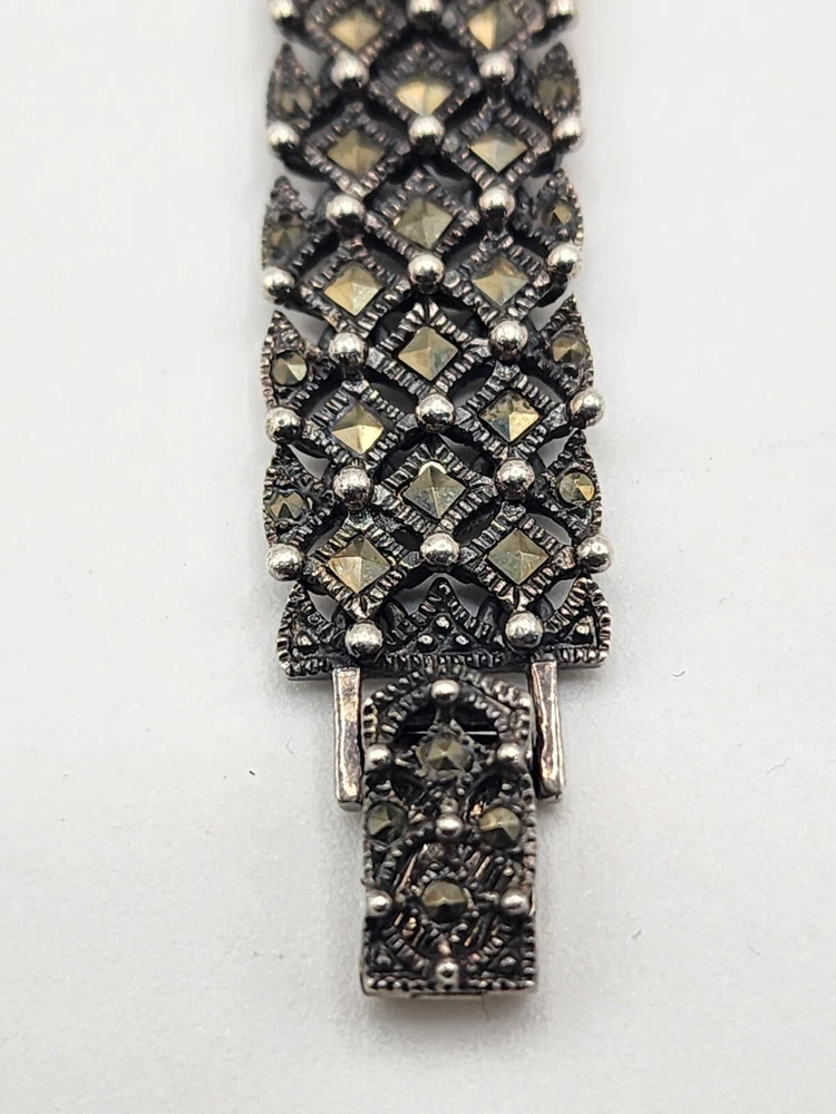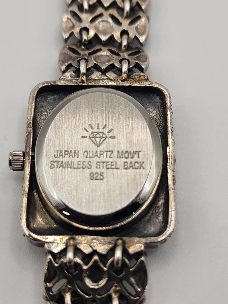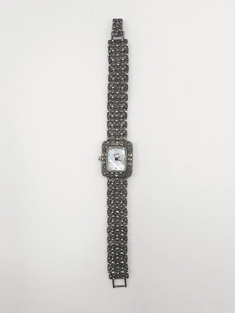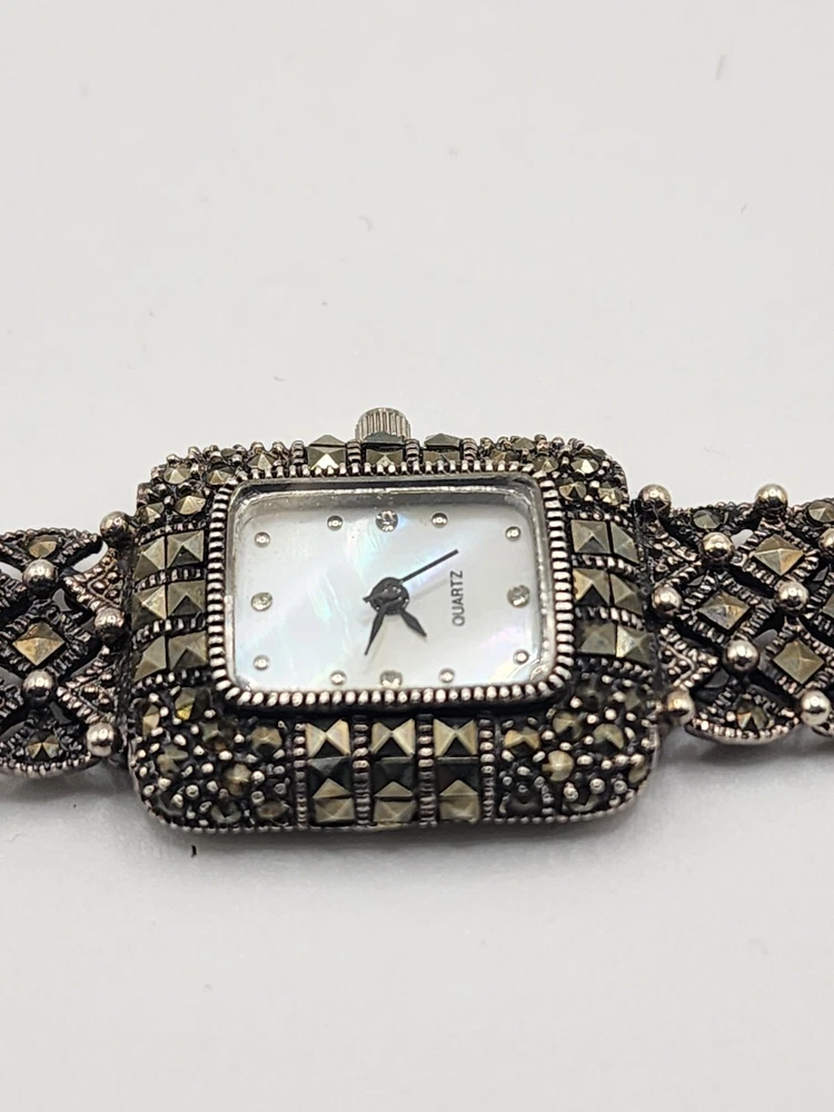 VINTAGE STERLING SILVER SPARKLE MARCASITE STONE MOP LADY FANCY BRACELET WATCH