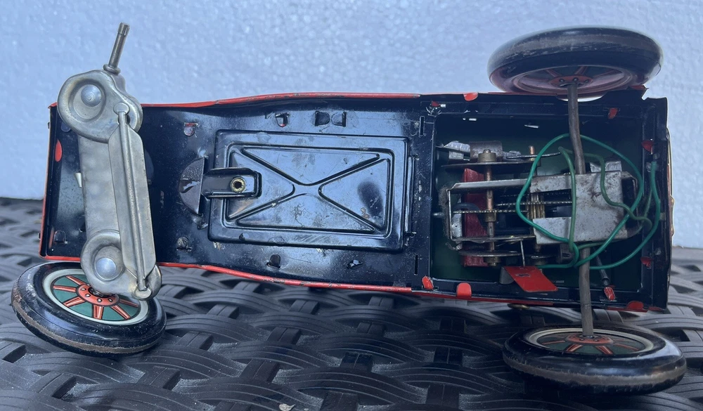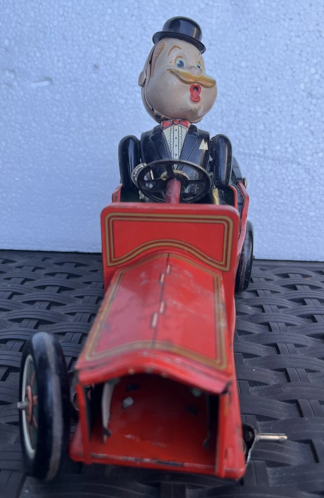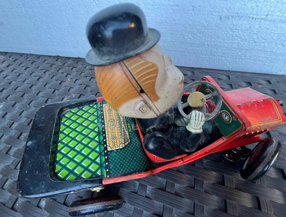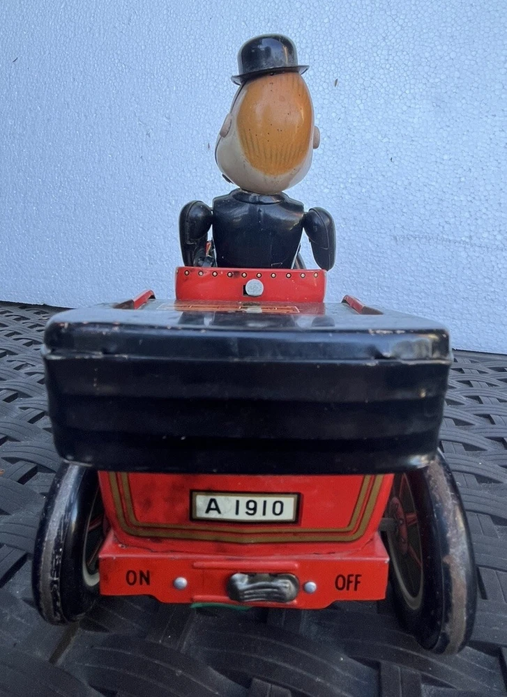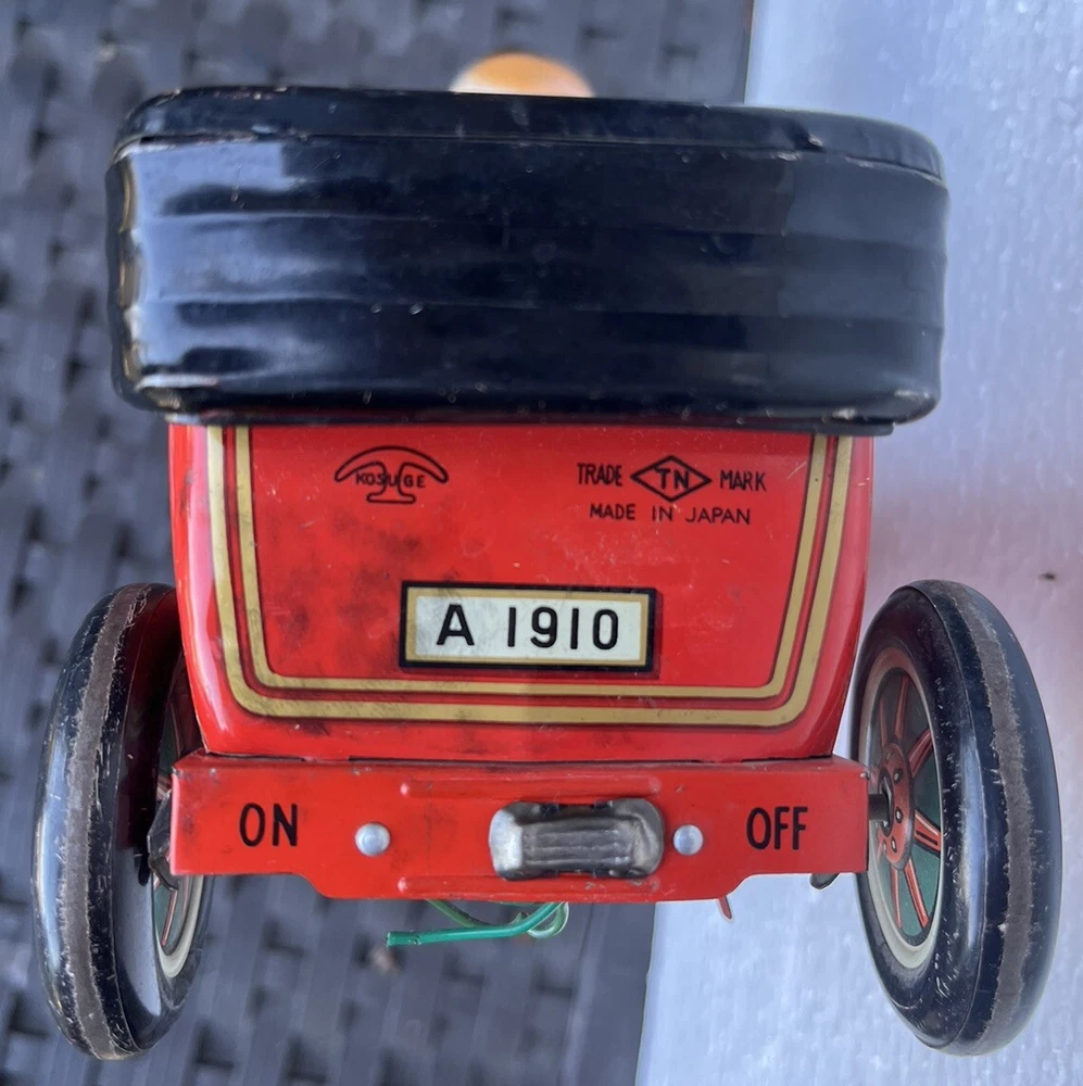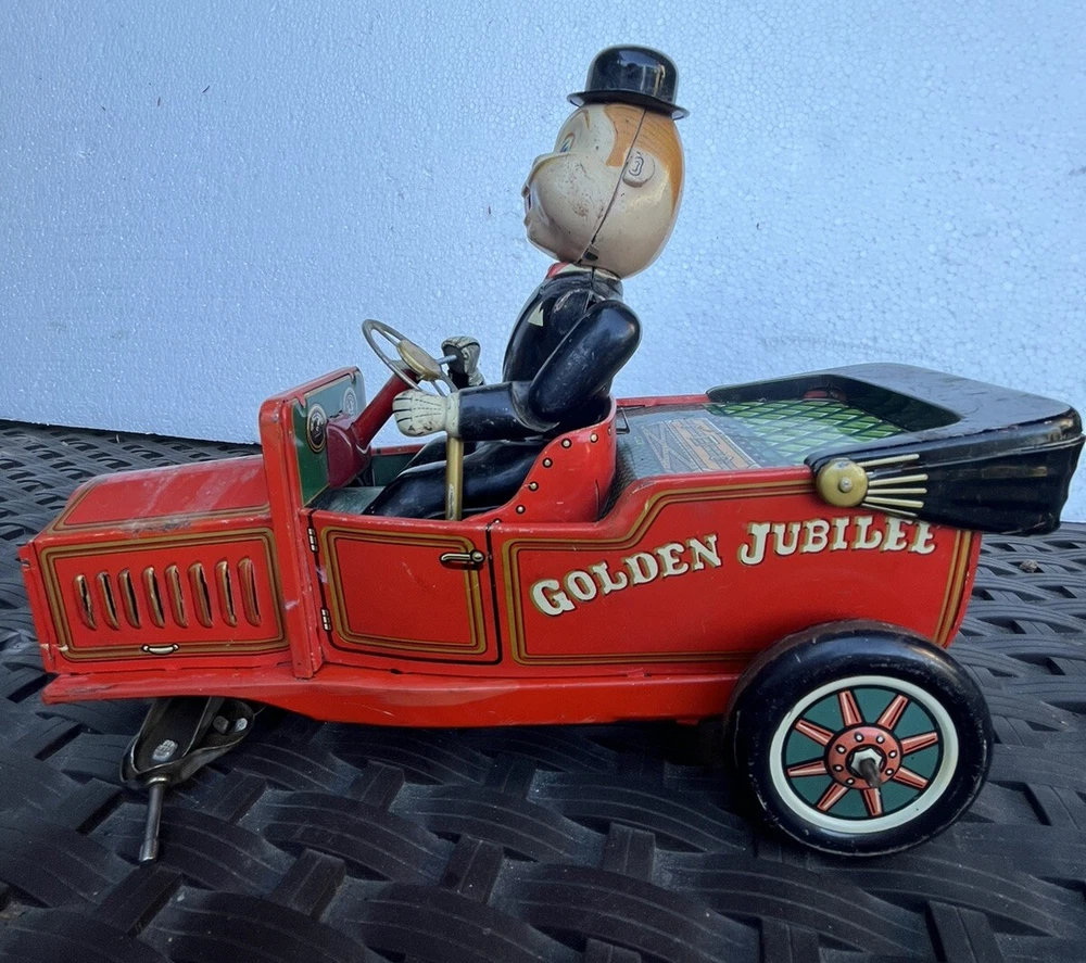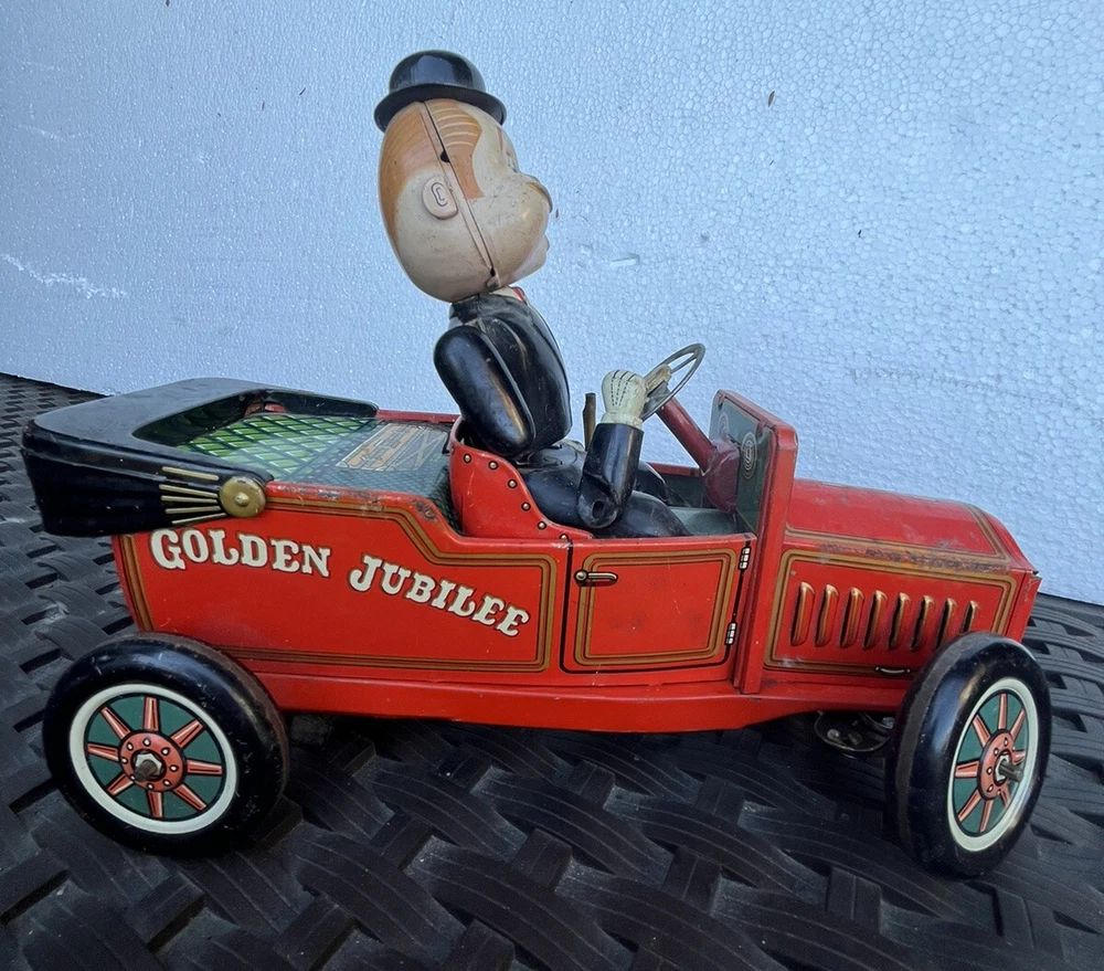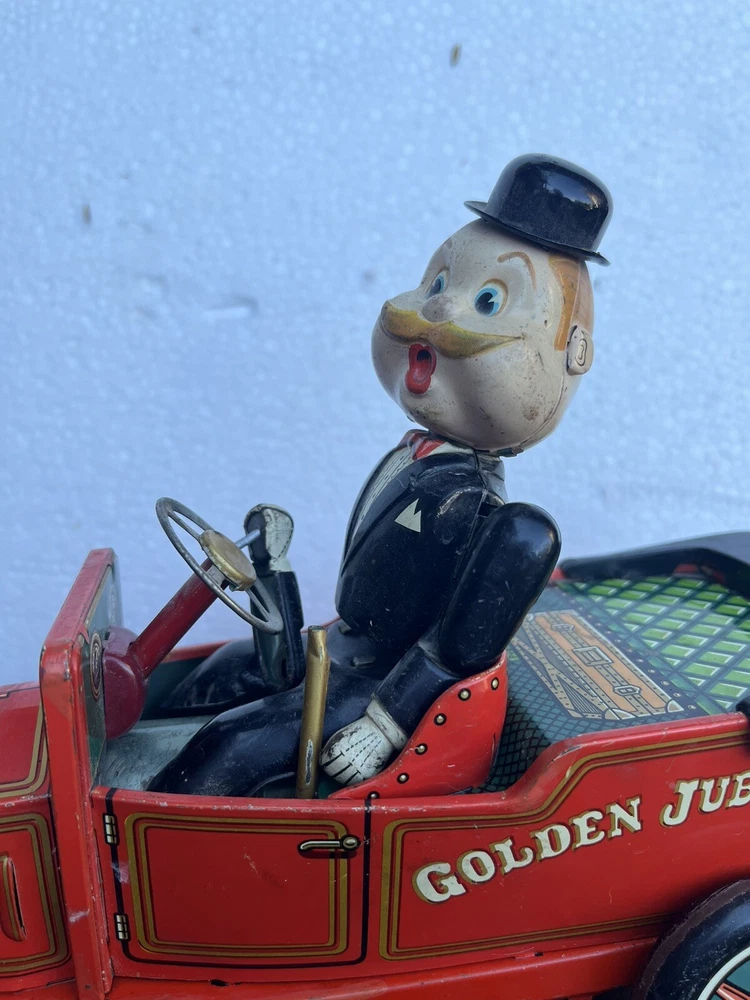 Vintage battery operated tin toy. T.N. of Japan classic shaking 1910 Golden Jubilee red car with Grandpa at the wheel. This is sold as is, it is missing one wheel, and the front grill piece. Part of his left arm needs to be attached together again. See photos for details and condition. Operates with two C batterys. 9" length x 7" height x 4" wide