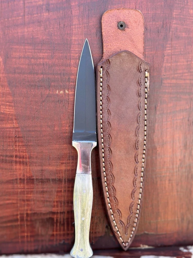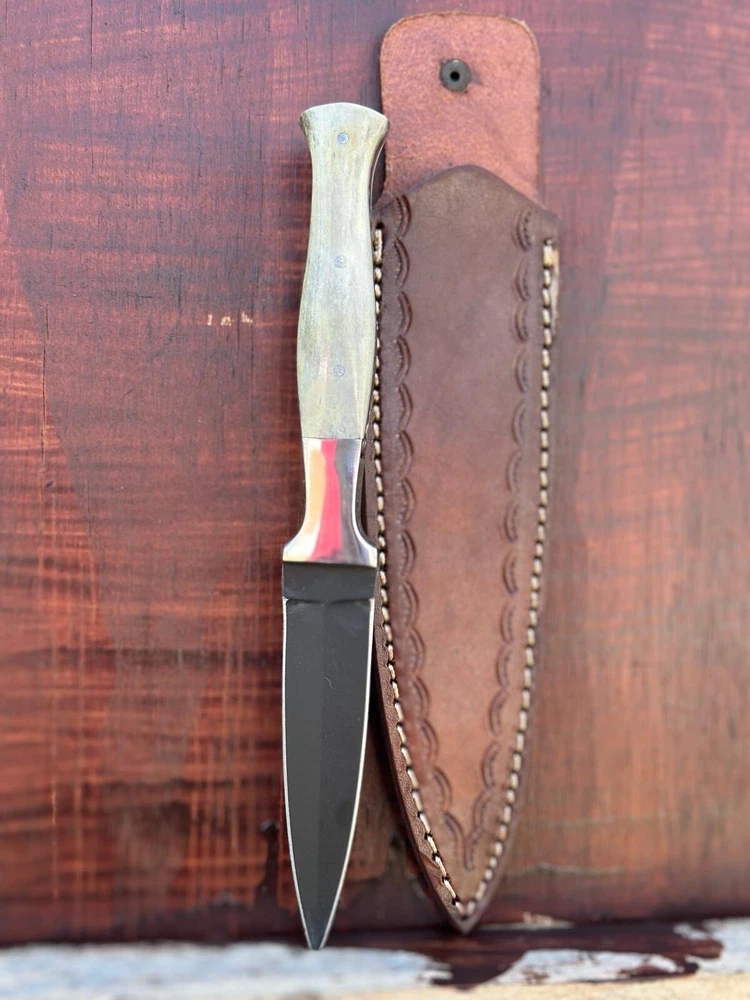 This is a unique and authentic handmade hunting dagger with a double-edged carbon steel blade and a full tang. The dagger knife has a black and gray color scheme and a handle made of camel bone. This boot dagger is designed for throwing and combat, making it a valuable addition to any collection. overall length : 8.5" inch blade 4' inch The blade is sharp and durable, perfect for outdoor activities and hunting. The dagger comes with a sheath for safekeeping and easy carry. This vintage piece is an original and was made in the United States. Grab this rare collectible knife for your collection today!