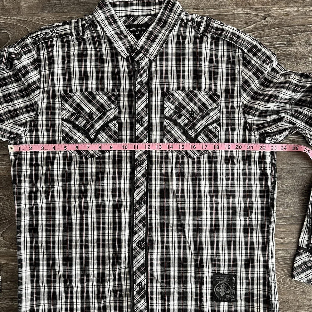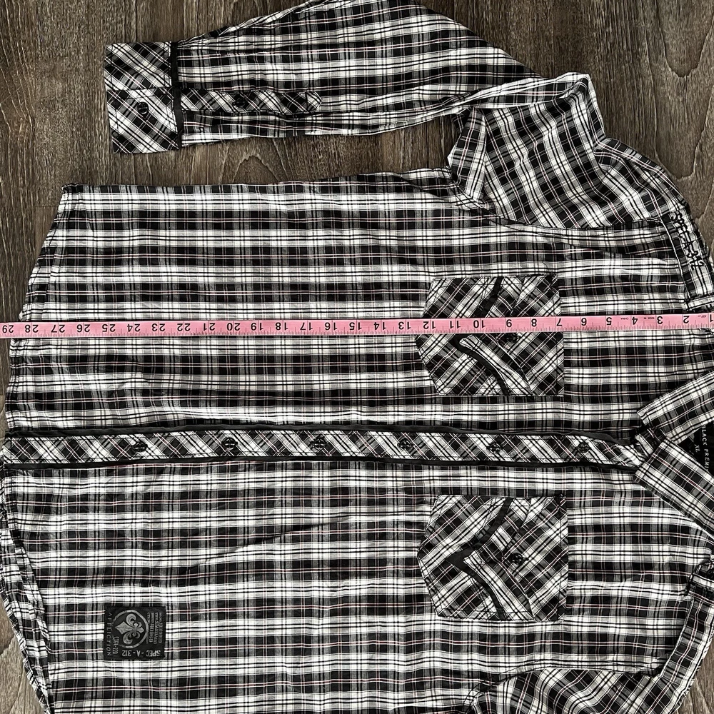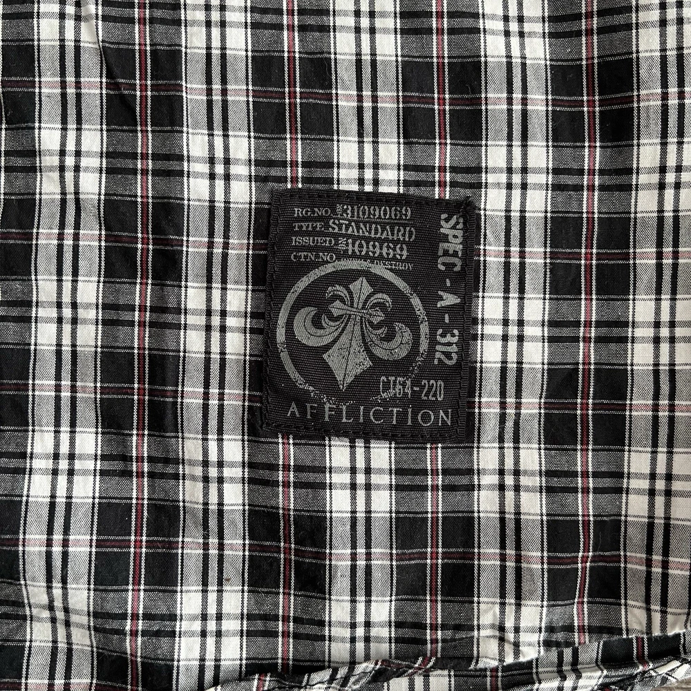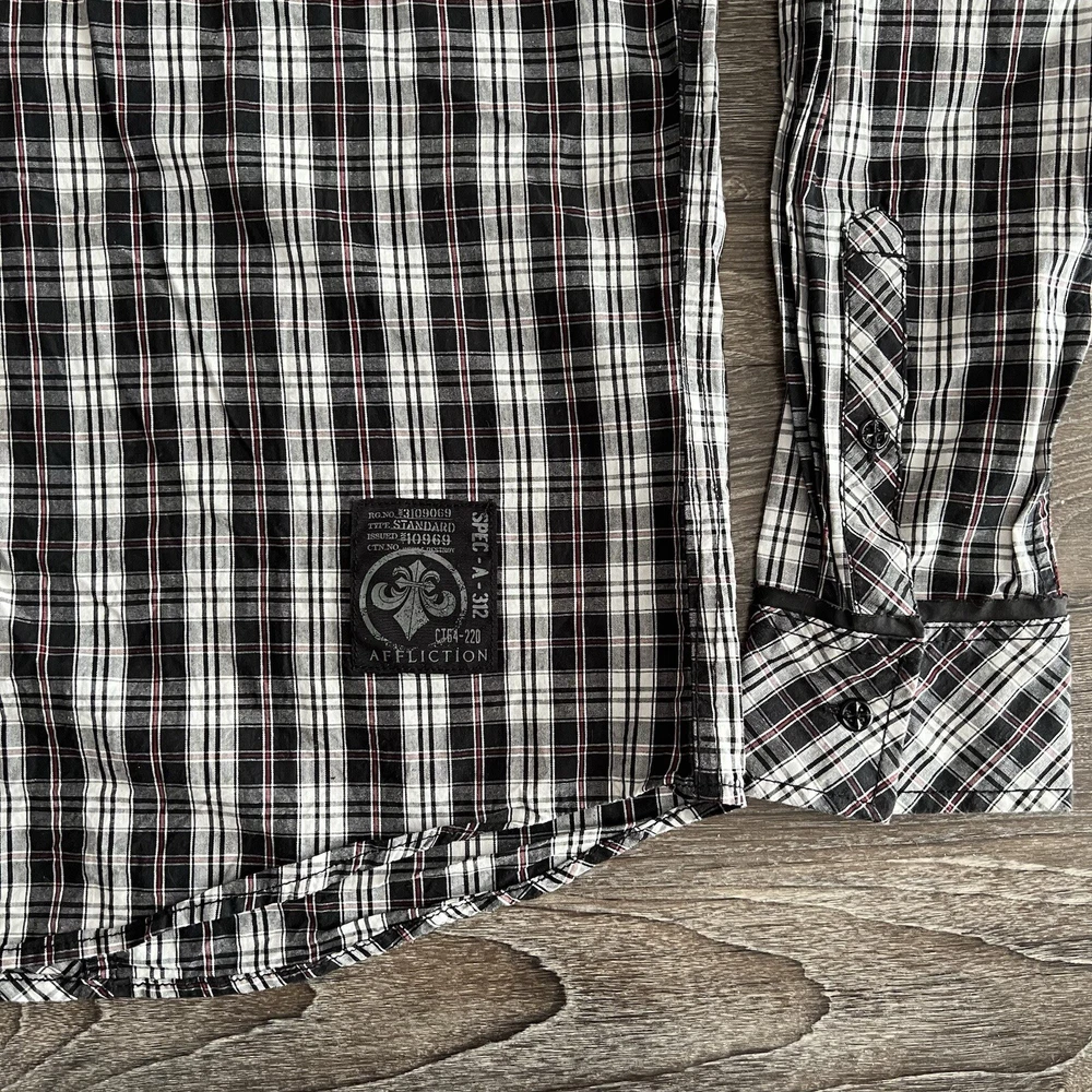 This vintage Affliction Black Premium button-up shirt is a must-have for any fashion-forward man. The collared neckline and long sleeves make it perfect for a variety of occasions, from casual to formal. The classic black and burgundy color and embroidered accents add a touch of edginess to the shirt, while the cotton fabric ensures both comfort and durability. With a chest size of 46 inches and a size of XL, this shirt fits true to size and is machine washable for easy care. The shirt's theme is inspired by motorcycle culture, with elements of Y2K, punk, grunge, and steampunk. This shirt is sure to make a statement and is perfect for any season, whether it's winter, summer, fall, or spring. Add this unique shirt to your wardrobe today! Size: XL Measurements: 23" x 29"