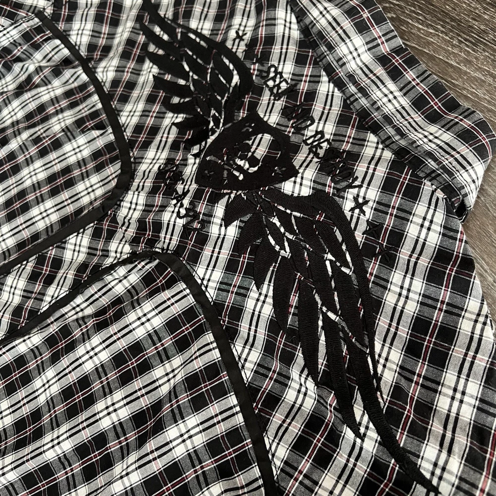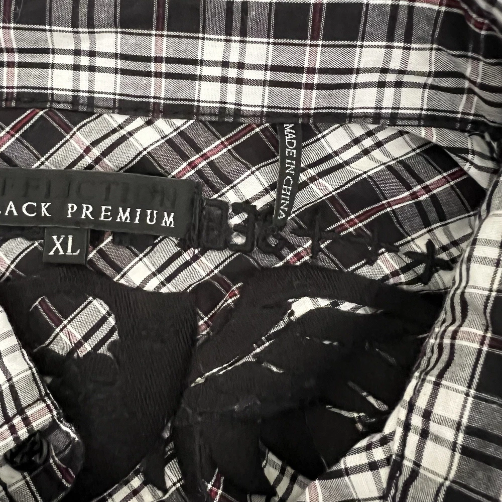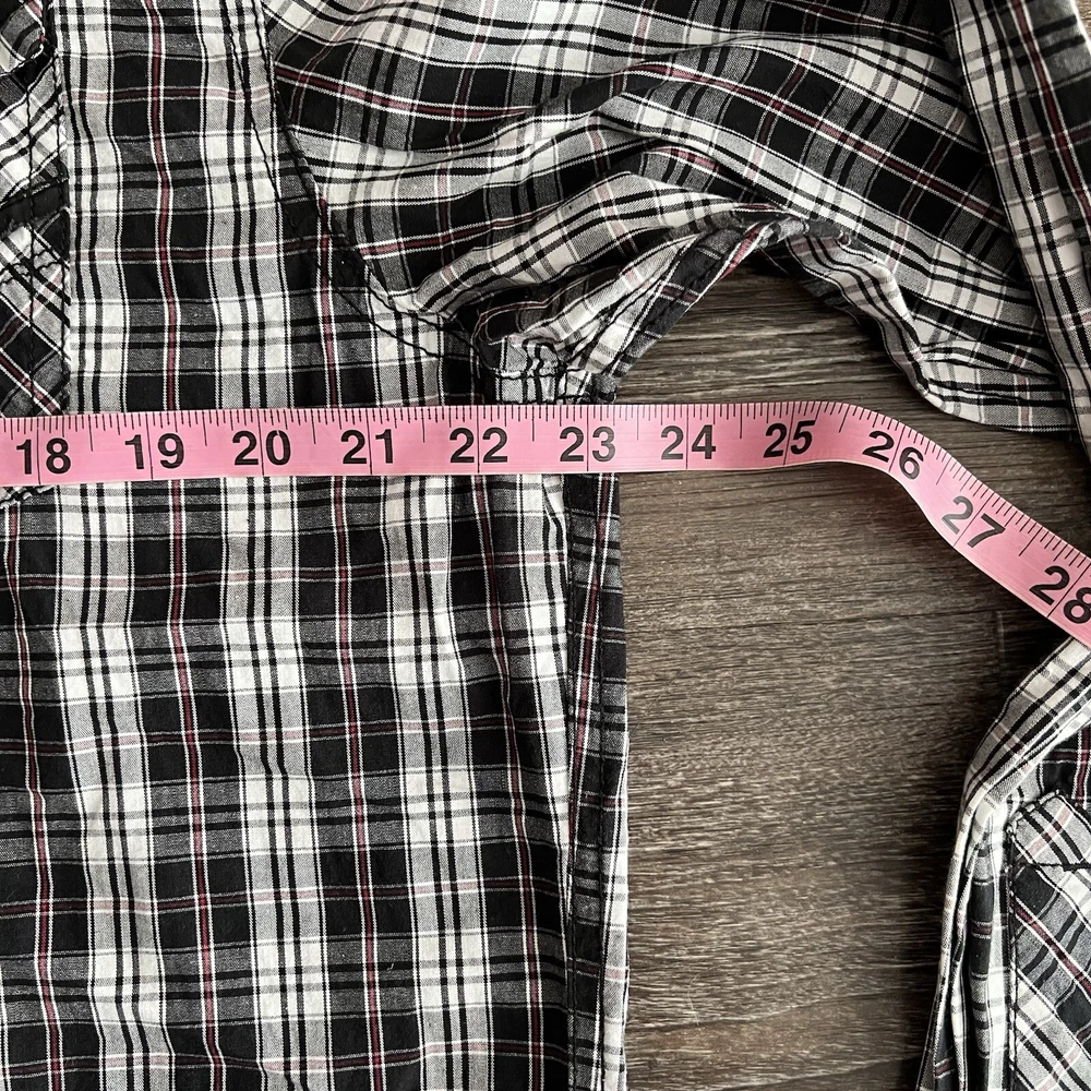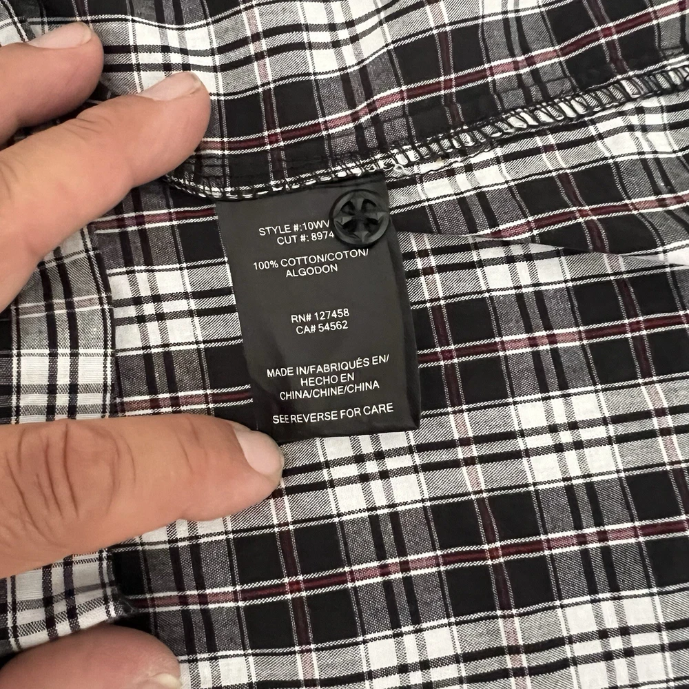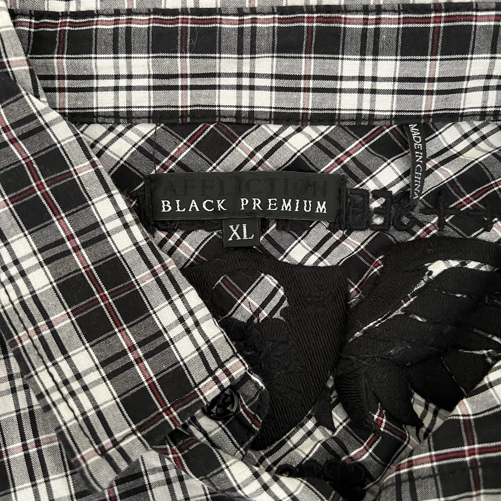 This vintage Affliction Black Premium button-up shirt is a must-have for any fashion-forward man. The collared neckline and long sleeves make it perfect for a variety of occasions, from casual to formal. The classic black and burgundy color and embroidered accents add a touch of edginess to the shirt, while the cotton fabric ensures both comfort and durability. With a chest size of 46 inches and a size of XL, this shirt fits true to size and is machine washable for easy care. The shirt's theme is inspired by motorcycle culture, with elements of Y2K, punk, grunge, and steampunk. This shirt is sure to make a statement and is perfect for any season, whether it's winter, summer, fall, or spring. Add this unique shirt to your wardrobe today! Size: XL Measurements: 23" x 29"