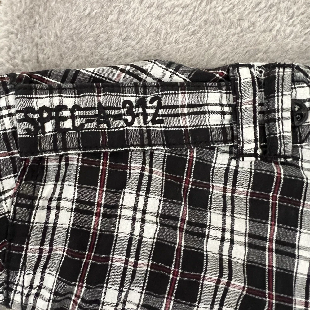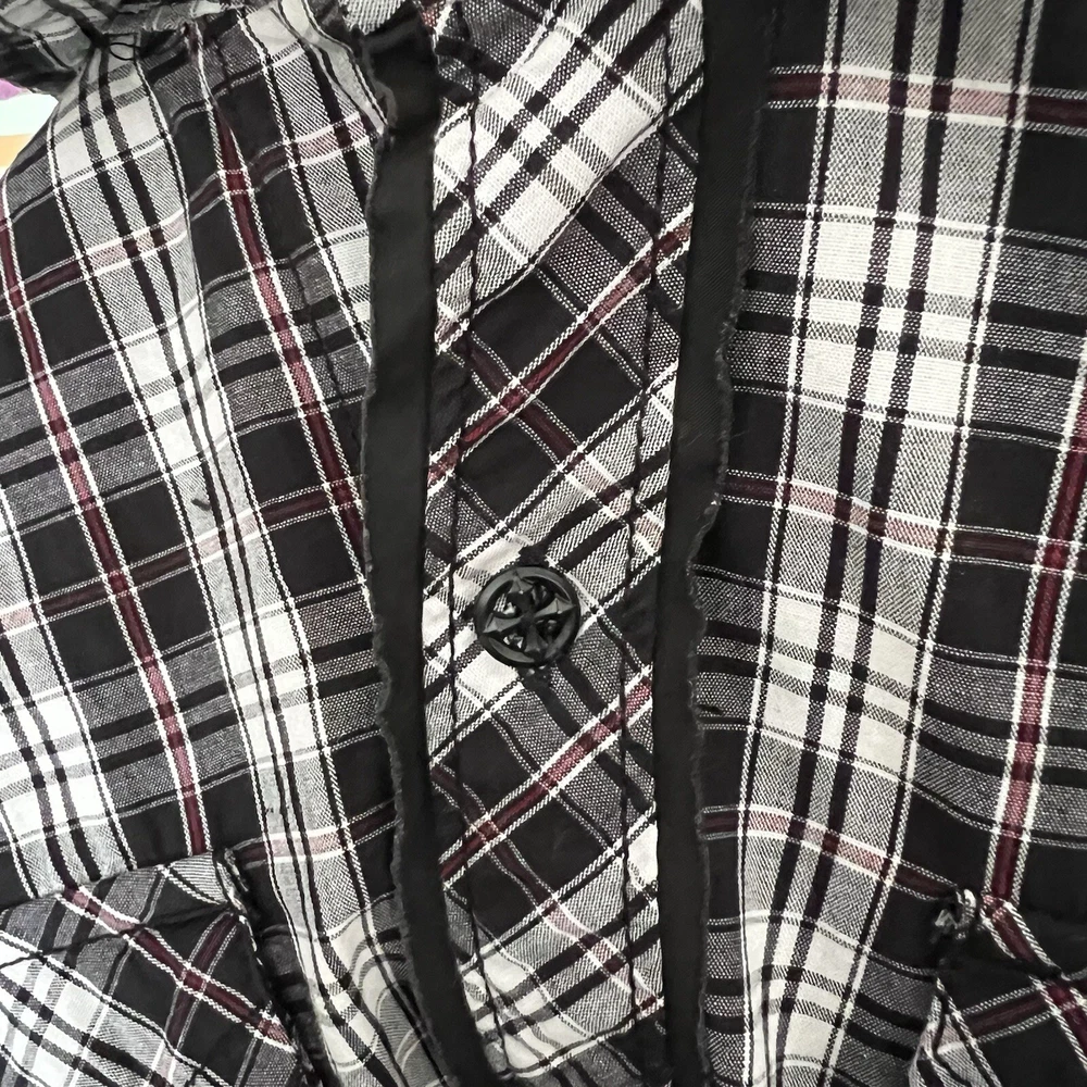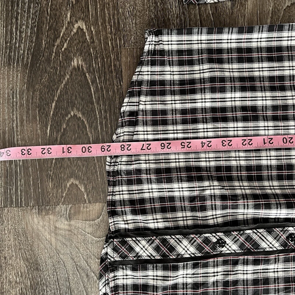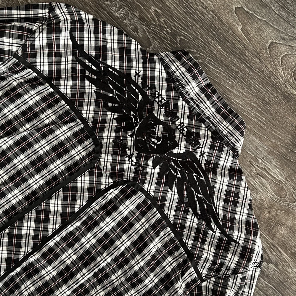 This vintage Affliction Black Premium button-up shirt is a must-have for any fashion-forward man. The collared neckline and long sleeves make it perfect for a variety of occasions, from casual to formal. The classic black and burgundy color and embroidered accents add a touch of edginess to the shirt, while the cotton fabric ensures both comfort and durability. With a chest size of 46 inches and a size of XL, this shirt fits true to size and is machine washable for easy care. The shirt's theme is inspired by motorcycle culture, with elements of Y2K, punk, grunge, and steampunk. This shirt is sure to make a statement and is perfect for any season, whether it's winter, summer, fall, or spring. Add this unique shirt to your wardrobe today! Size: XL Measurements: 23" x 29"