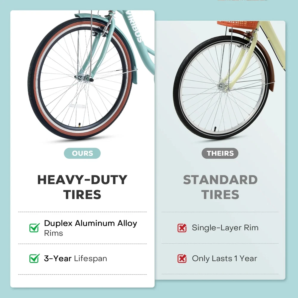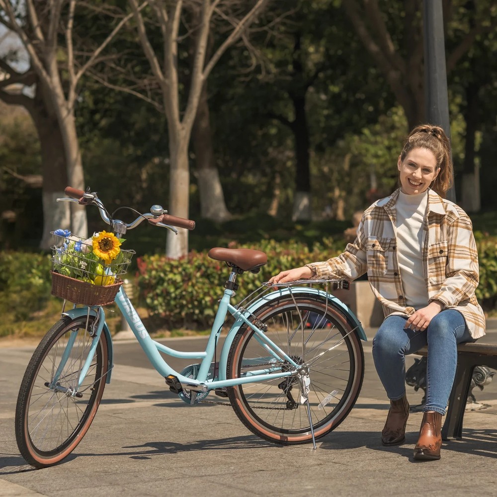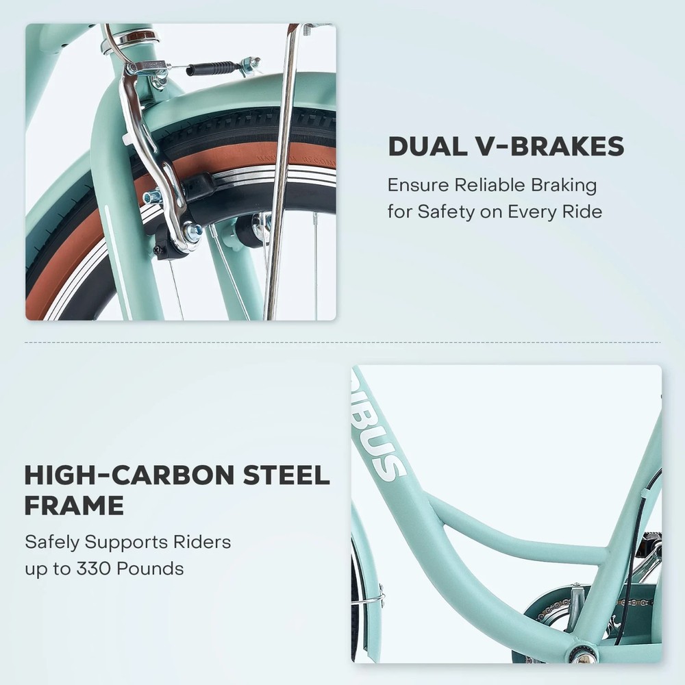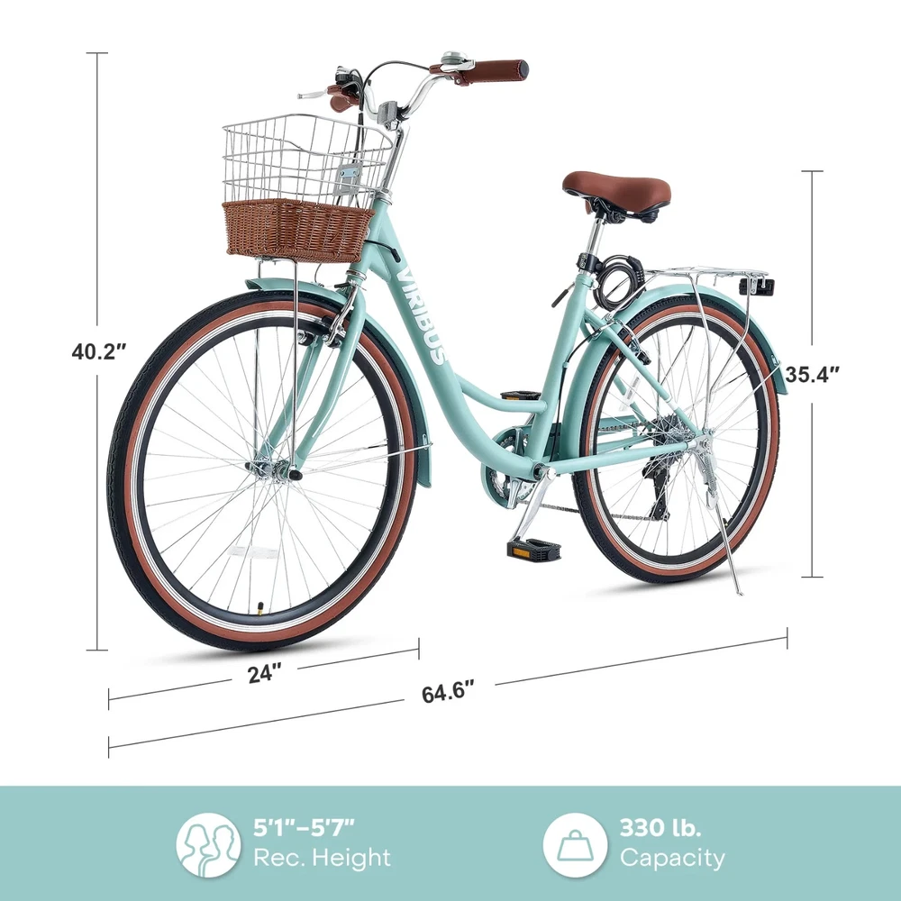 Product details Enjoy a healthier and more sustainable lifestyle with this women’s comfort bike! The design of this cruiser bike draws upon the classic step through bikes, creating a unique take on the everyday beach & city cruiser bike. Effortlessly shift gears with the 7-speed Shimano derailleur and thumb shifters, ensuring a smooth ride on any terrain. With a chic rattan front basket and reinforced rear rack, you can easily carry groceries, essentials, or even your furry friends along for the ride. Crafted from high carbon steel and featuring a low step-through frame, this bike for women is both strong and accessible, supporting riders up to 330 lb. Whether you're commuting to work or exploring new adventures, this women's bicycle ensures you'll arrive in comfort and confidence. Get out There: This women’s bike is the perfect way to travel in style and safety; it has a combination of a retro look inspired by comfort bikes and modern features, making it a unique beach & city cruiser bicycle that stands out from the crowd. Smooth Shifting: Equipped with a 7-speed Shimano derailleur and user-friendly thumb shifters, this cruiser bike ensures smooth and precise gear changes for stable rides on various terrains, from city streets to winding trails. Front & Rear Storage: This women's bicycle features a stylish rattan front basket and a reinforced rear rack, enabling you to effortlessly store groceries, carry essentials, or even bring your furry companions along on your urban escapades. Safe & Cozy Ride: Thanks to its shock-absorbing cushioned saddle, front & rear V brakes, and duplex aluminum rims, this bike for women is designed to provide a secure and wobble-free ride, ideal for extended commutes and adventures. Ideal Match for You: Expertly crafted from high carbon steel and featuring a low step-through frame, this comfort bike is tailored to offer optimal support for riders weighing up to 330 lb. and ranging in height from 5'1" to 5'7". Specifications Material: Carbon Steel, Rubber, Aluminum Alloy Color: Mint Tire Diameter: 24 in. (61 cm) Overall Length: 64.6 in. (164 cm) Handlebar Length: 25.2 in. (64 cm) Seat Height: 35.4 in. (90 cm) Front Basket Dimensions: 12.8 x 9.3 x 8.5 in. (32.5x23.5x21.5 cm) Rec. Rider Height: 5 ft. 1 in. -5 ft. 7 in. (155-175 cm) Weight Capacity: 330 lb. (150 kg) Front Basket Weight Capacity: 11 lb. (5 kg) Rear Rack Weight Capacity: 55 lb. (25 kg) Net Weight: 35.2 lb. (16 kg) Package List 1x Women’s Comfort Bike 1x Front Basket 1x Bike Lock 1x Assembly Instructions Viribus 24" 7-Speed Beach & City Cruiser Bicycle with Basket, Mint Cruise around in superior safety and ease with 7 variable speeds Easily carry groceries, picnic supplies, or pets in the stylish front basket and reinforced rear rack Enjoy a safe and cozy ride with its shockabsorbing saddle and dual V brakes Equipped with a Shimano derailleur and userfriendly thumb shifters for smooth gear changes Optimal support for riders weighing up to 330 lb and ranging in height from 5'1" to 5'7"
