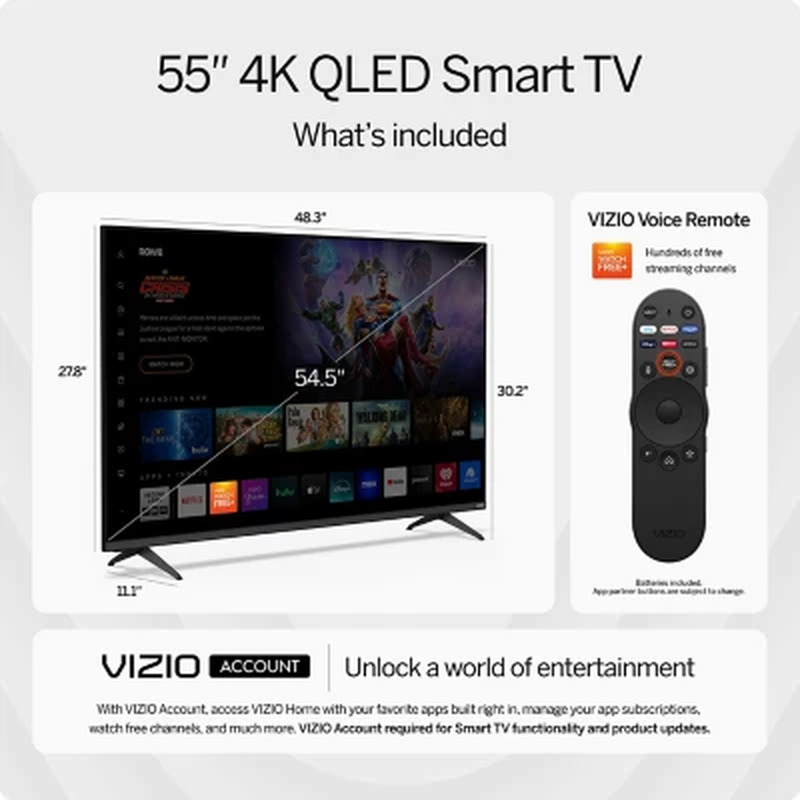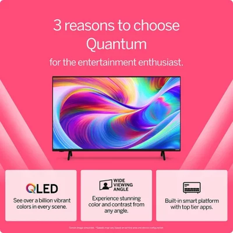 Color Enhancements Next-generation color — Over 1 billion colors bringing you a true to life picture enhanced with QLED Quantum Color. See the world in vivid detail— An exclusive version of Dolby Vision, called Dolby Vision Bright+, combined with HDR10+, HDR10, and HLG, provides a true-to-life picture with a wider range of color and detail in every scene. Picture Quality Enjoy the 4K difference — Step up in picture quality with 4K, delivering four times the resolution than Full HD. Experience immersive entertainment with superior picture. Refresh Rate Experience the action, uninterrupted — Enjoy smoother streaming and gaming with a 60Hz refresh rate for clearer motion and faster picture processing. The gamer’s ideal setup — Experience a superior gaming experience and play the game as developers intended. Connect to your console or PC and unleash the power of up to 120fps at 1080p, as well as access an integrated gaming menu that instantly powers on. Audio Features Cinema-inspired audio — Dolby Audio, DTS:X, coupled with DTS Virtual:X, delivers a cinematic audio experience directly through your TV speakers. Plus, Dolby Atmos pass-through when connected to a compatible soundbar. Paired for perfection — VIZIO Soundbars are made to integrate seamlessly with your VIZIO TV. When paired, an integrated soundbar menu activates to easily adjust soundbar settings. (VIZIO TVs are compatible with all soundbars.) HDR Compatibility Full range of details — Dolby Vision combined with HDR10+, HDR10, and HLG for unparalleled contrast, detail, and nuanced colors. Smart Platform Features Unlock a world of entertainment — With VIZIO Account, access VIZIO Home with apps built right in, manage your app subscriptions, watch free channels, and more. A VIZIO Account is required for Smart TV functionality and product updates. Endless entertainment — Enjoy instant access to the best selection of built-in apps from top tier streaming services and explore new apps as they are automatically added. Stream hundreds of free channels and thousands of titles On Demand with the built-in WatchFree+ app. We get better with age — Supported VIZIO TVs can automatically update through WiFi with the latest apps, free channels, new features, and more. Smart home ready — Share content directly from your Apple or Android devices directly to the TV with Apple AirPlay 2 and Chromecast. Also integrate seamlessly with Apple Home, Google Assistant, and Amazon Alexa-enabled devices. Connectivity Faster performance — WiFi 6 supports better streaming and gaming performance in a connected Smart Home when compared to WiFi 4/5. Bluetooth listening — Pair your Bluetooth headphones for uninterrupted listening, whether streaming your favorite show, playing a podcast, or blasting your top tunes. Warranty Information As a token of our commitment to your satisfaction and to underscore the confidence we have in the quality of our products, we are pleased to provide a 3-Year manufacture warranty, a special benefit available to our valued members. For commercial use, a 90-day warranty is provided from the date of original purchase.This warranty is included with your purchase, demonstrating our dedication to you and our faith in our product's longevity and performance. Enjoy complimentary Apple Service Trials with this purchase. Redemption instructions will be emailed post purchase. Terms apply.