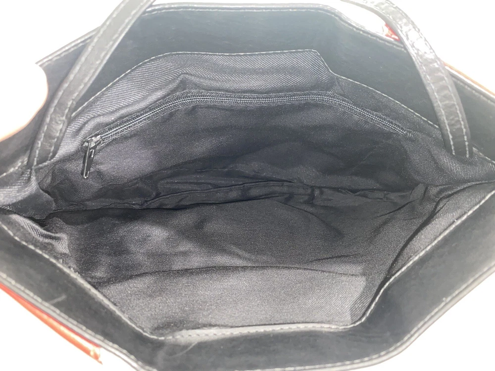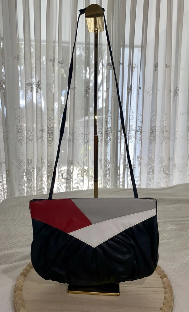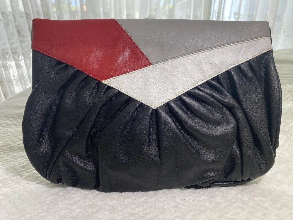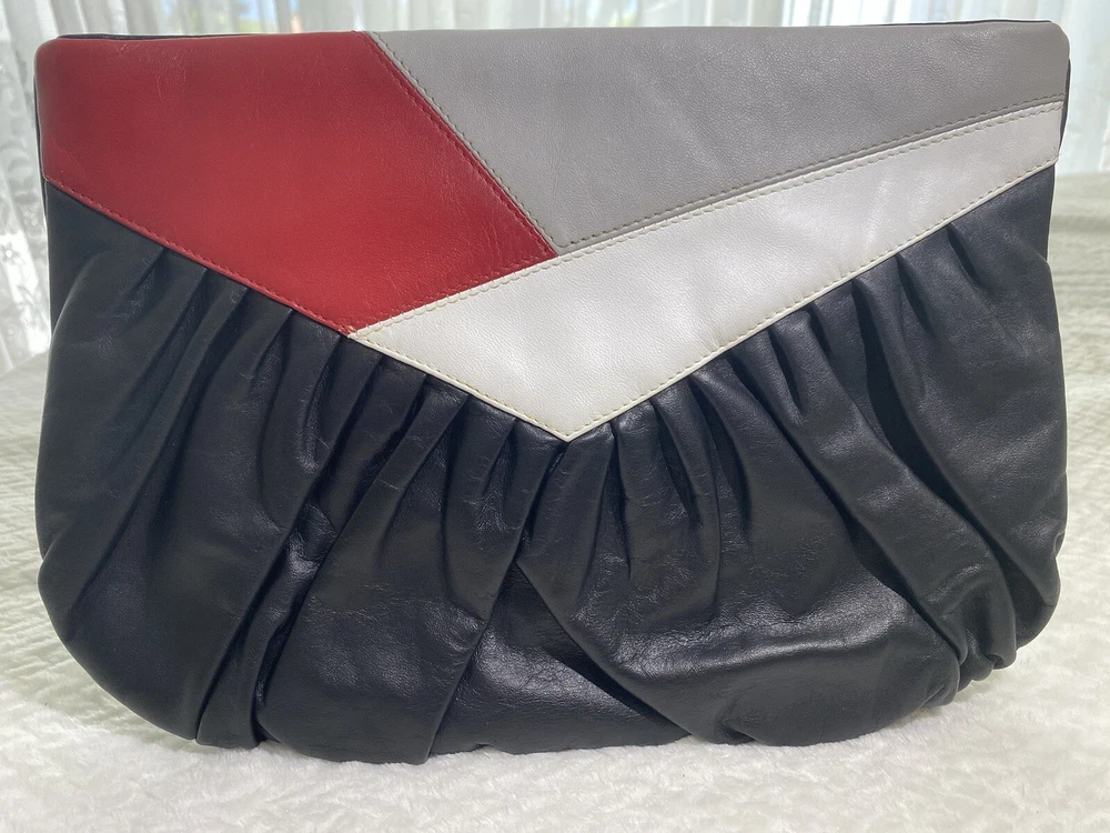 This item is unbranded. It is a vintage, multi-color clutch and shoulder bag in black, white, gray & red leather. Features a skinny shoulder strap and a hinge closure. Inside is lined in a black fabric, and it has 1 zippered compartment. Height: 8=7.875 in Width: 11.75 in Depth: 0.5 in Strap drop: Altered shorter to 16 in (by original owner) All measurements are approximated to the best of the ability by The Seller. Please view all photos, as they are part of the listing's description of the item. Vintage. Pre-owned but in great condition. The only show of wear is evident in the original owner altering the length of the shoulder strap a couple of inches shorter. No other flaws observed. From a smoke-free / pet free home. No odor. Clean inside and out. See all photos. DISCLAIMER: All photos provided do not use filters with any intent to alter or improve the appearance or condition of the item. All items are inspected carefully & flaws are photographed & presented as transparently as possible. If you have any further questions pertaining to the description of this item, please contact The Seller BEFORE purchasing or placing an offer.