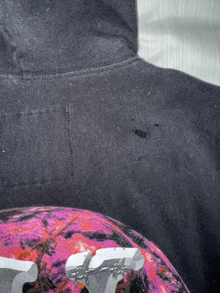Has a few holes on the back but the graphics are in very nice shape this is a rare hoodie and the quality on these were pretty nice compared to the others. Message me if you have any questions